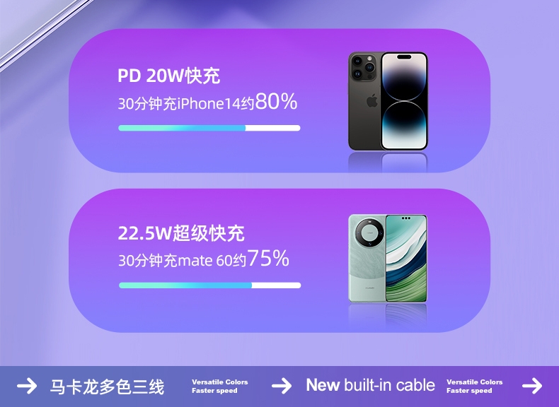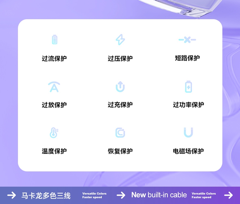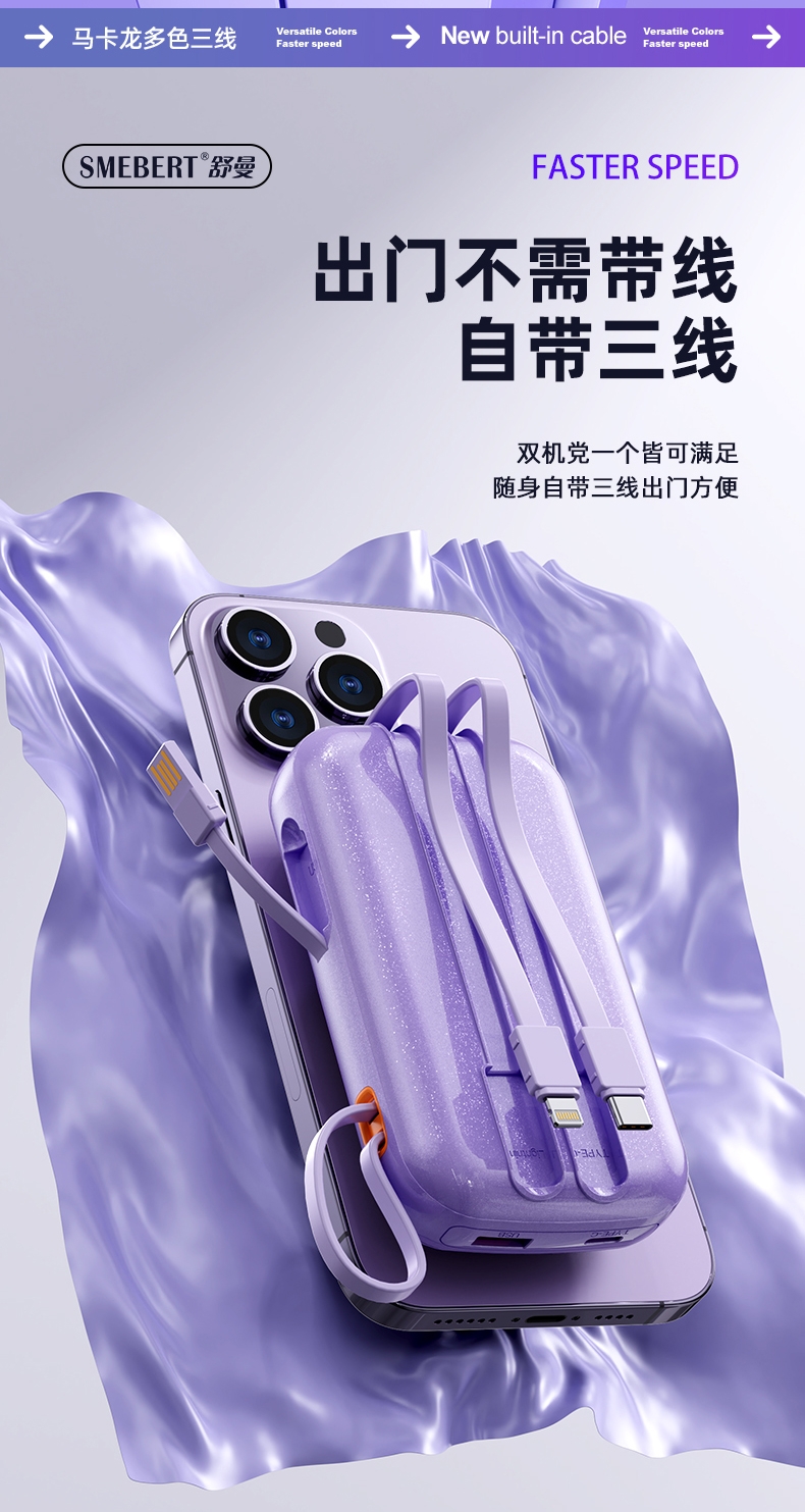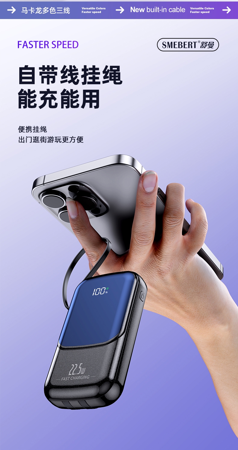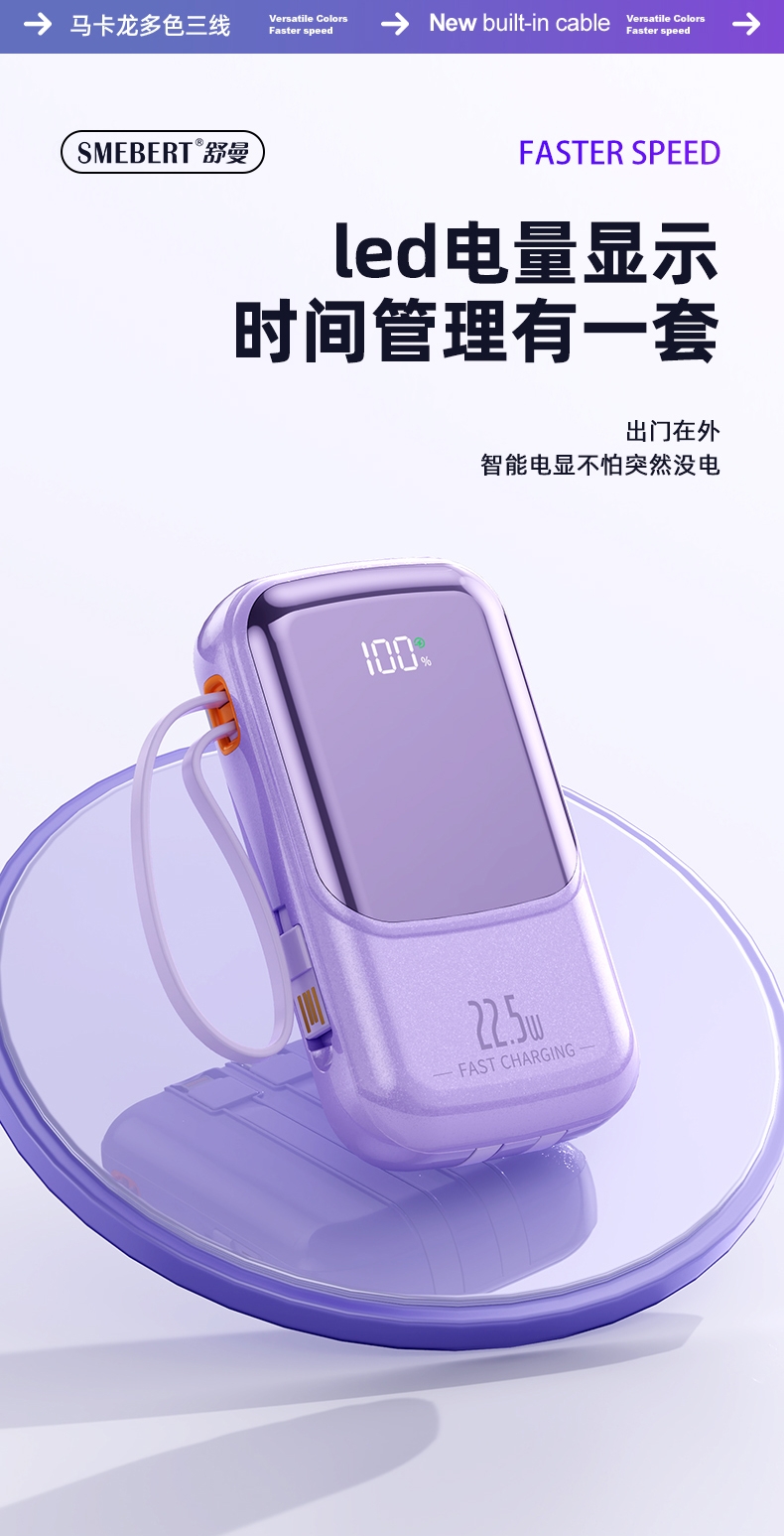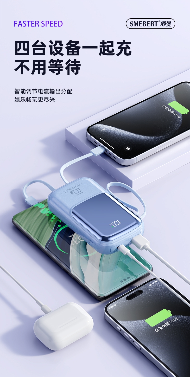 自带Type-c快充线;LED电量显示;多设备可同时充电手掌大小