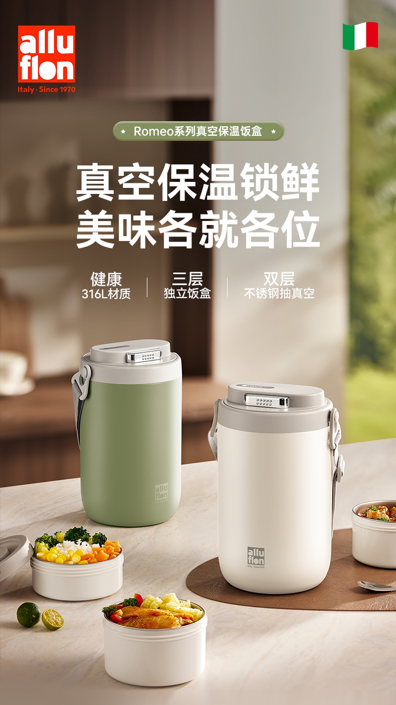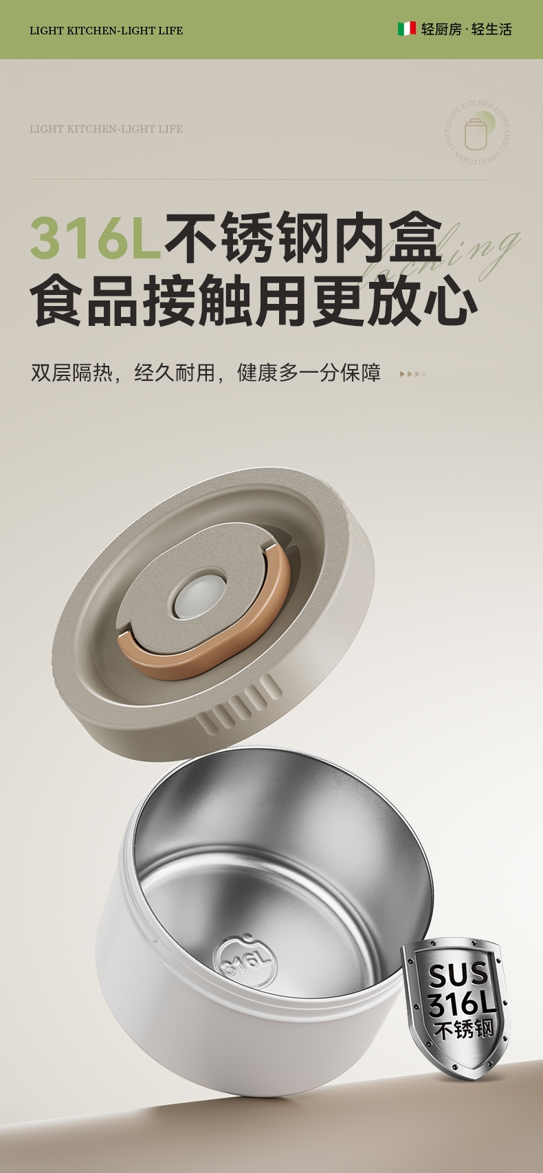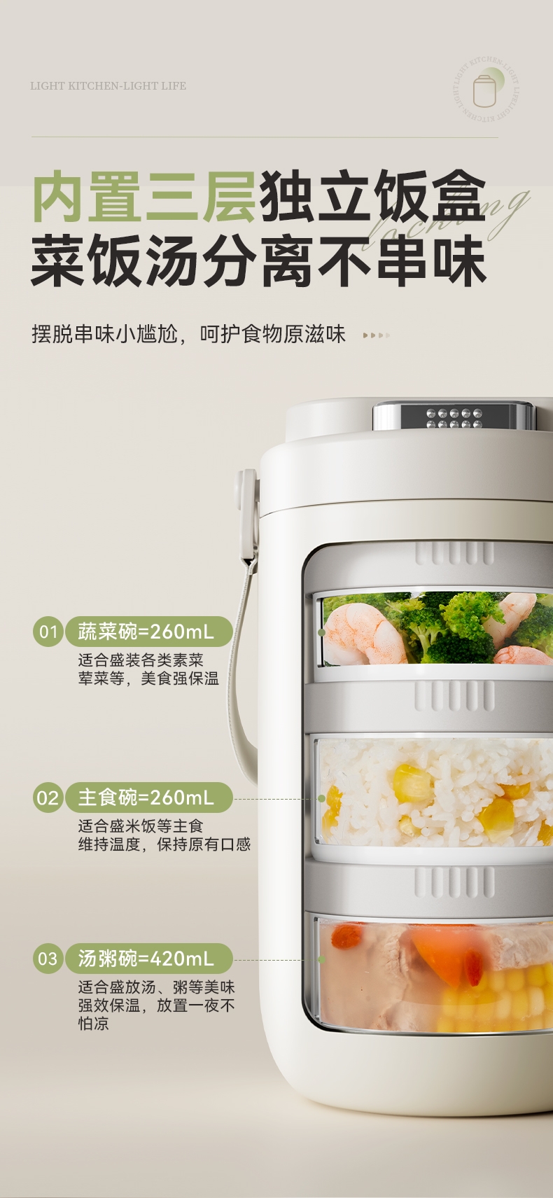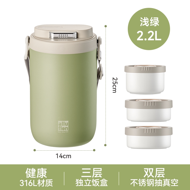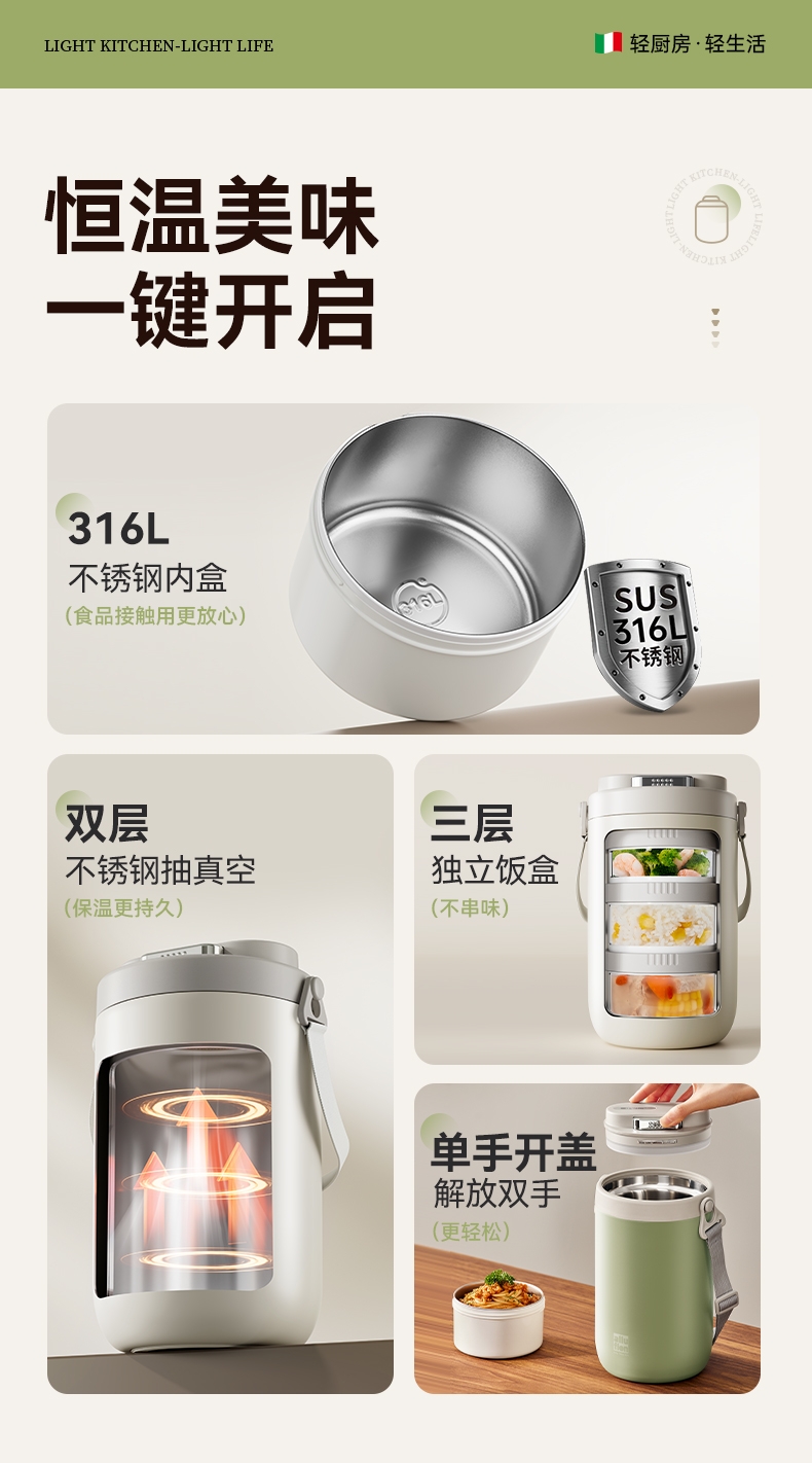 健康316L材质;三层独立饭盒,双层不锈钢抽真空;内置硅胶密封圈,倒置防漏