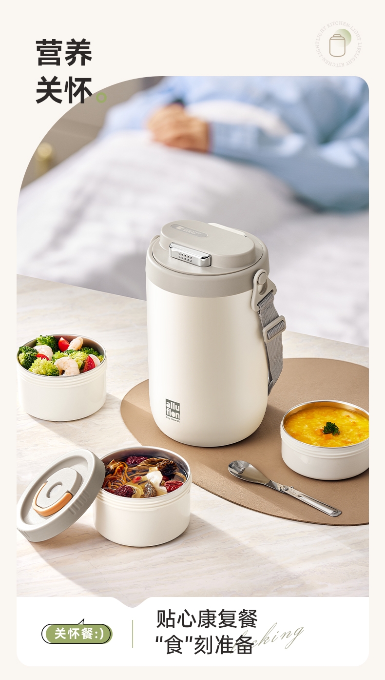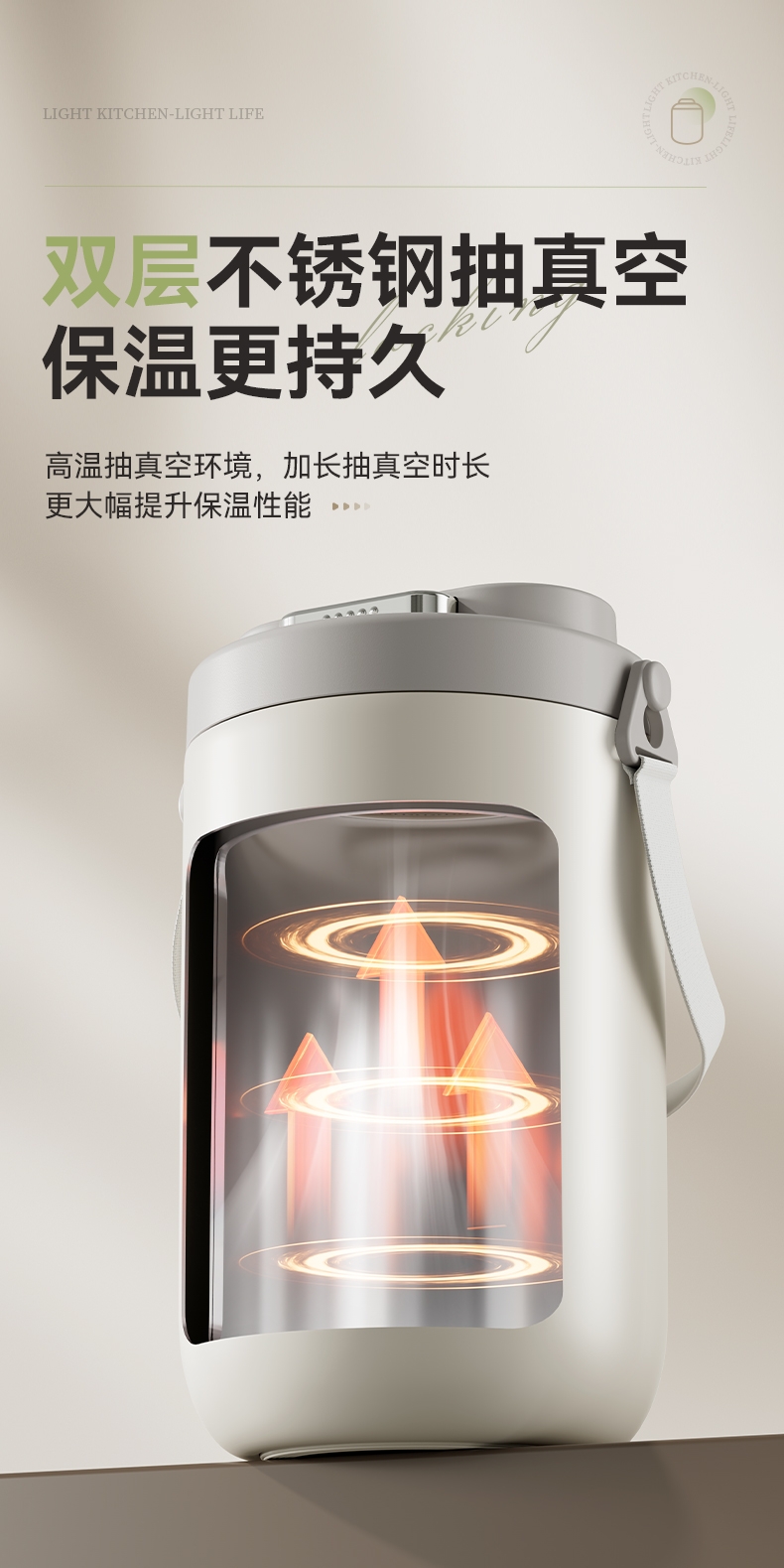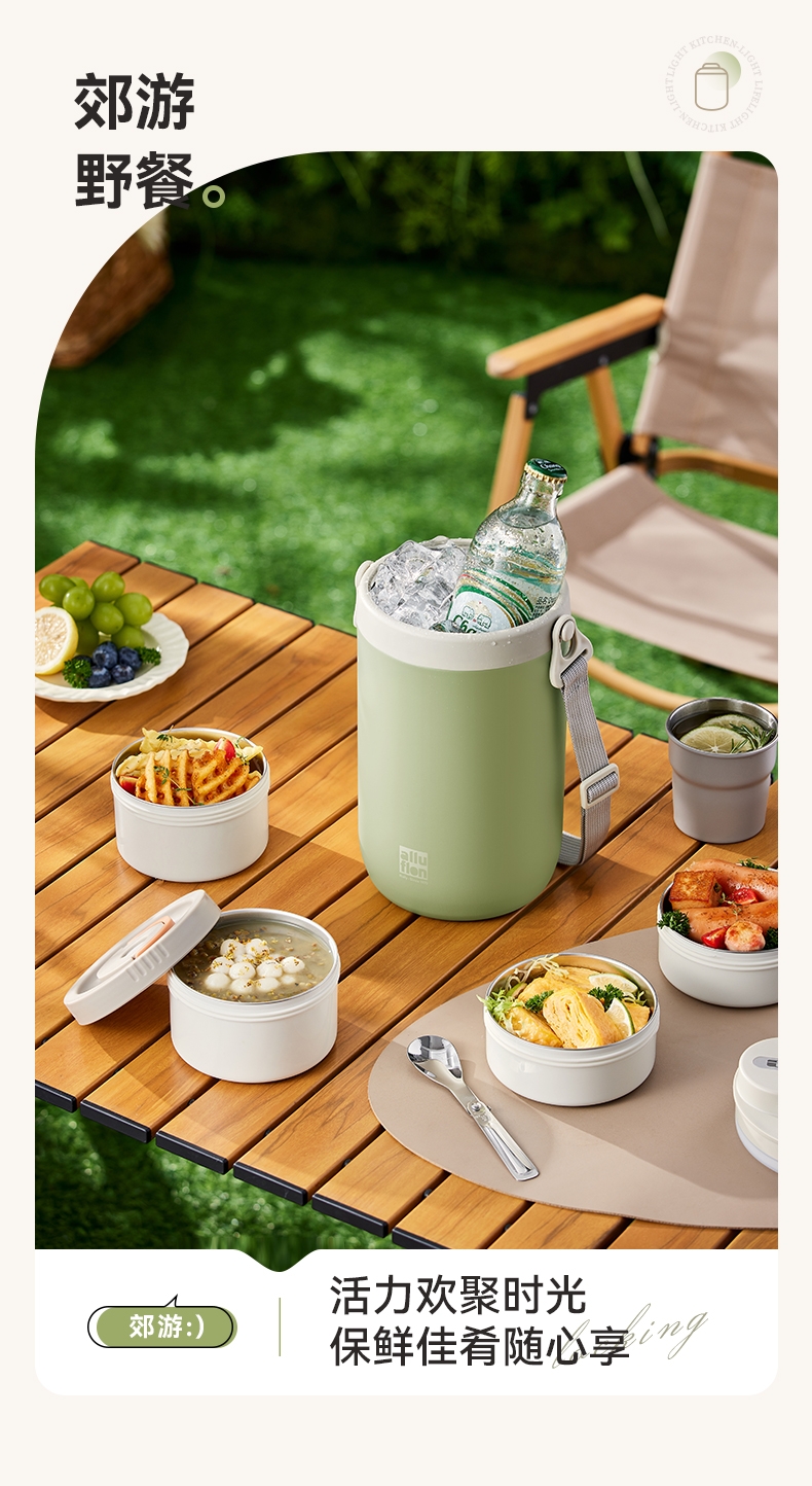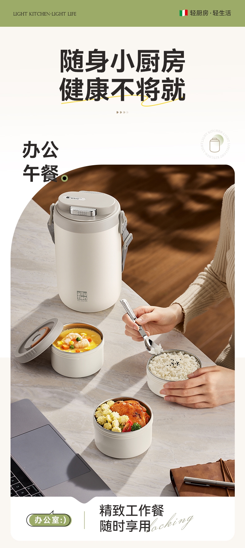 健康316L材质;三层独立饭盒,双层不锈钢抽真空;内置硅胶密封圈,倒置防漏