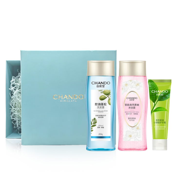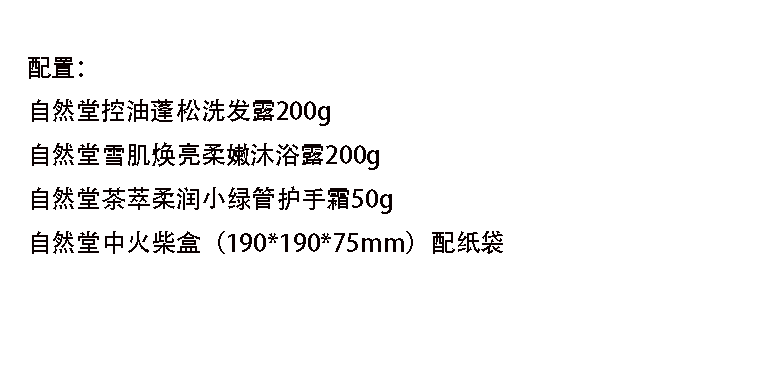 配置:自然堂控油蓬松洗发露200g 自然堂雪肌焕亮柔嫩沐浴露200g 自然堂茶萃柔润小绿管护手霜50g 自然堂中火柴盒(190*190*75mm)配纸袋