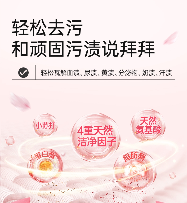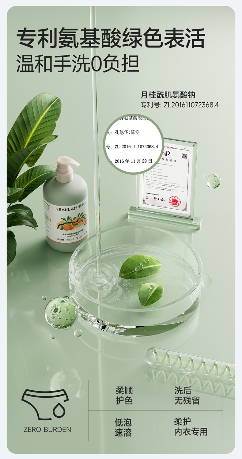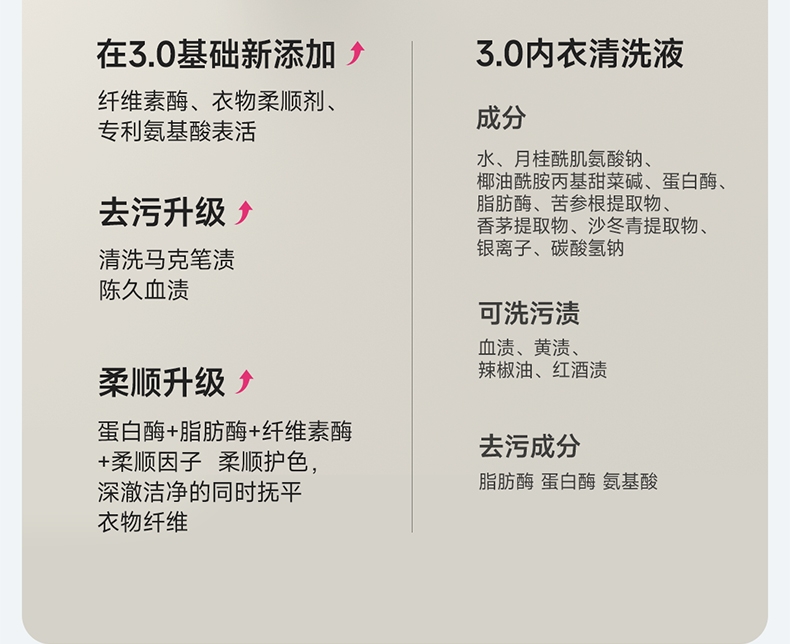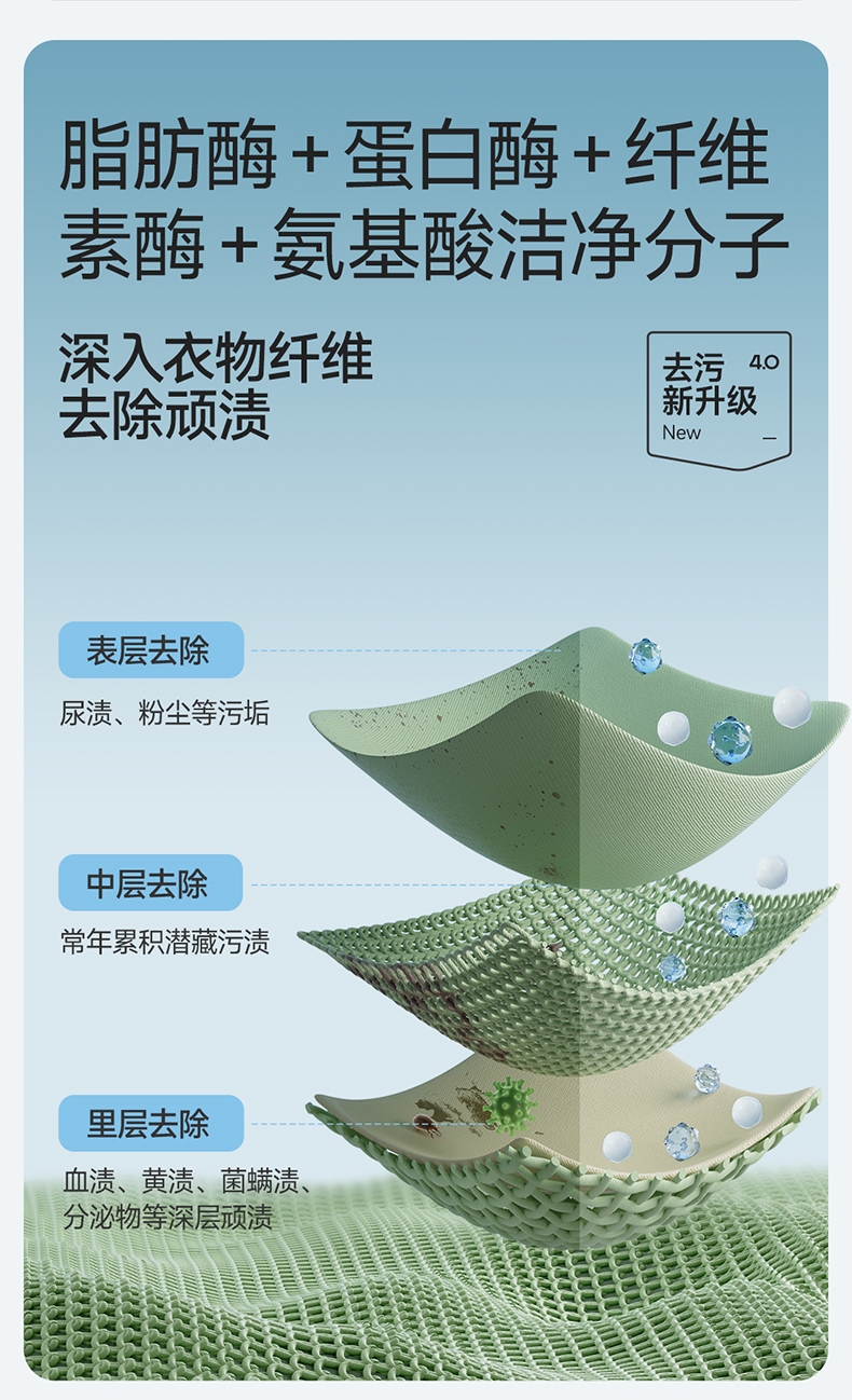 全面升级呵护家人健康;深入衣物纤维去除顽渍;专利氨基酸绿色表活温和手洗0负担