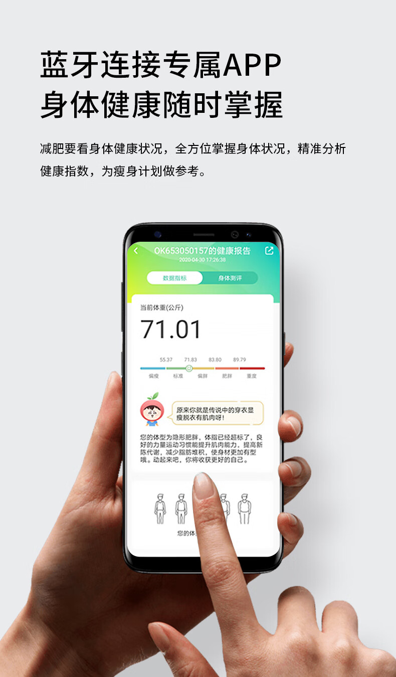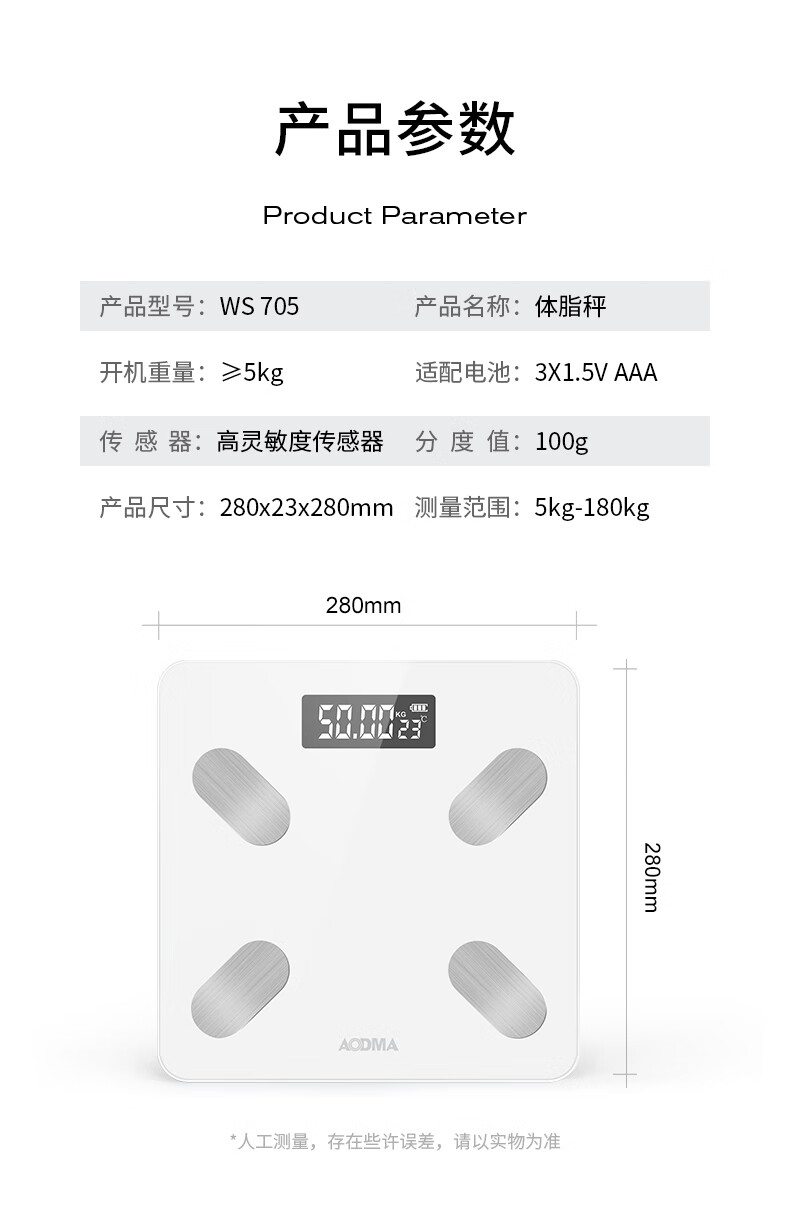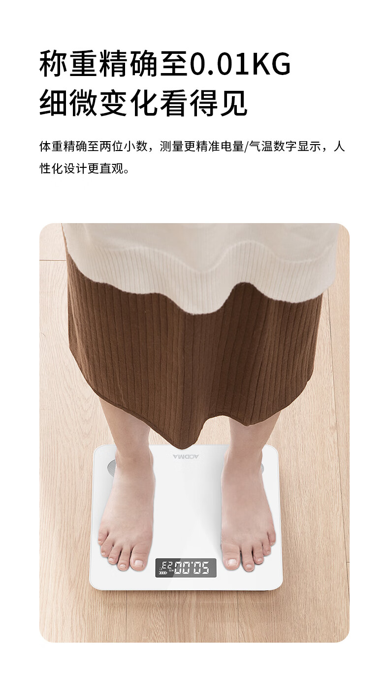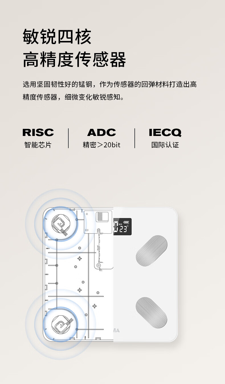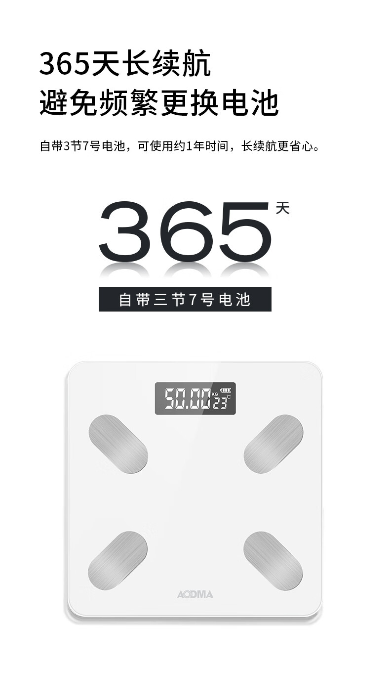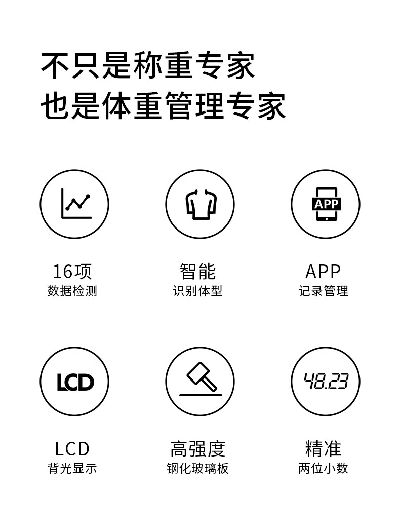 蓝牙APP显示身体数据;高精度传感器,称重精确到0.01Kg;BIA生物电阻测量法精准测量体重