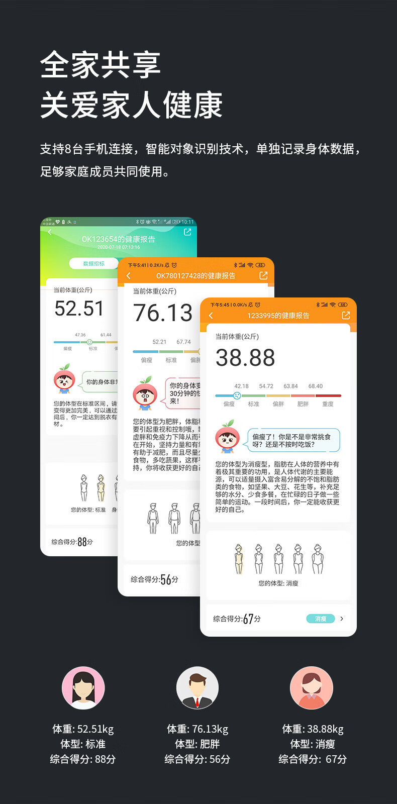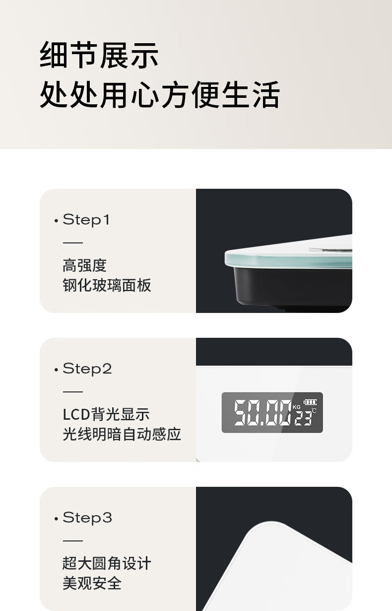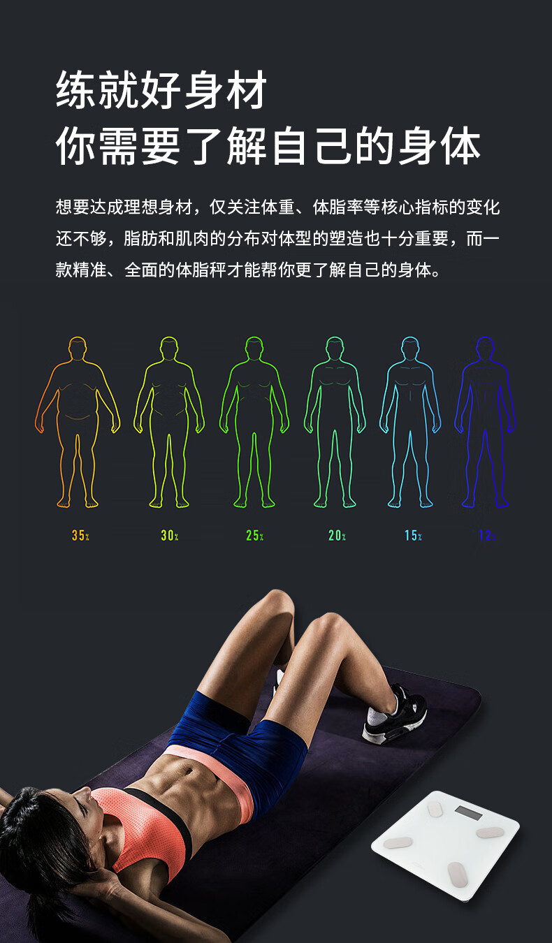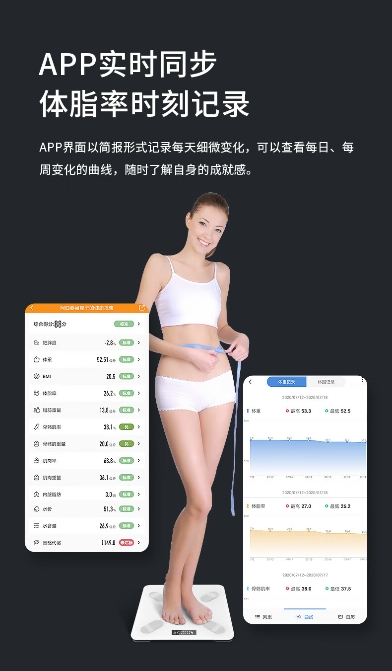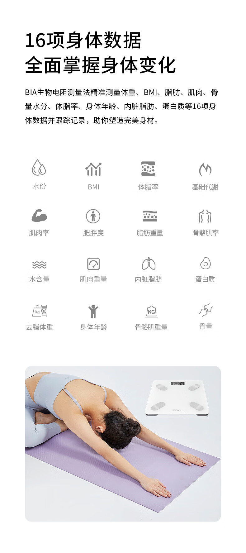 蓝牙APP显示身体数据;高精度传感器,称重精确到0.01Kg;BIA生物电阻测量法精准测量体重