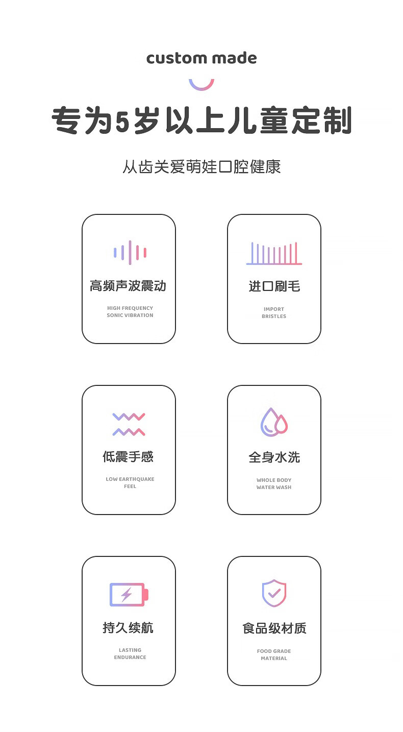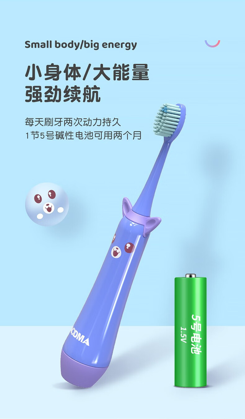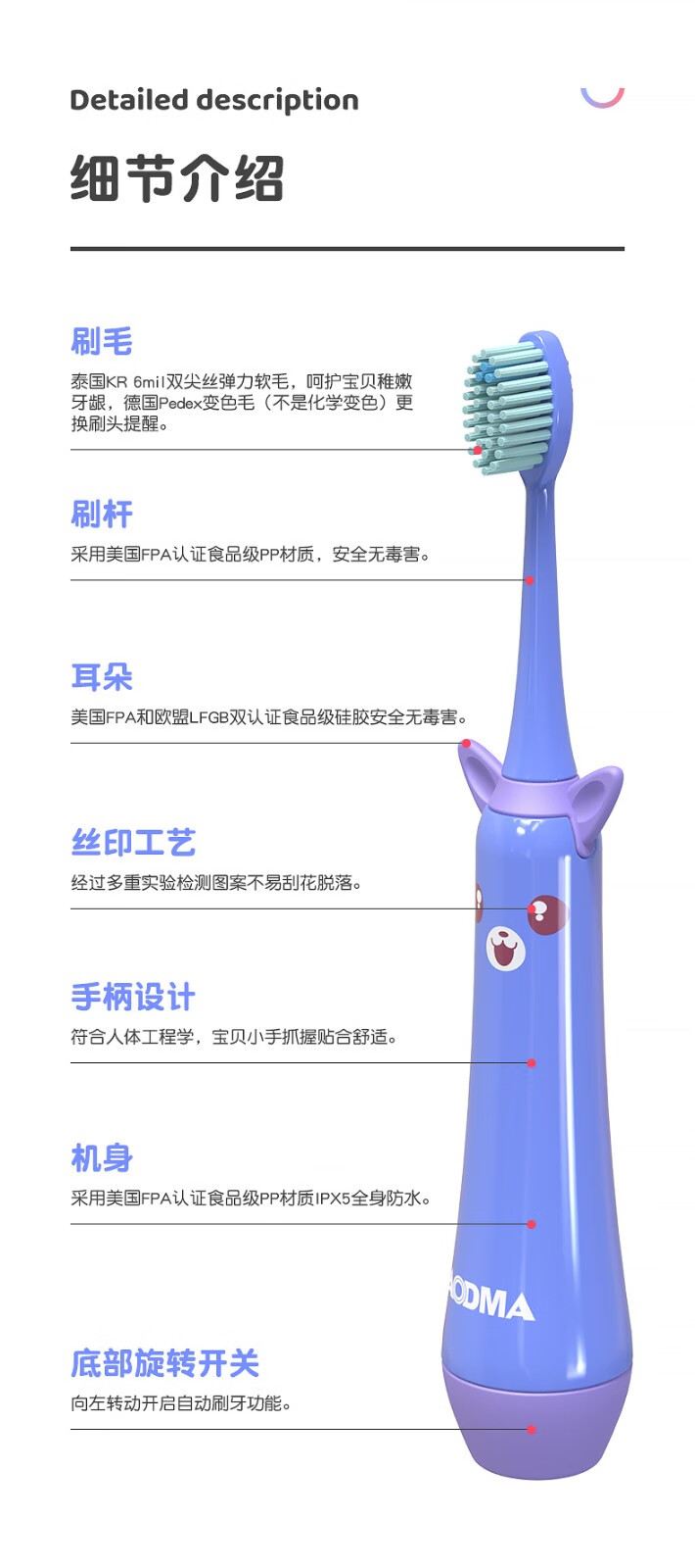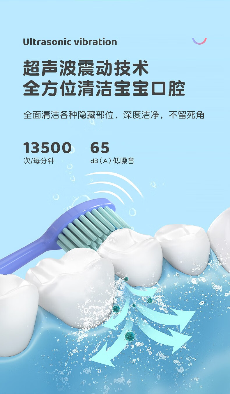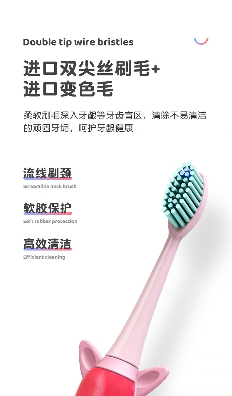振动频率13500次/分钟,呵护宝宝牙齿健康;进口泰国KR 6mil双尖丝+德国Pedex变色丝;适用5岁以上儿童使用