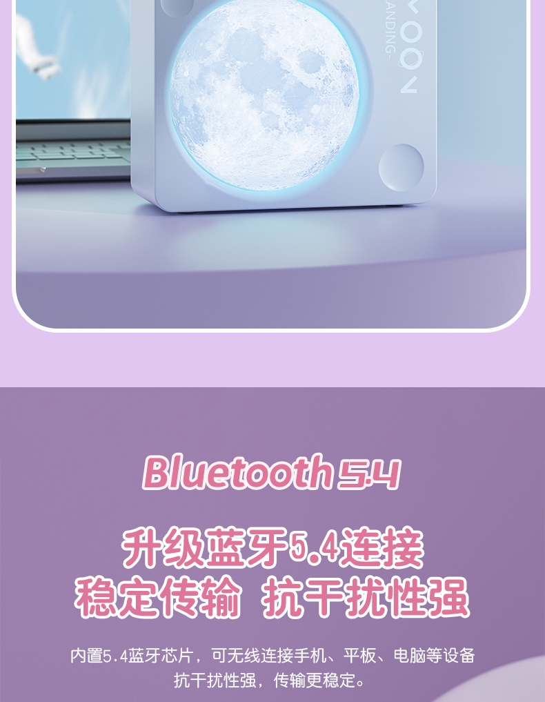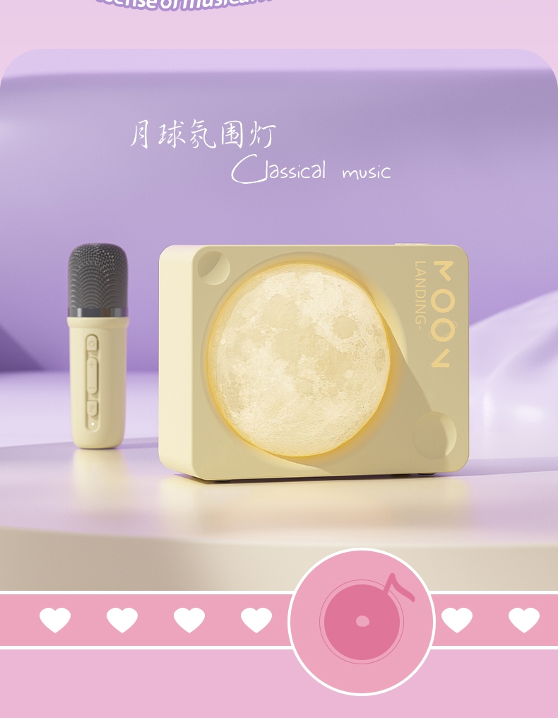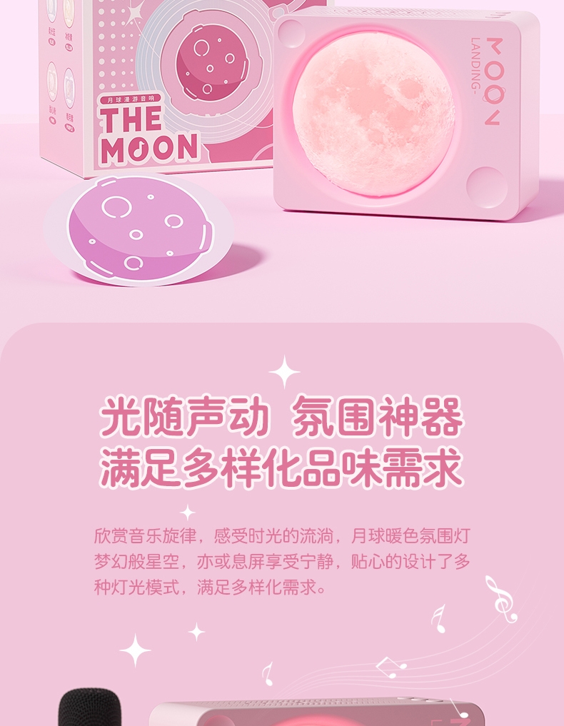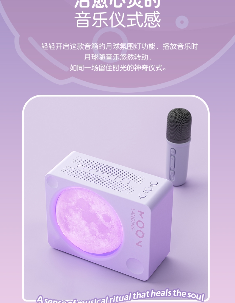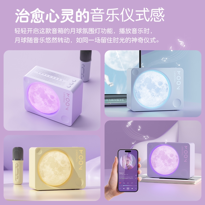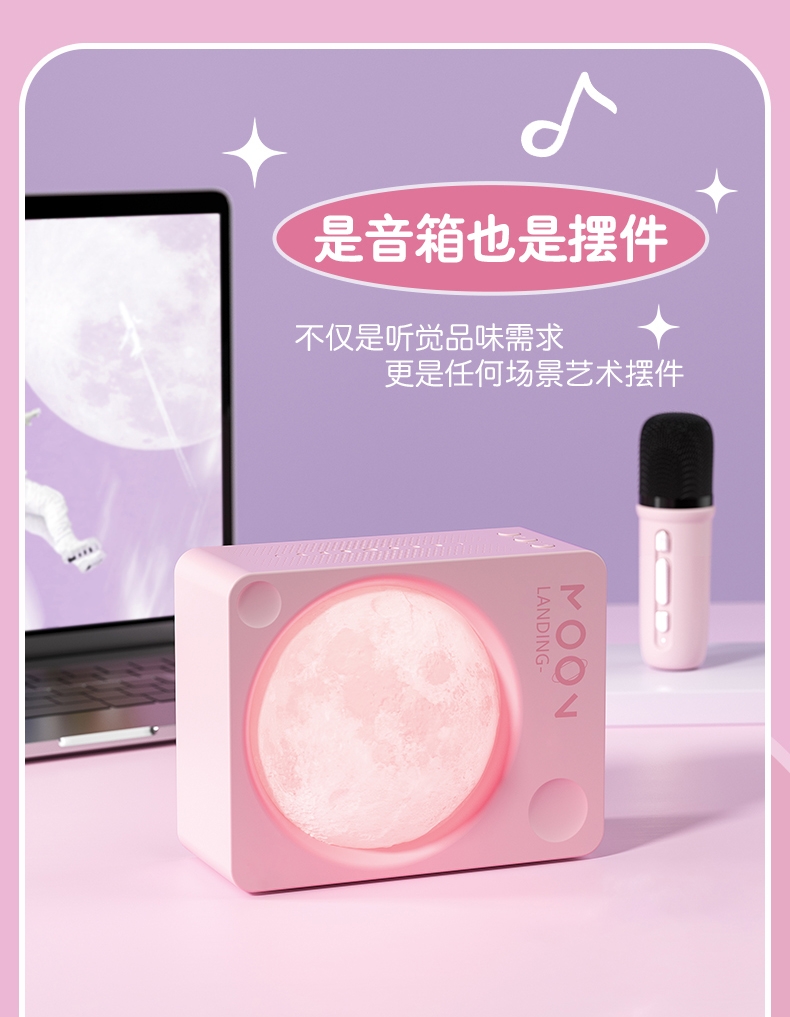 升级蓝牙5.4连接,稳定传输,抗干扰性强;温馨氛围灯,是音响也是摆件;高颜值MINI麦克风,细腻舒适握感