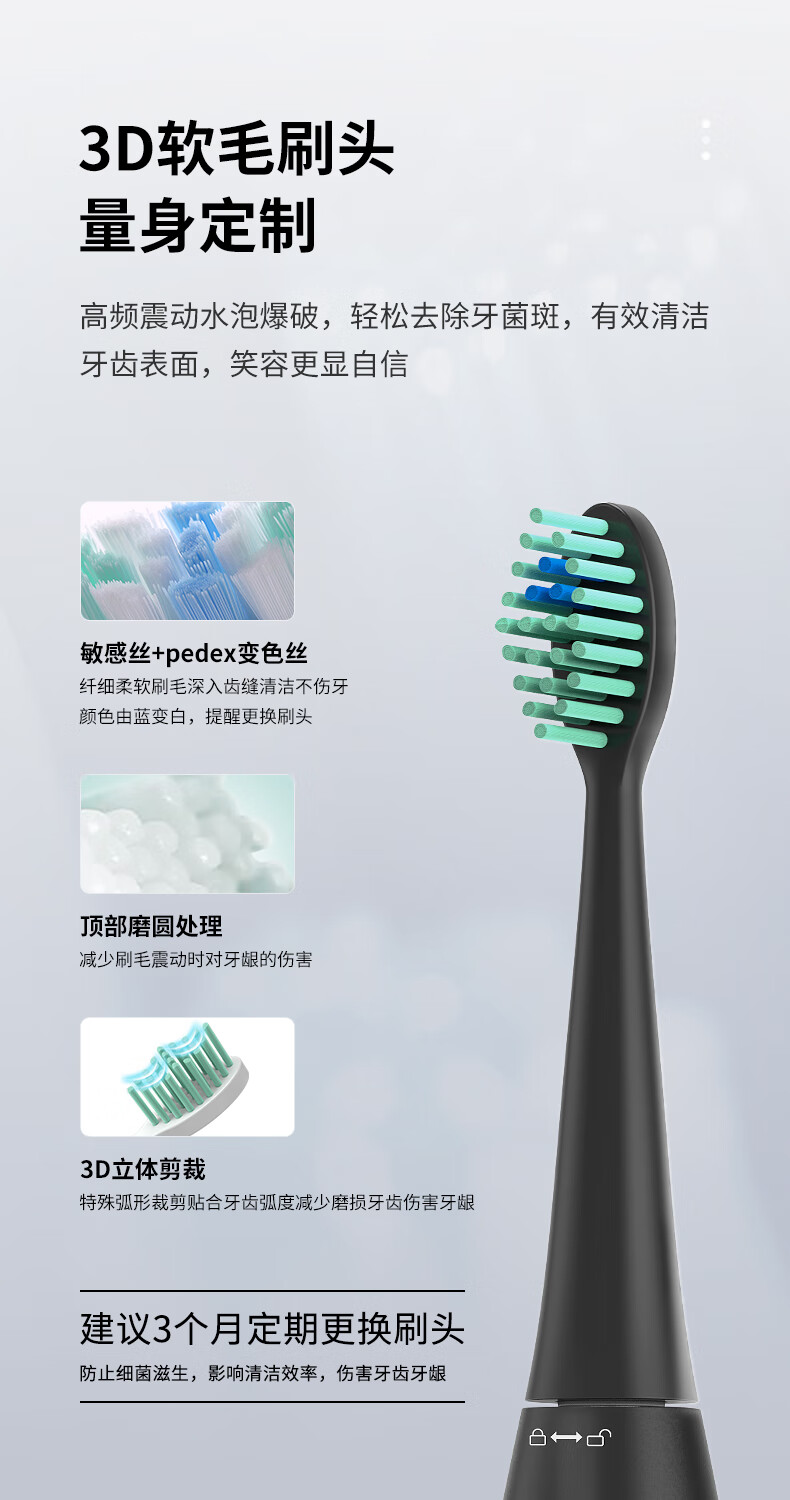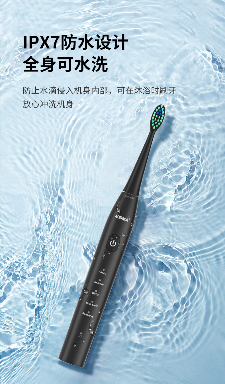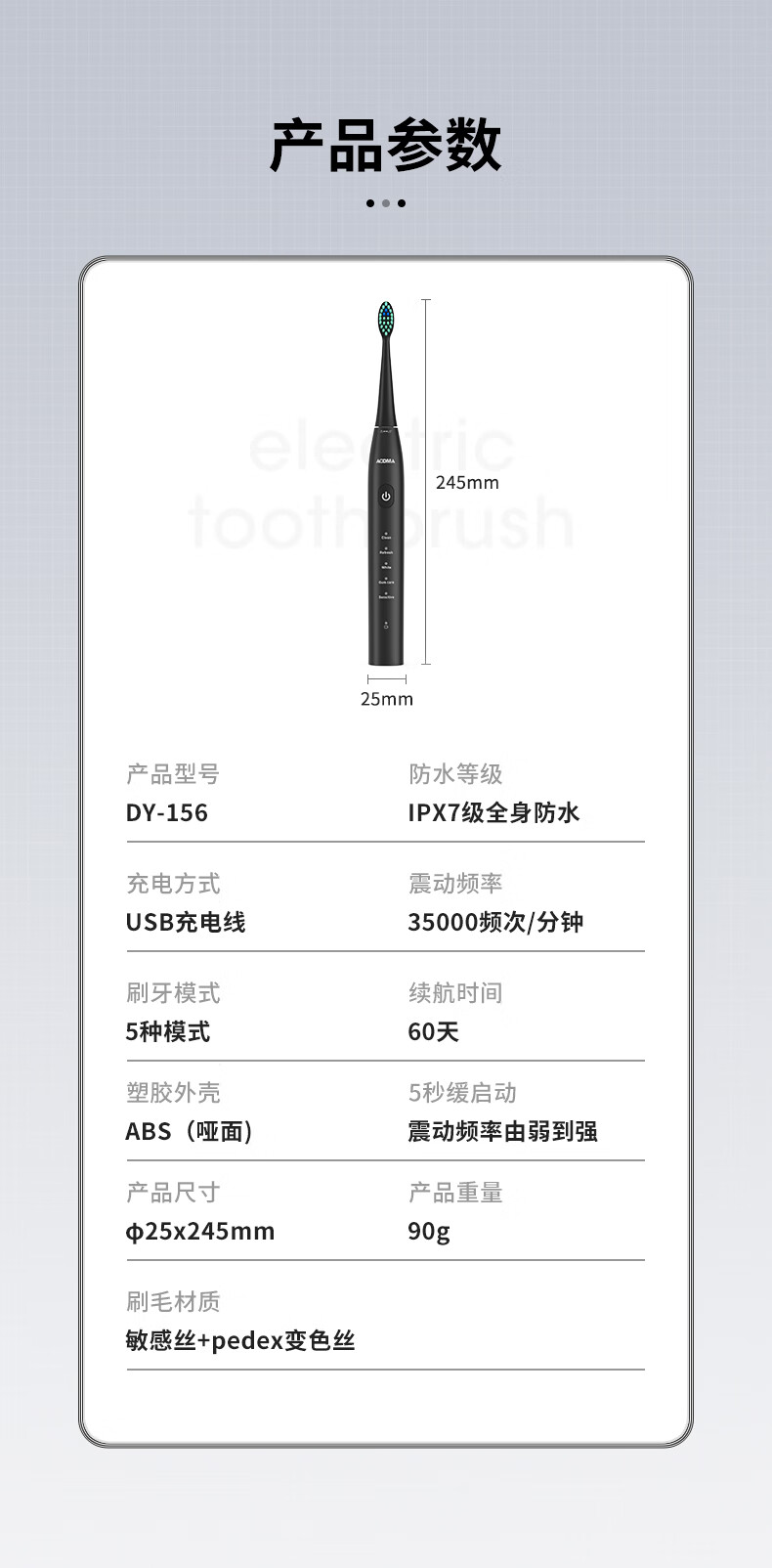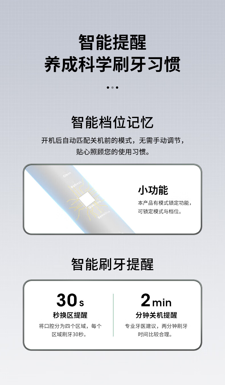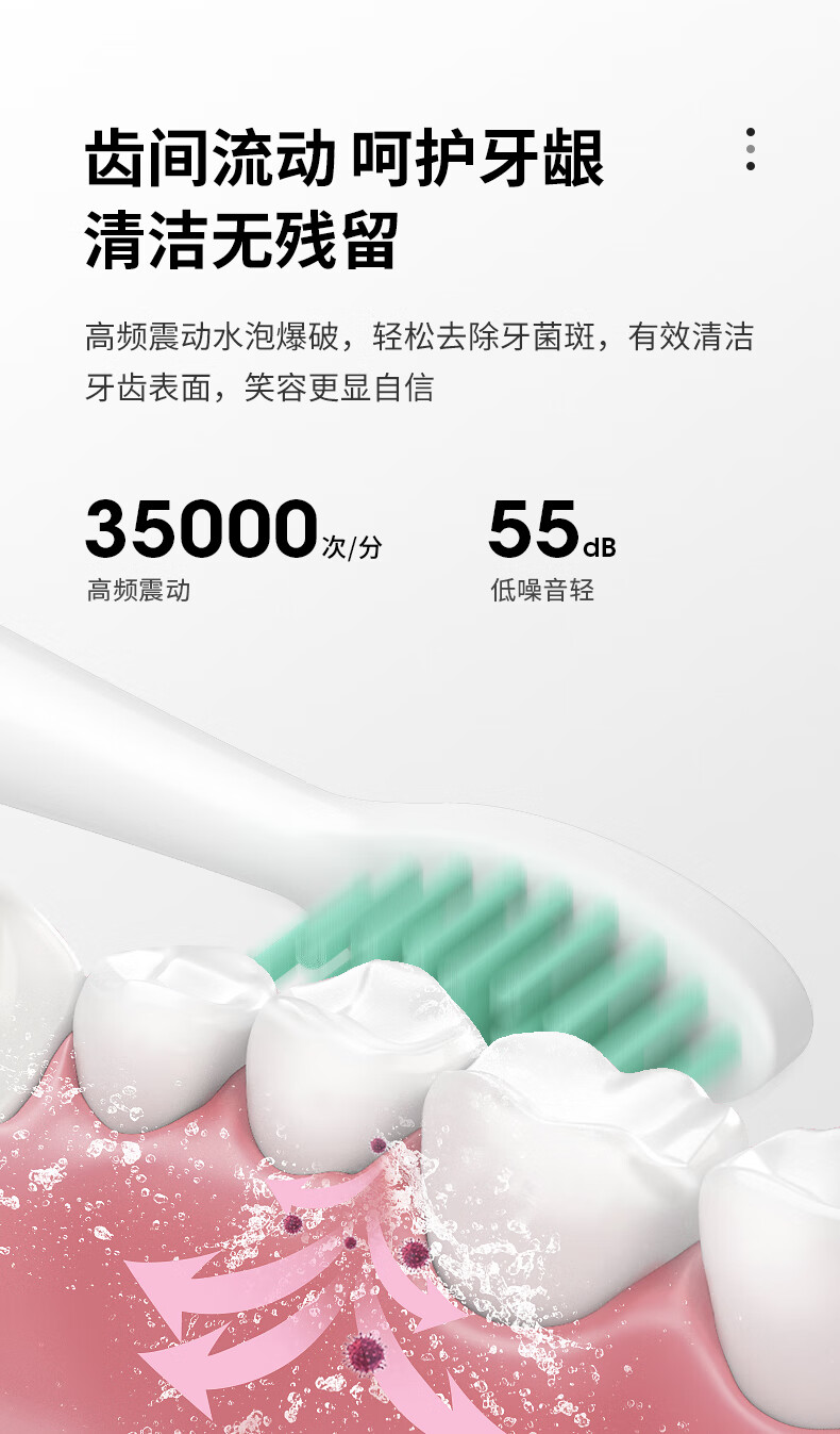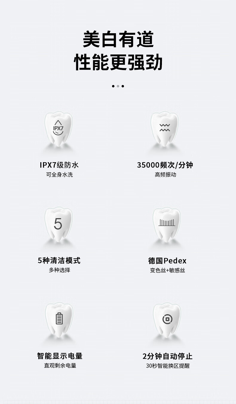 振动频率35000次/分钟,呵护牙齿健康;IPX7级防水,可全身水洗;2分钟自动关机,30秒智能提醒,记忆功能
