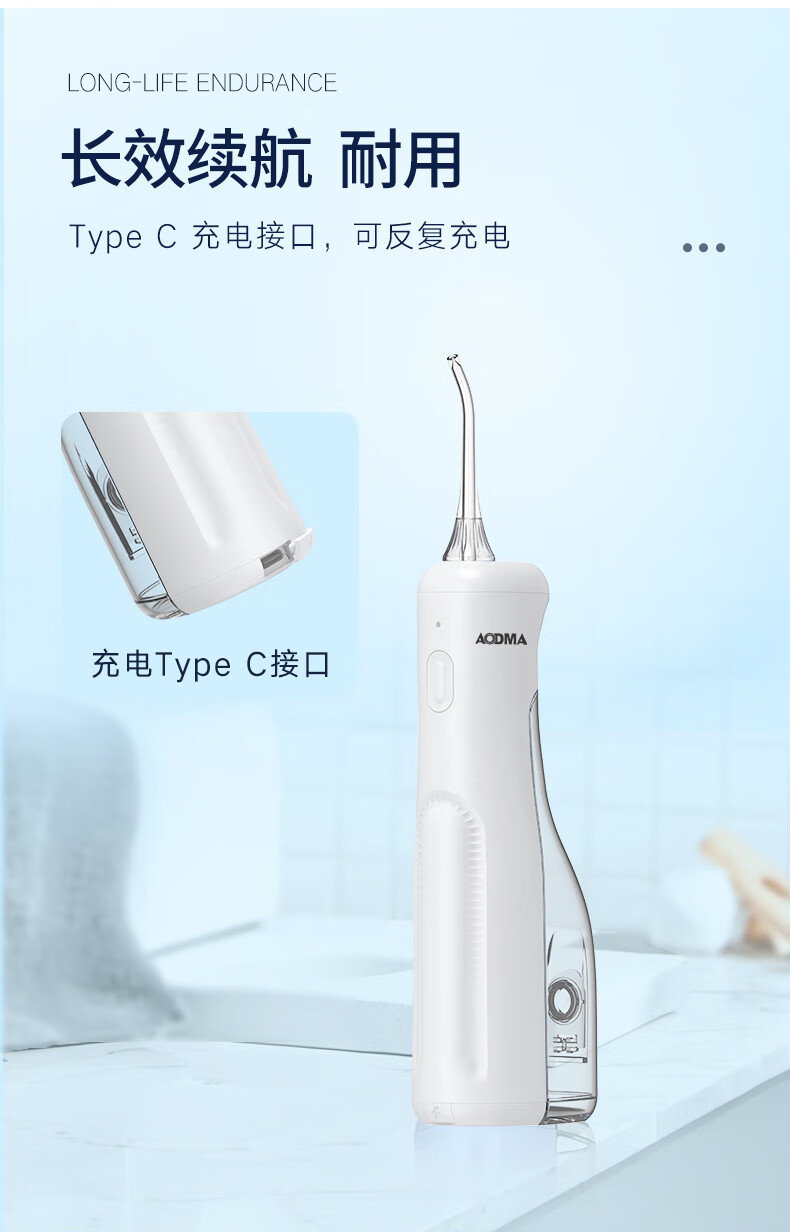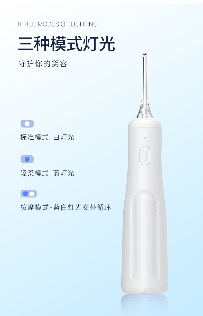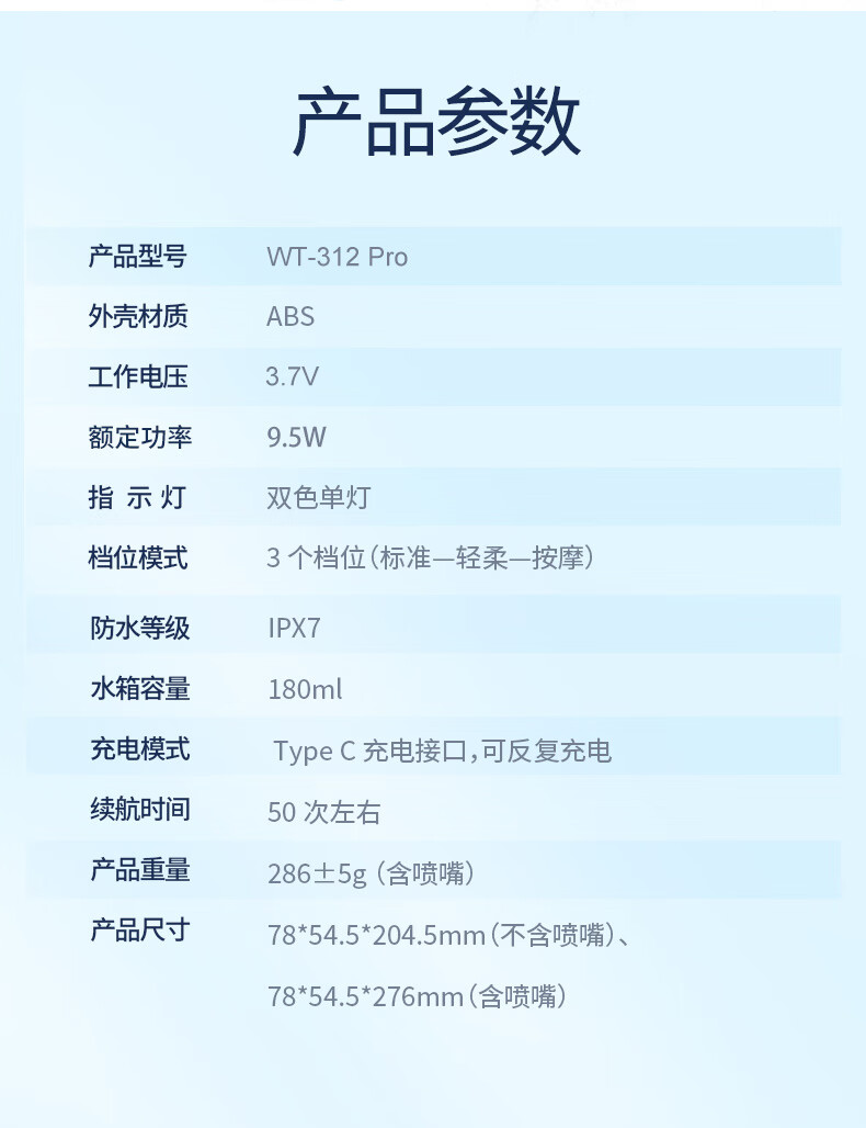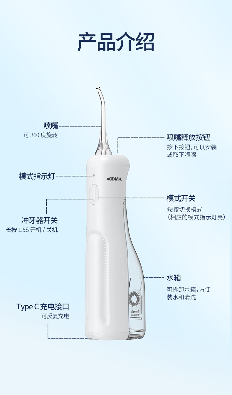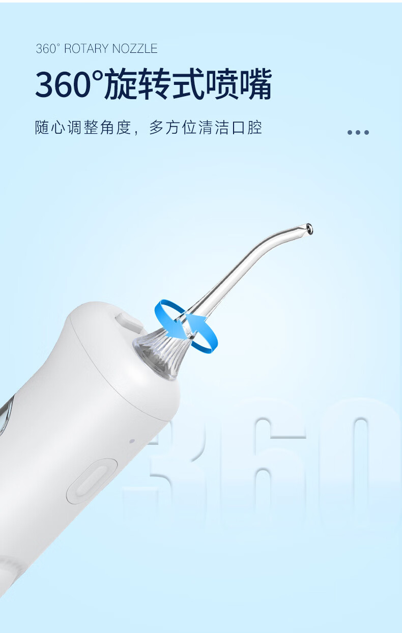 喷嘴可以360度旋转,喷嘴装卸方便;喷射多模式水压力度宽度广:4~15g;低电量提示功能,用户可以反复充电,操作简便