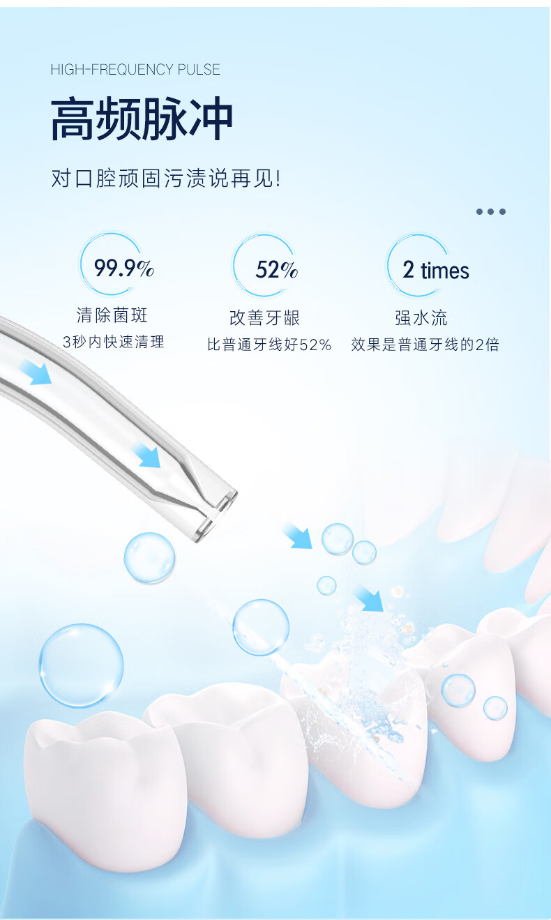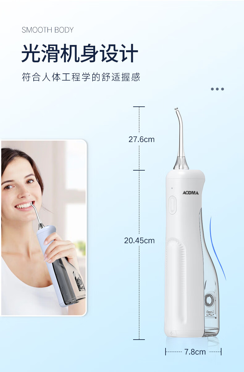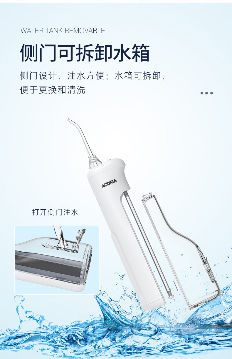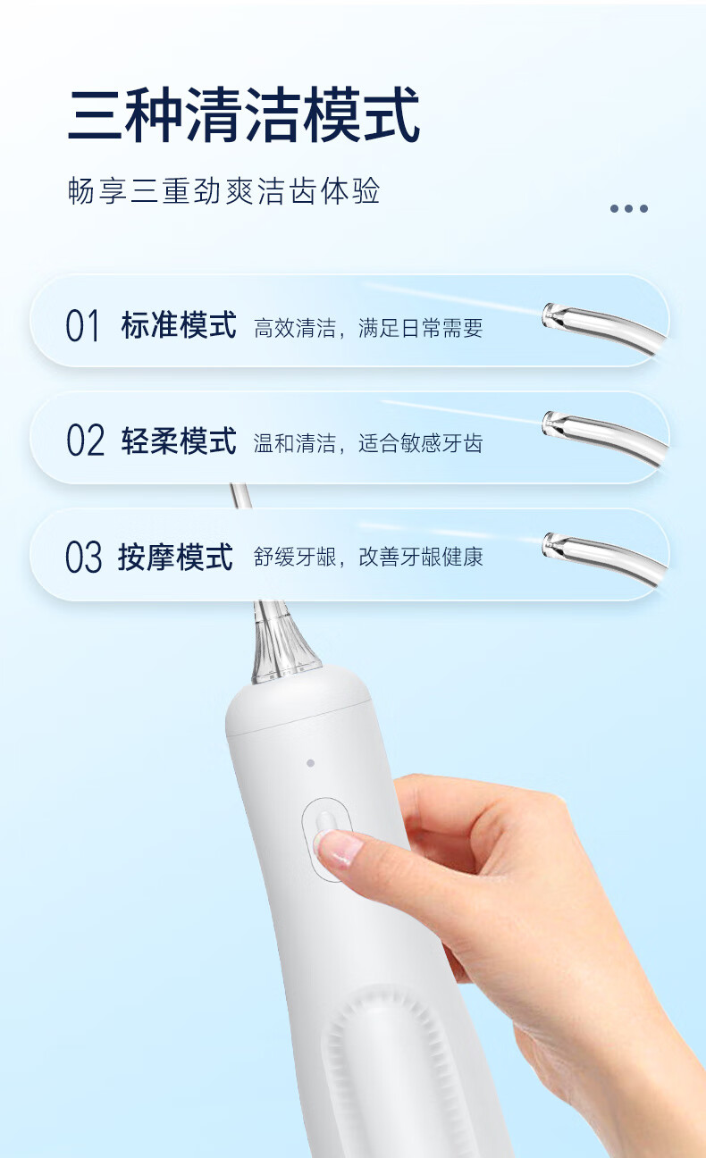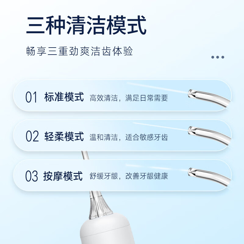喷嘴可以360度旋转,喷嘴装卸方便;喷射多模式水压力度宽度广:4~15g;低电量提示功能,用户可以反复充电,操作简便