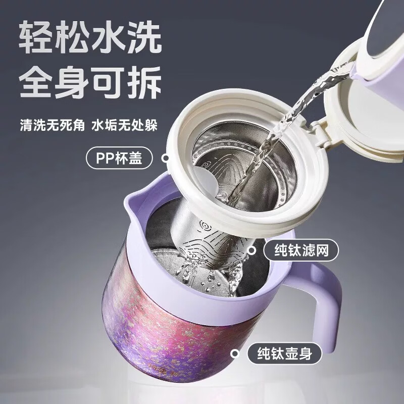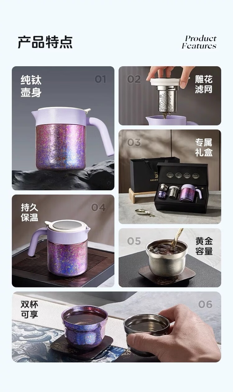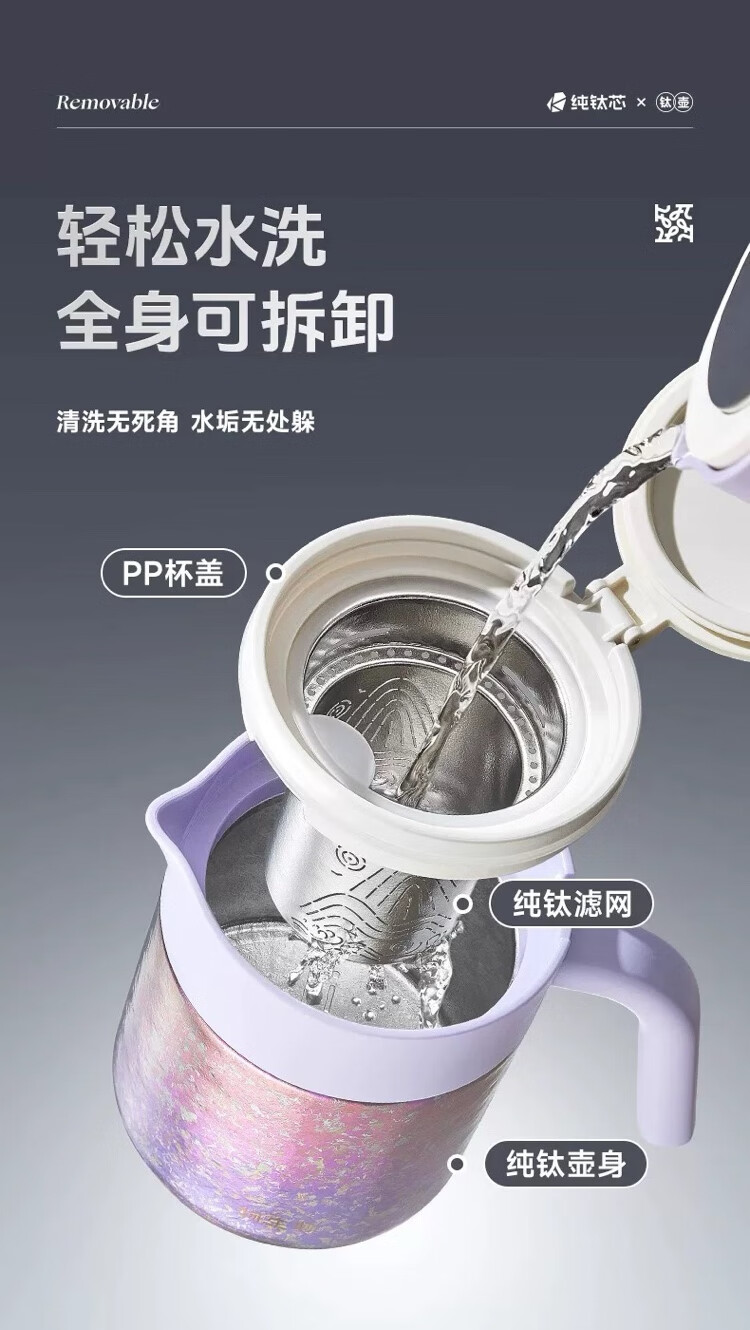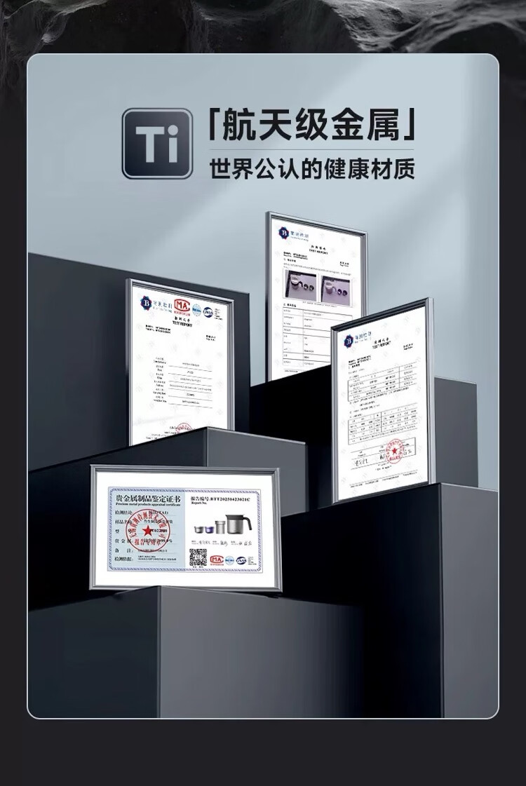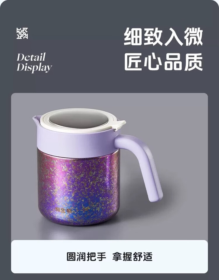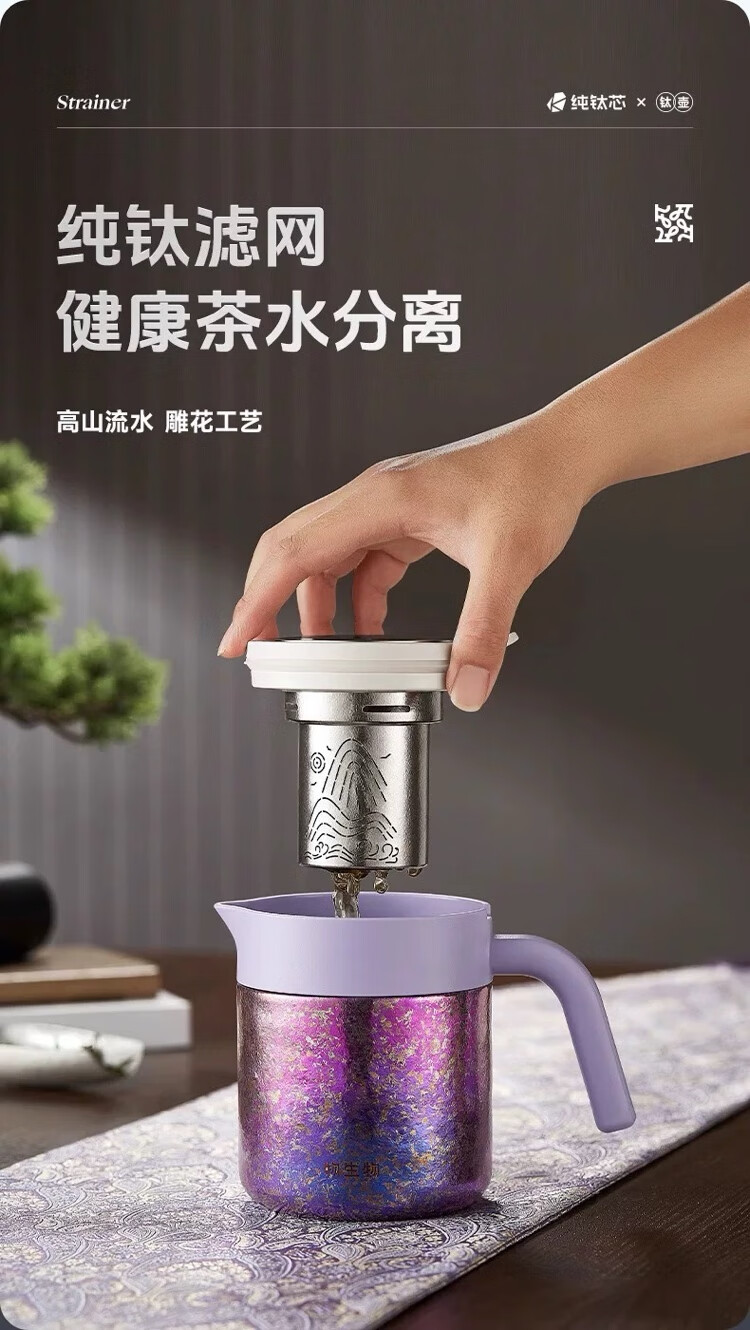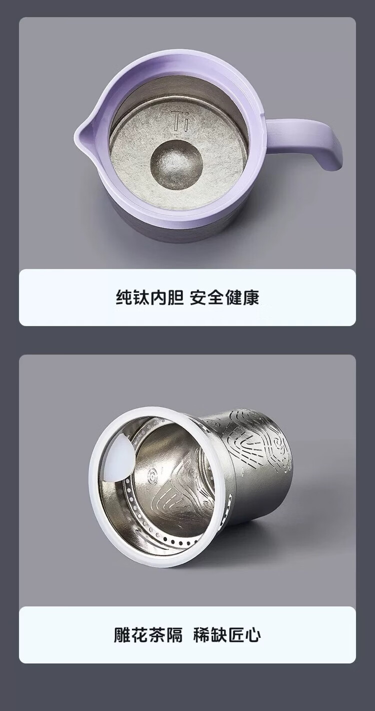 材质:纯钛杯身、纯钛茶漏、PP杯盖