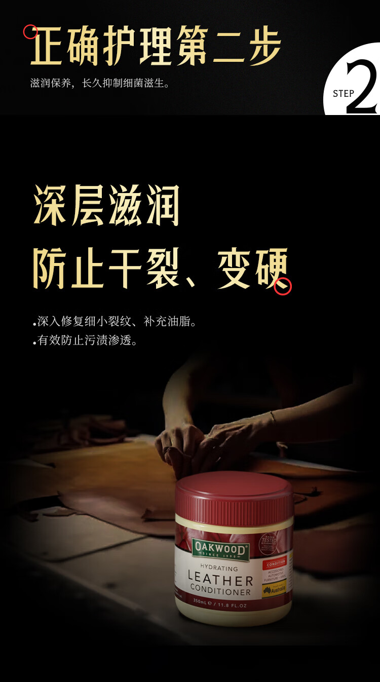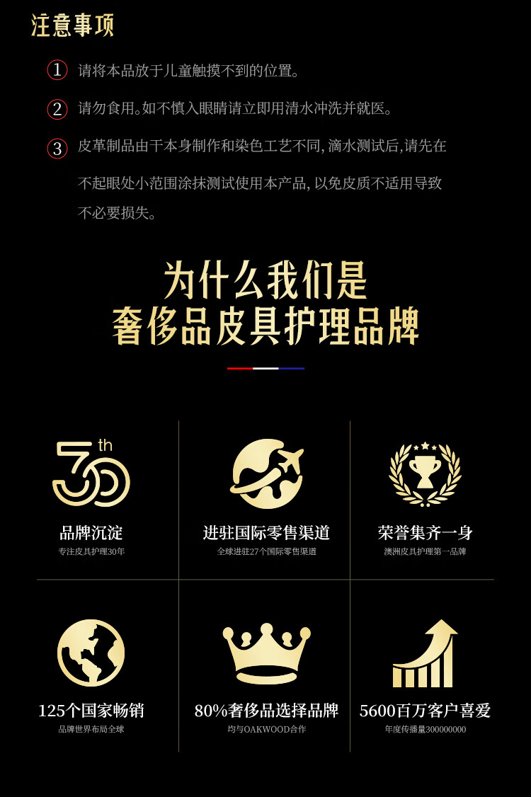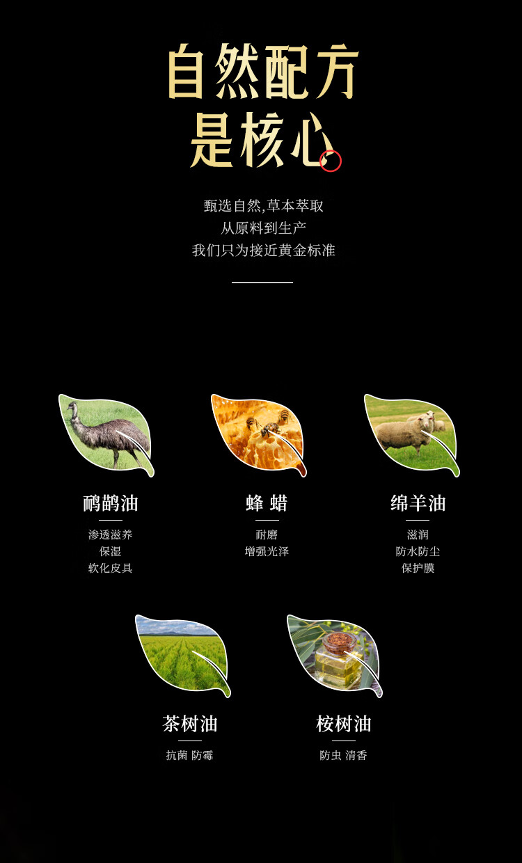 天然护肤级成分,补充皮具"胶原蛋白”;澳洲品牌,三十年专注,皮革保养护理品牌;自然配方是核心;中性温和配方不伤真皮;广泛适用于真皮/PU皮/光面皮