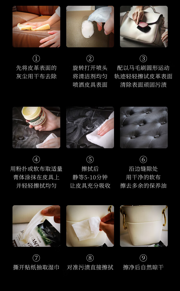 配置清单:皮革深度清洁剂-500ml 皮革护理膏-350g 皮革护理湿巾-20张/包高级皮革马毛刷超细纤维抹布 粉扑