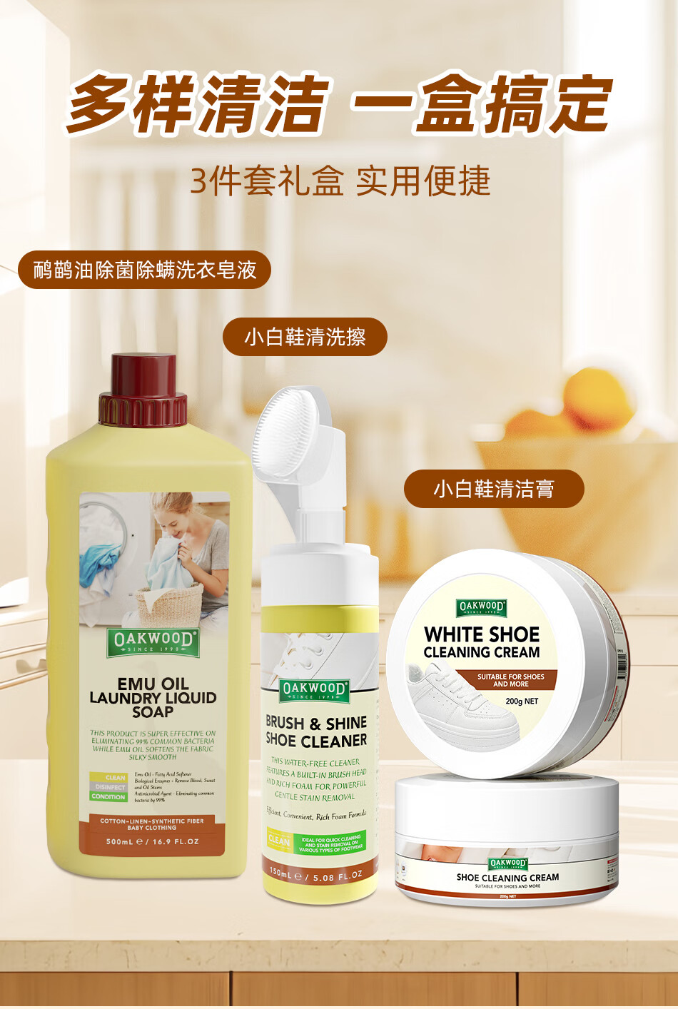 配置清单:小白鞋清洗擦150ml 鸸鹋油除菌除螨洗衣皂液-500ml 小白鞋清洁膏200g