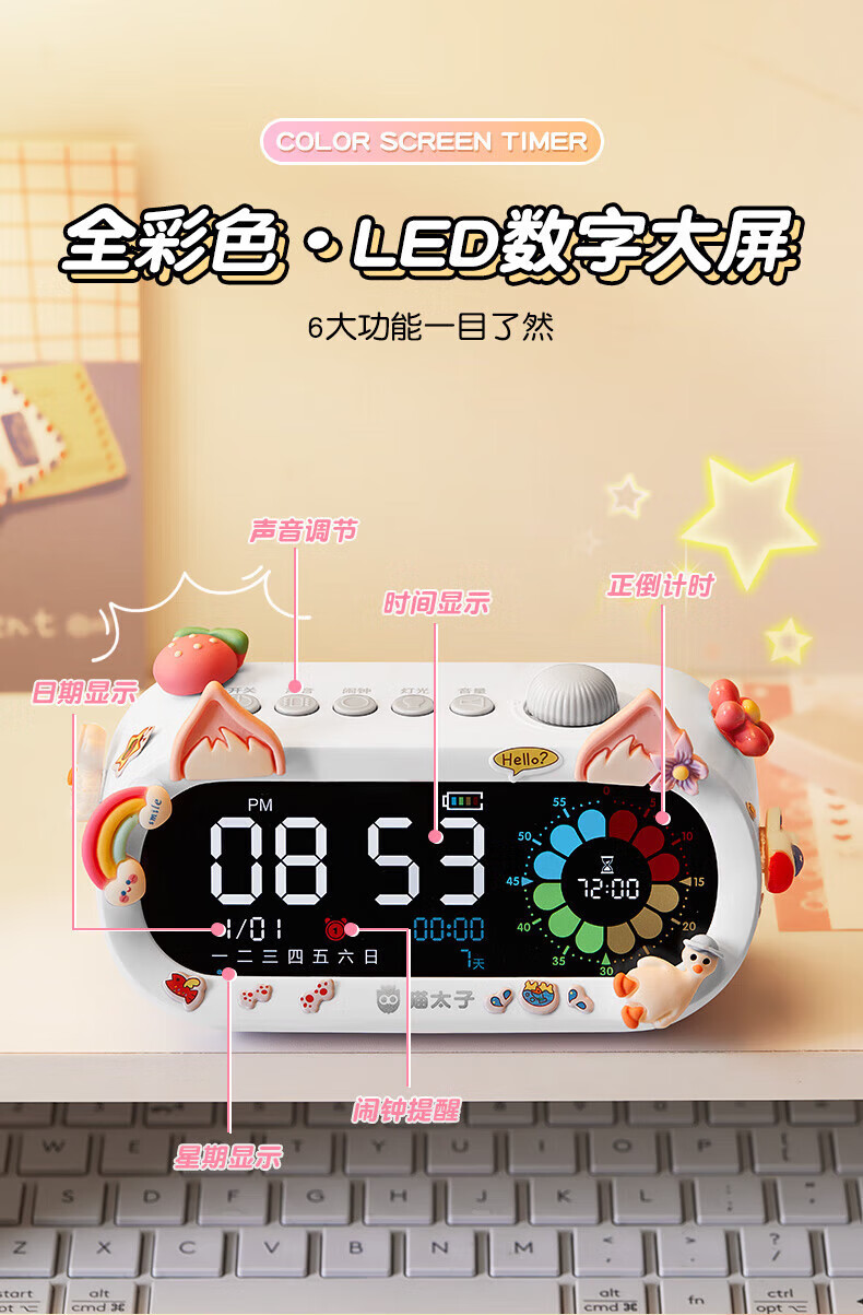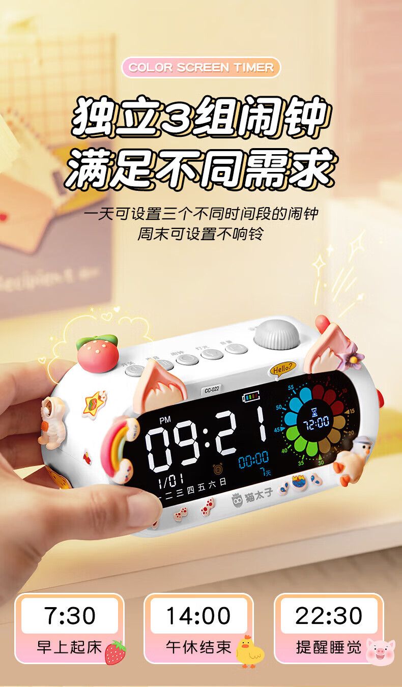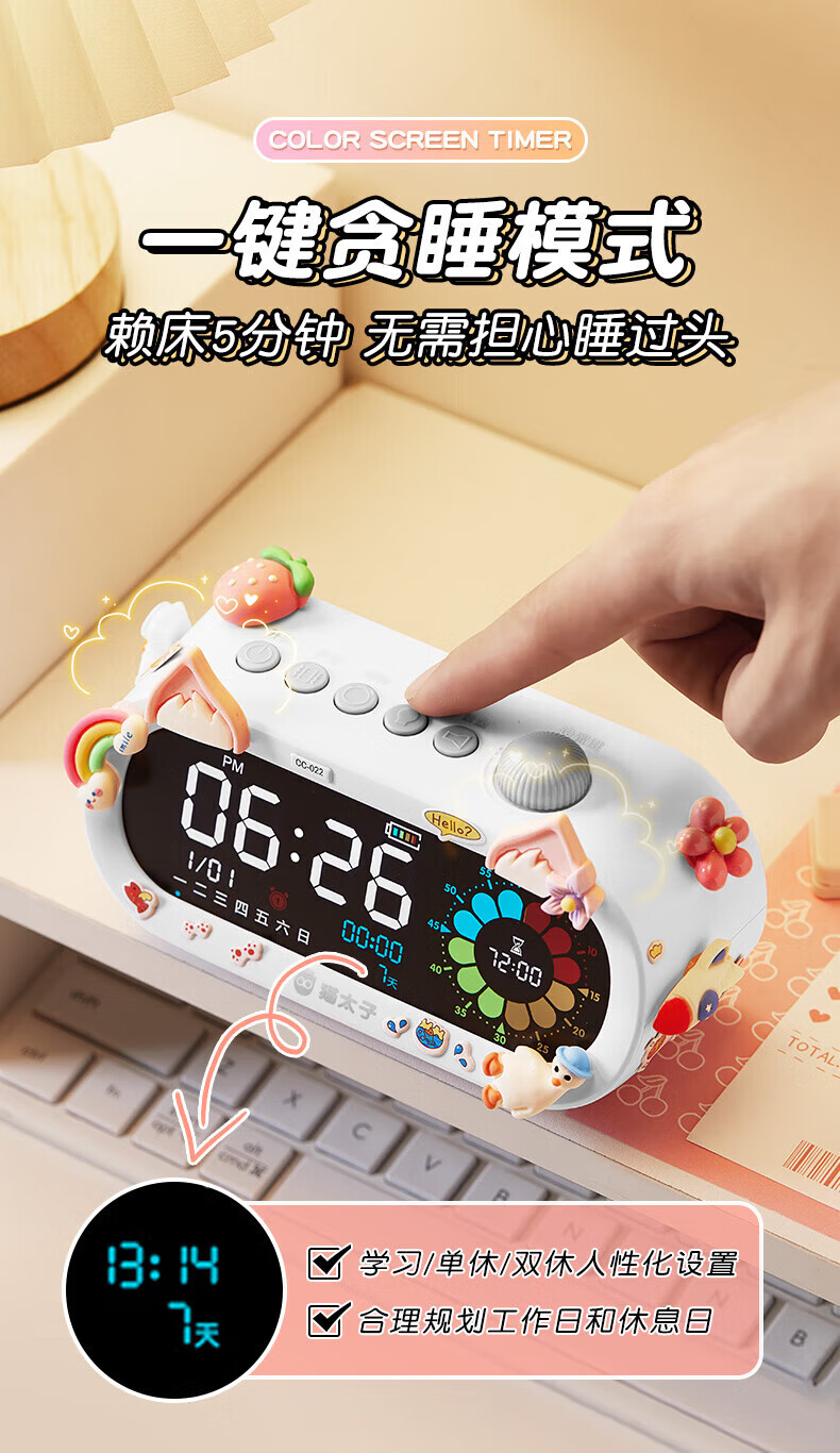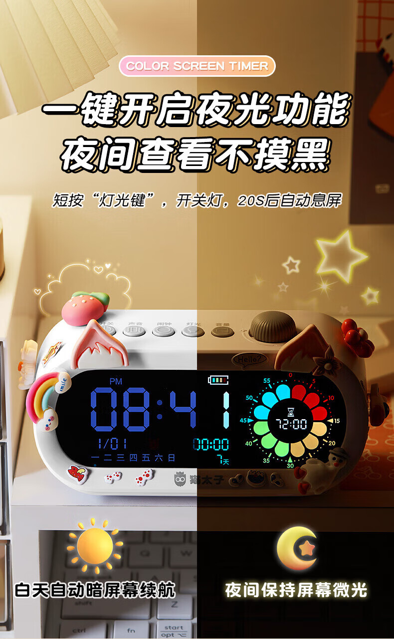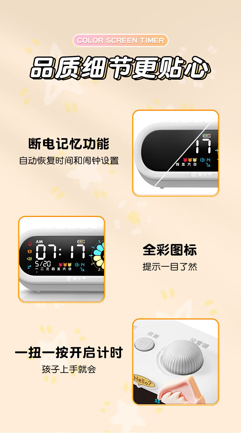 断电记忆功能,自动恢复时间和闹钟设置;全彩图标,提示一目了然;一扭一按开启计时
