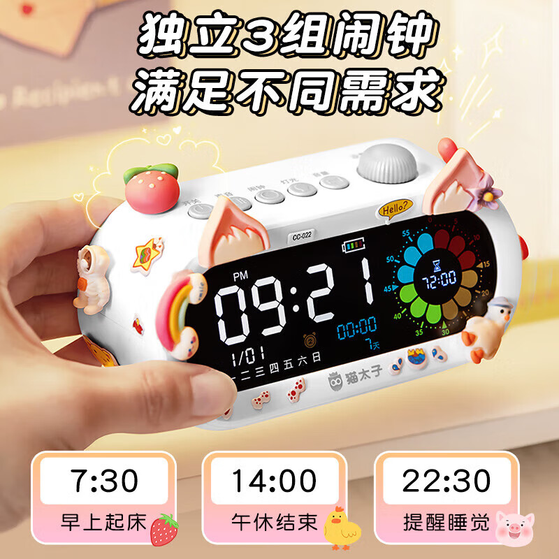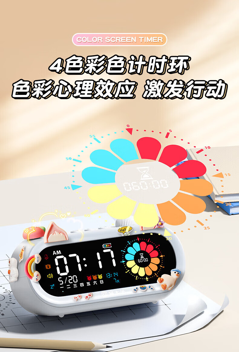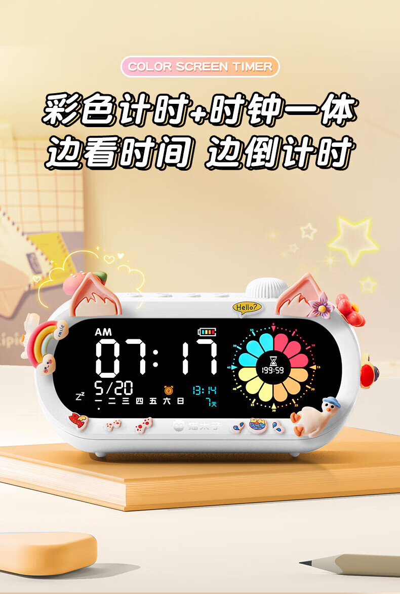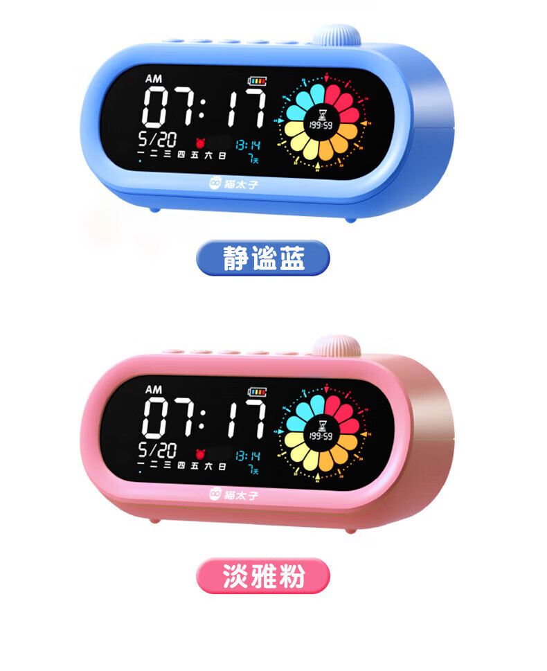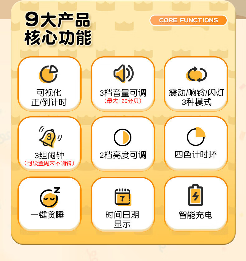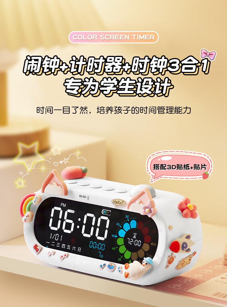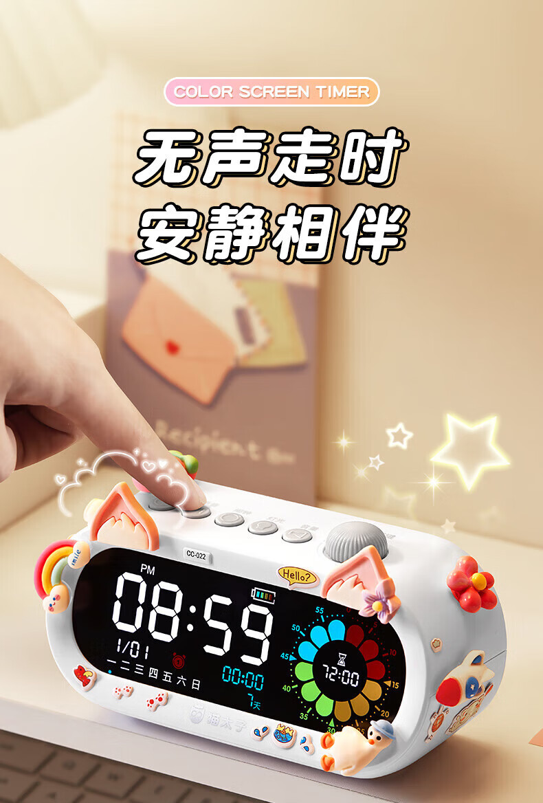 断电记忆功能,自动恢复时间和闹钟设置;全彩图标,提示一目了然;一扭一按开启计时