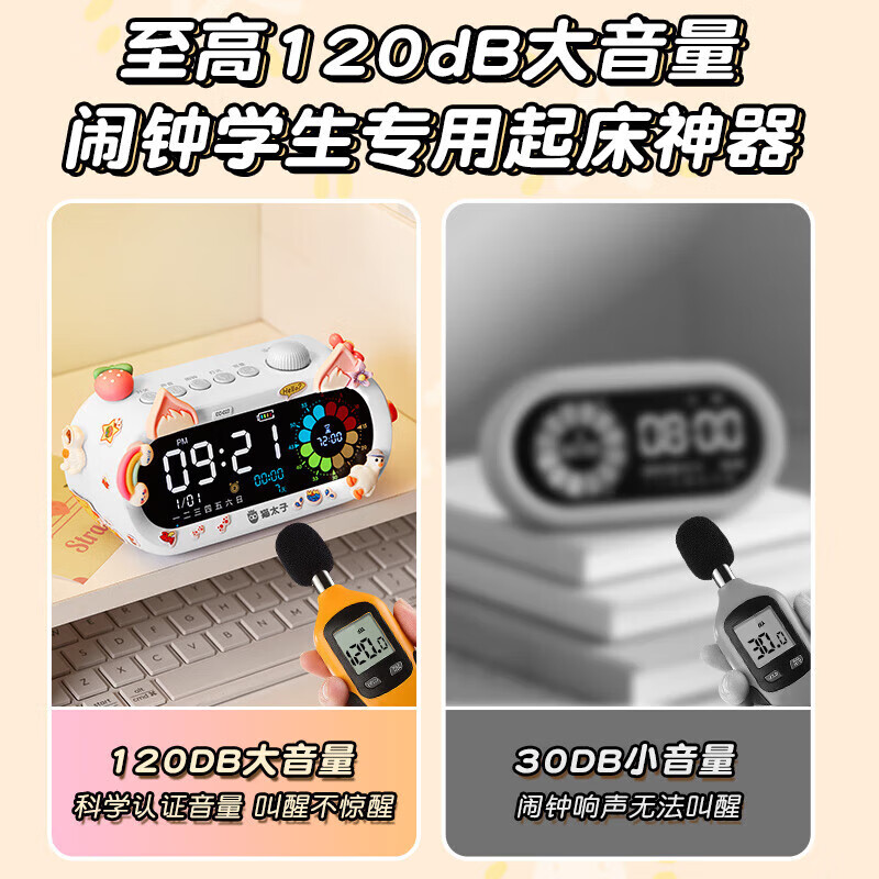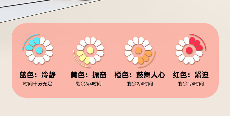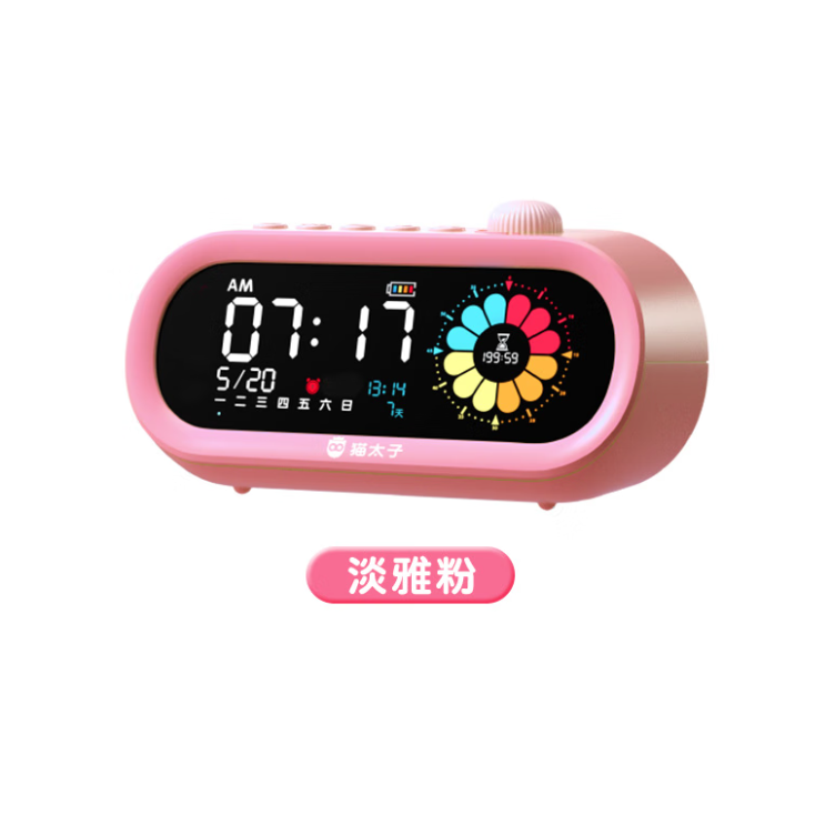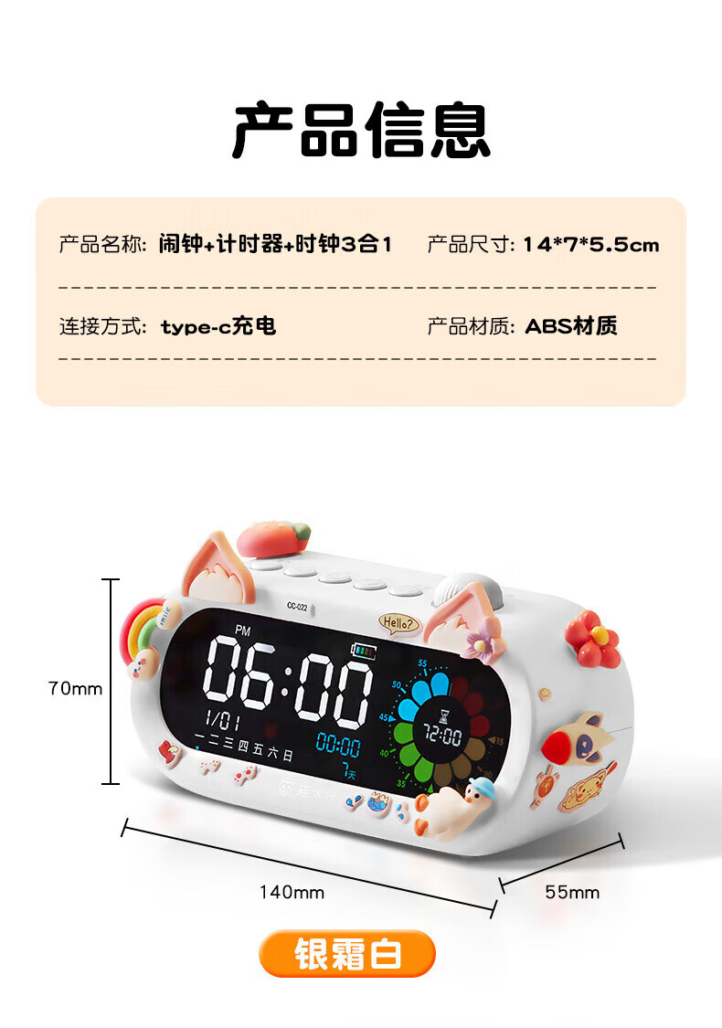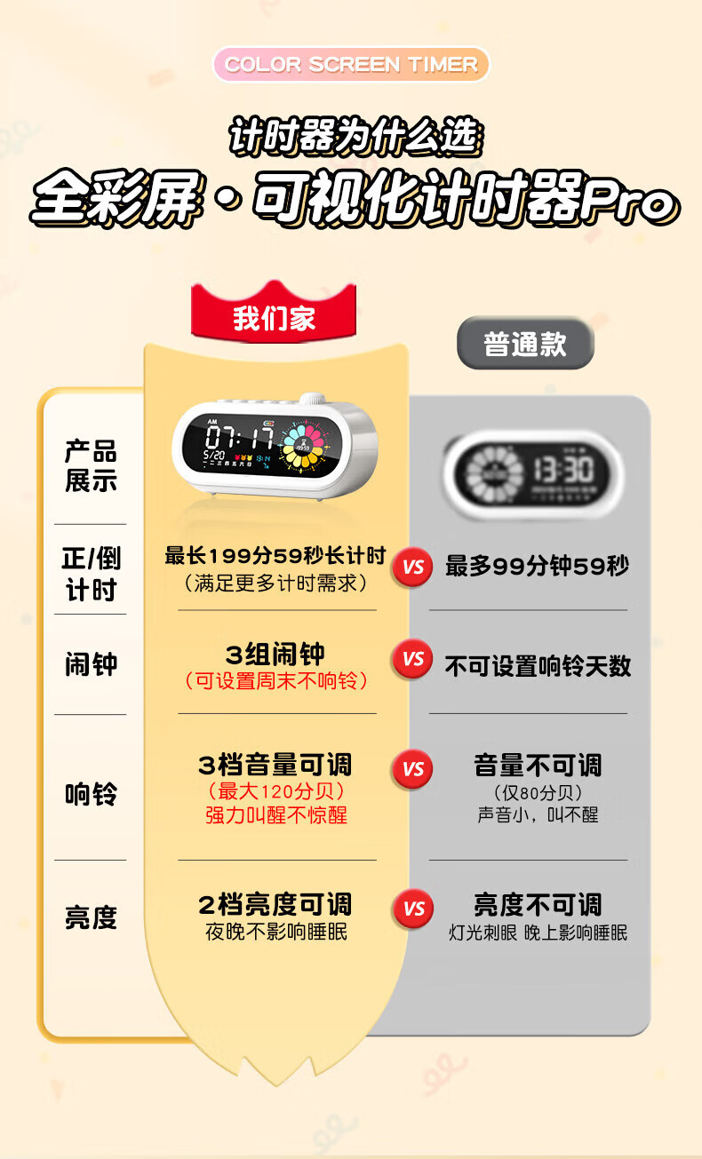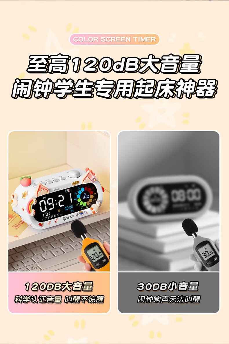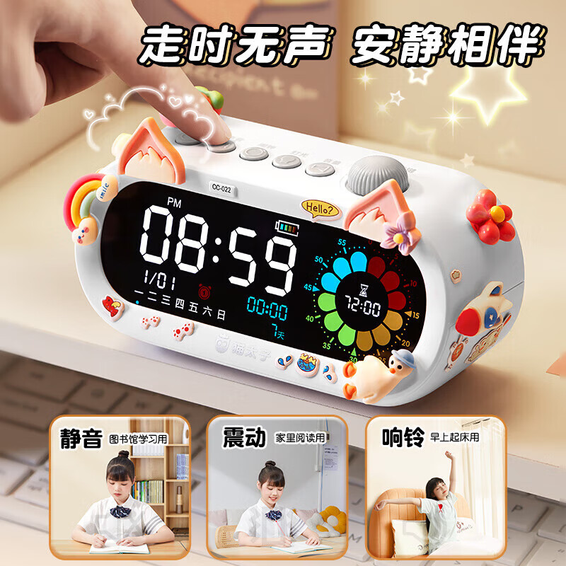断电记忆功能,自动恢复时间和闹钟设置;全彩图标,提示一目了然;一扭一按开启计时