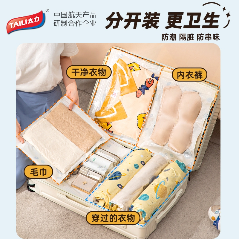 旅行专用压缩袋 免抽气 分类收纳 箱包兼容;创新隐藏式尾部排气 压一压 省3倍空间;适用市面大部分行李箱 小小一卷 便携随行;强韧抗拉扯 可反复使用;防水防潮 遇水不渗透