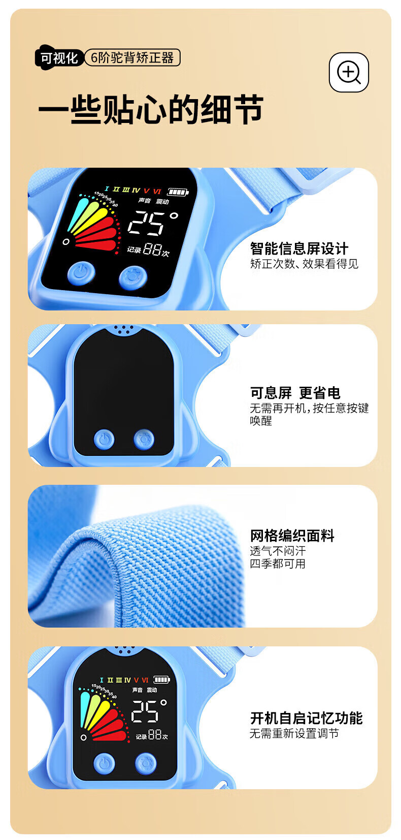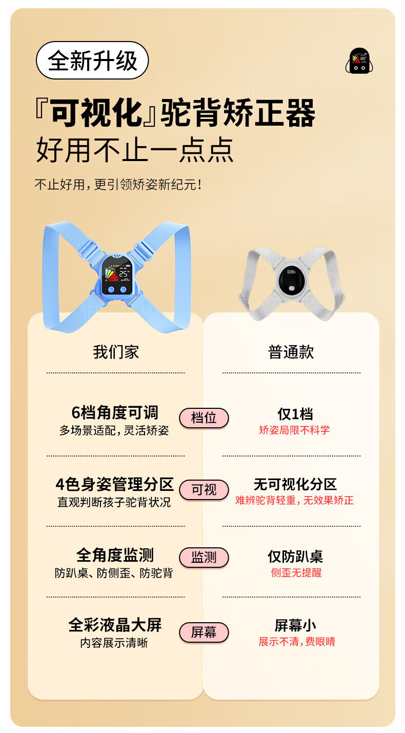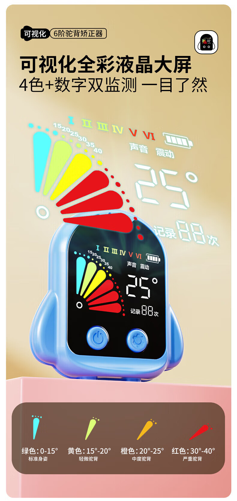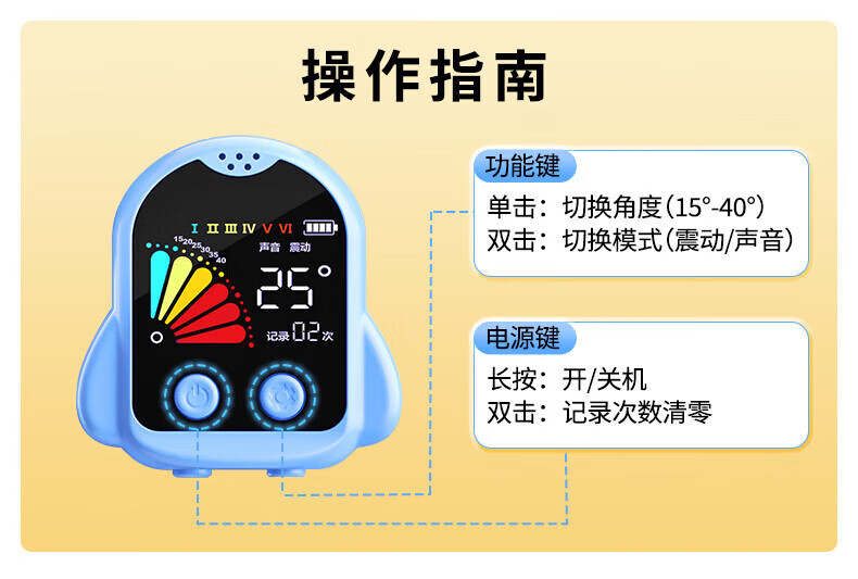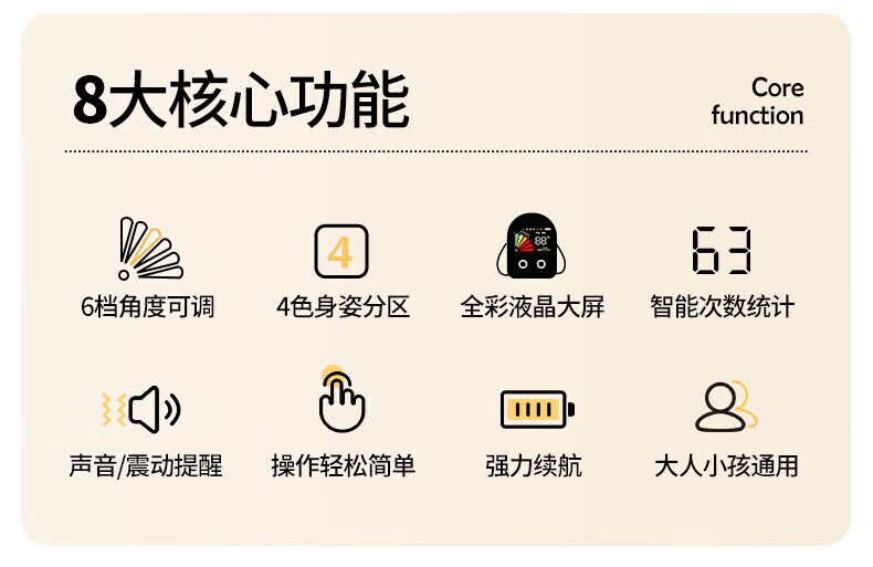 6档角度可调;全彩液晶大屏;智能次数统计