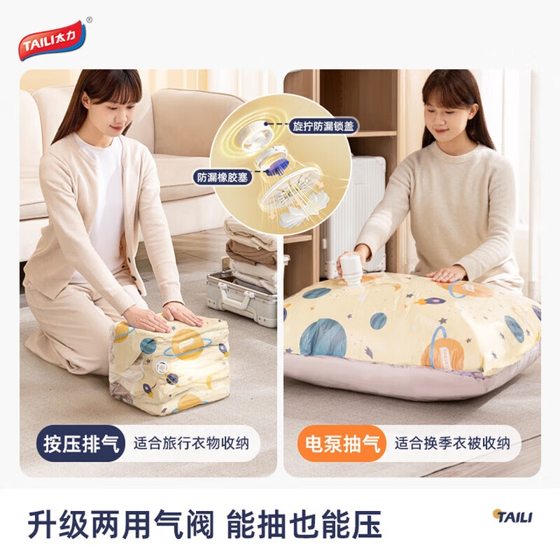 换季衣被,一袋装下;创新封口夹,一次就密封;双层密封条设计,严防漏气;材质坚韧,强拉不破