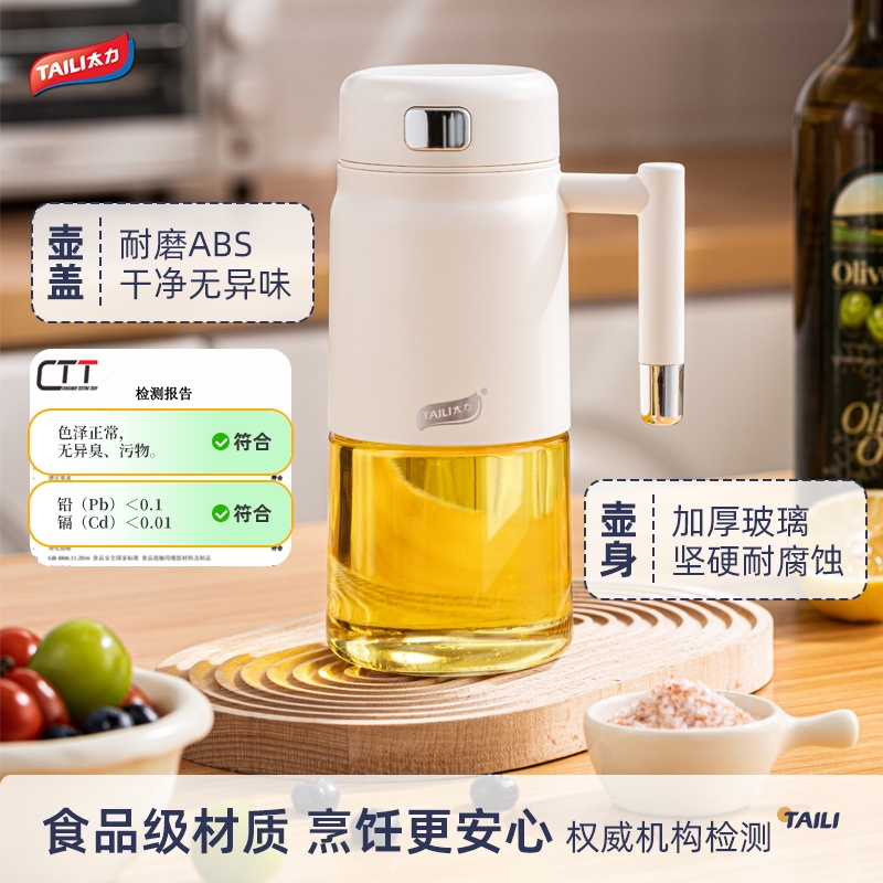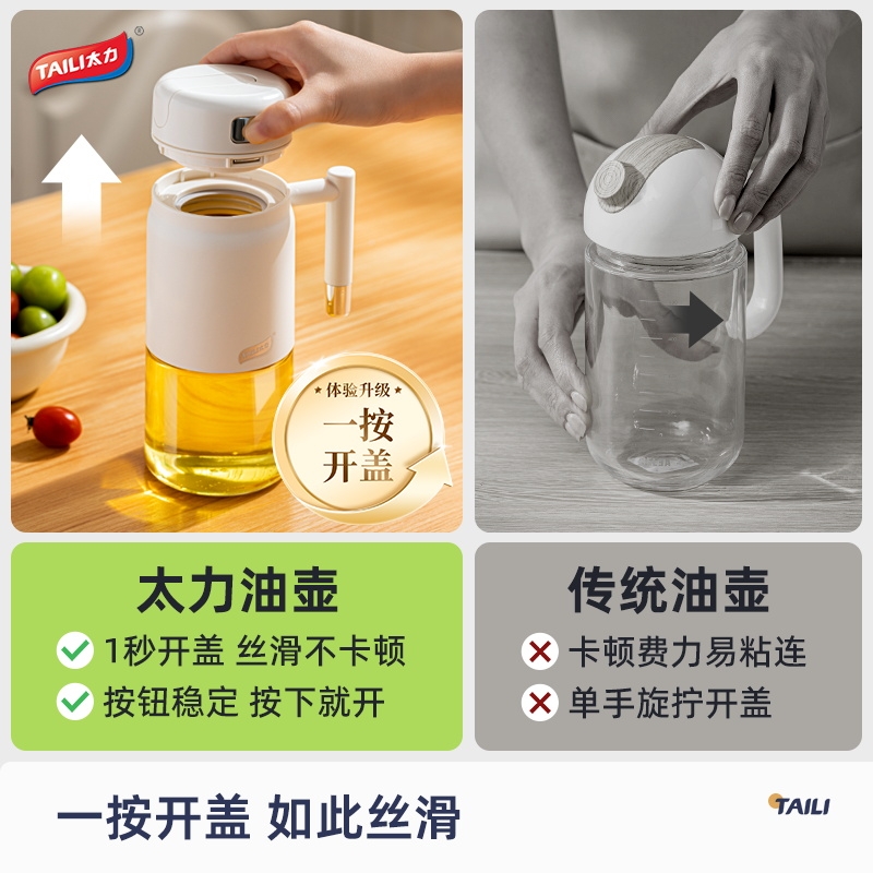 太力油壶 1秒开盖 丝滑不卡顿 ;加宽瓶口 添油0接触;自动开合 倒油丝滑 倾斜即开 放置即合;外扩型油嘴,自动回吸最后一滴油;壶盖耐磨ABS干净无异味 壶身加厚玻璃 坚硬耐腐蚀