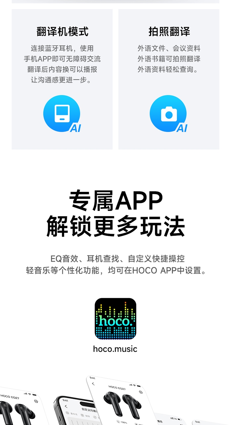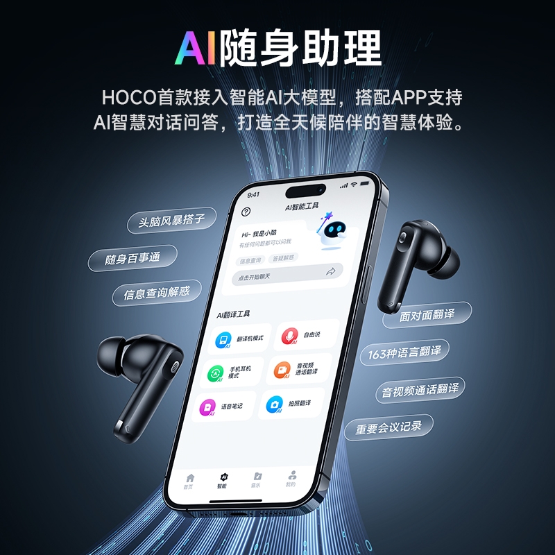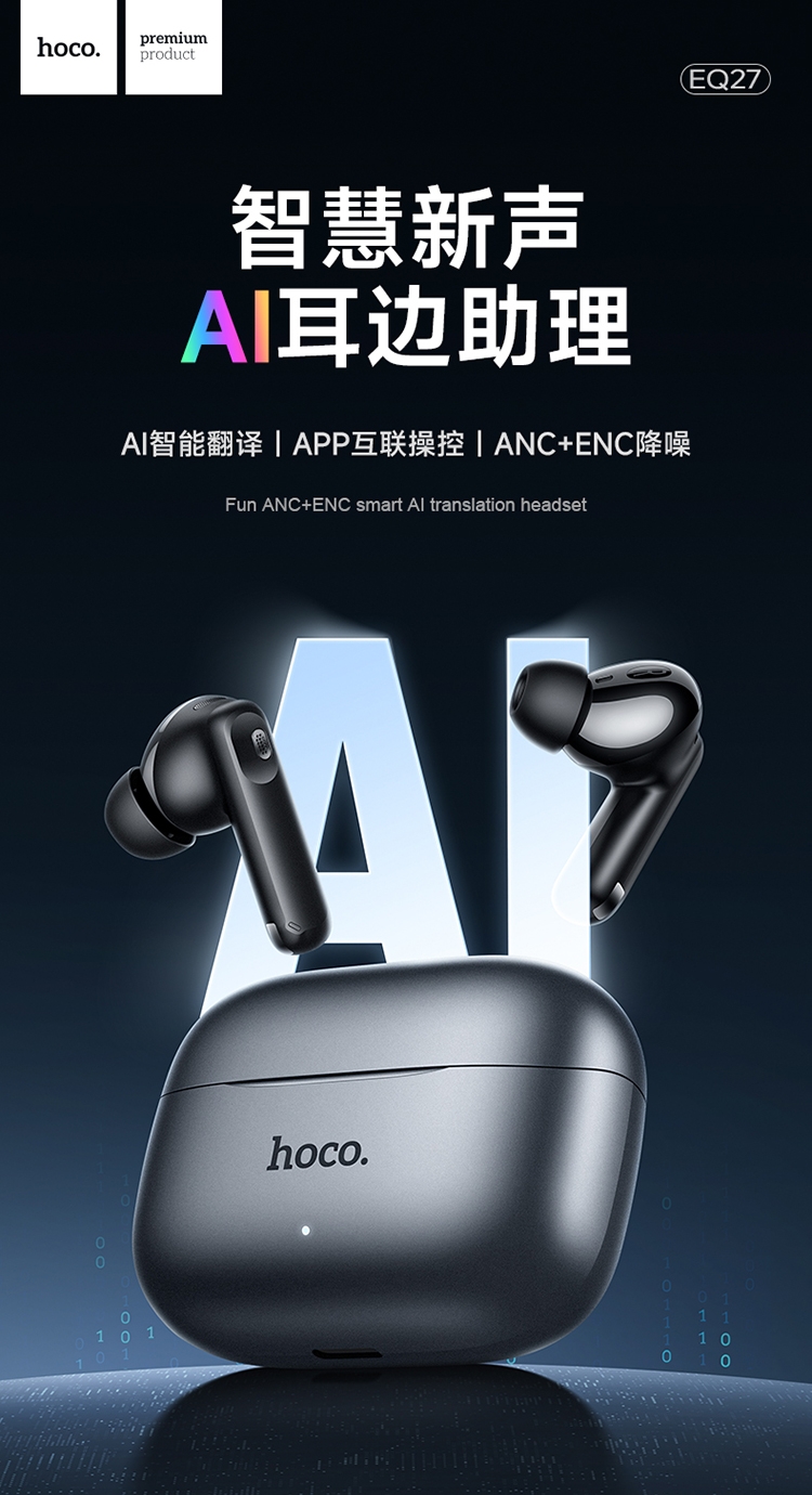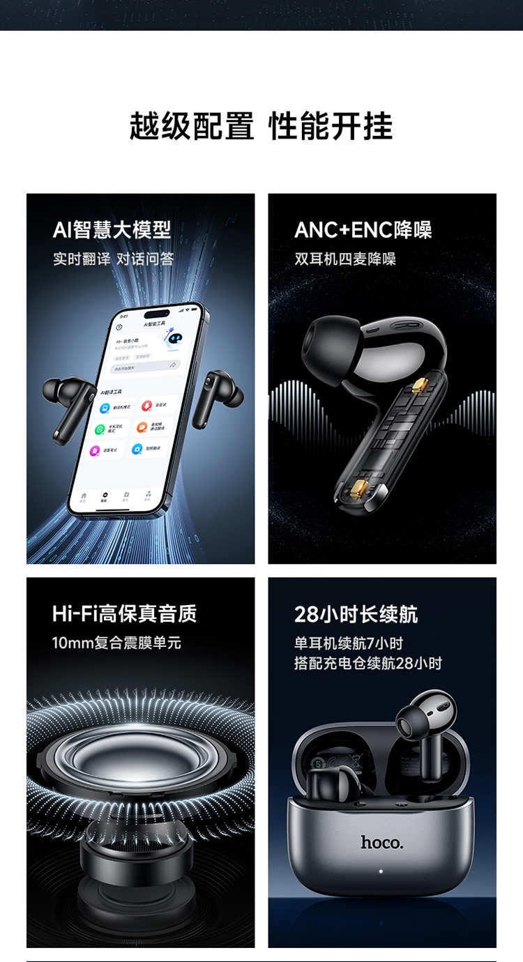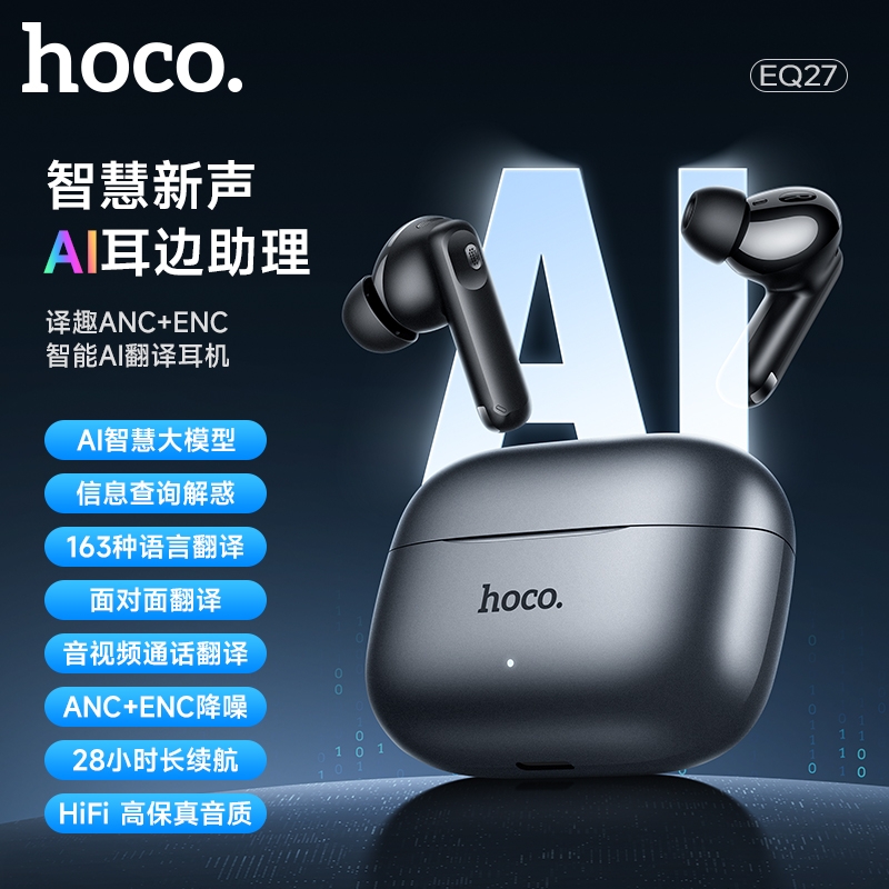 浩酷首款智能AI翻译耳机;搭配hoco.music APP使用可获得更多功能;支持ANC+ENC降噪