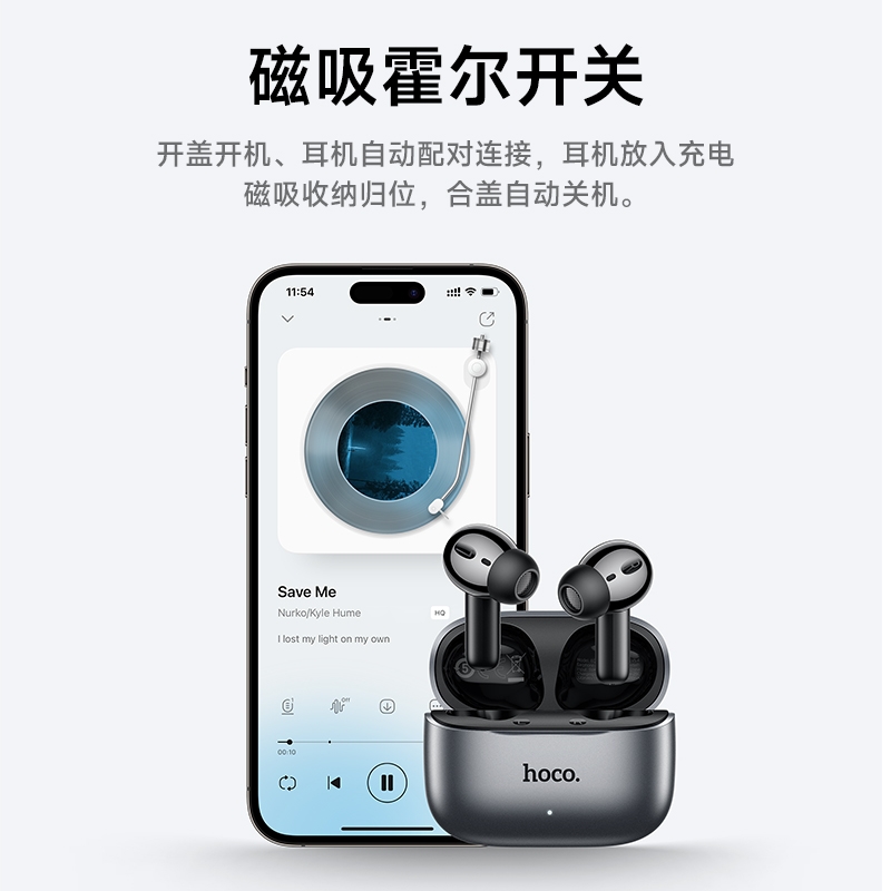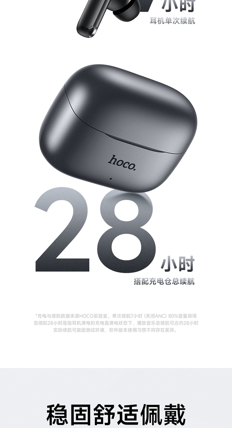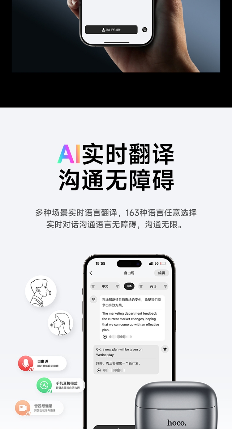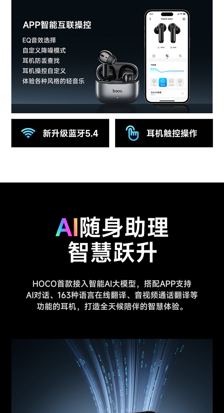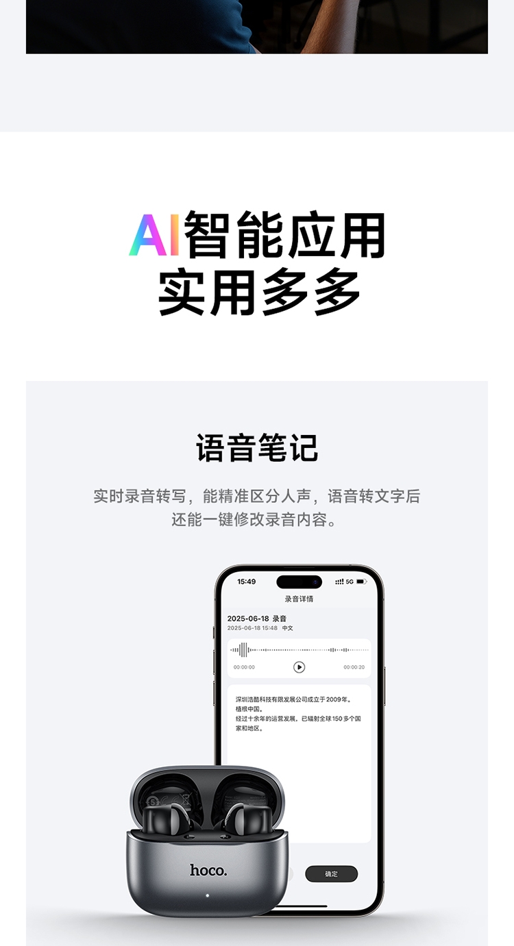 浩酷首款智能AI翻译耳机;搭配hoco.music APP使用可获得更多功能;支持ANC+ENC降噪