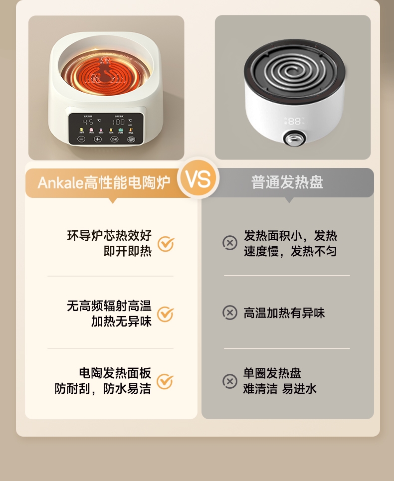 全彩功能图标,4个触摸按健,熄屏隐藏功能 ;800W,电陶炉发热盘加热;实时温度显示, 一键旋钮加触摸按键控制