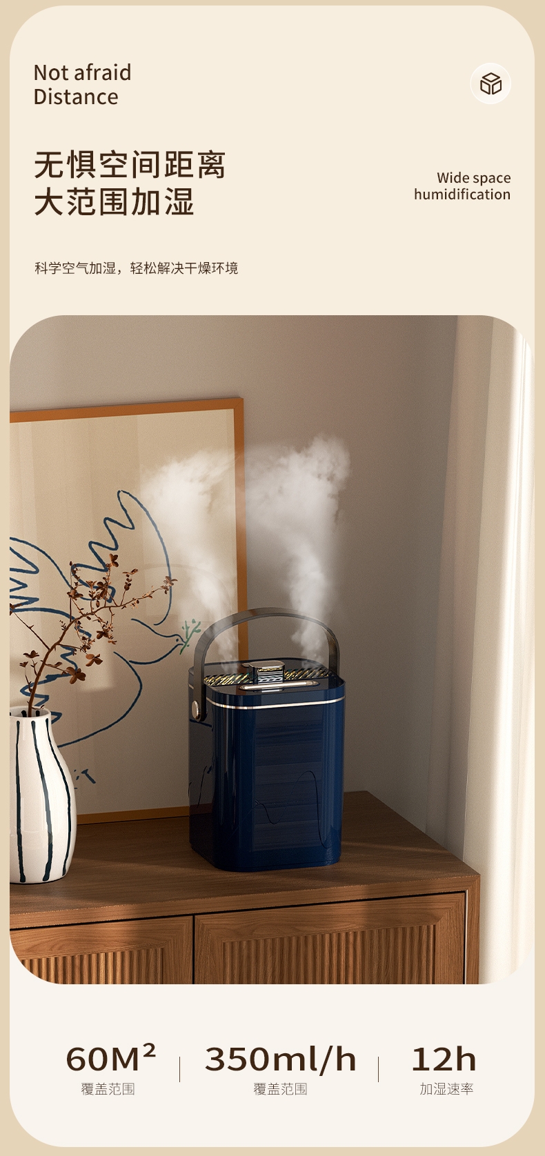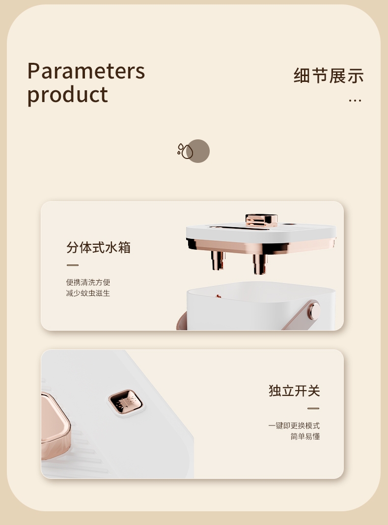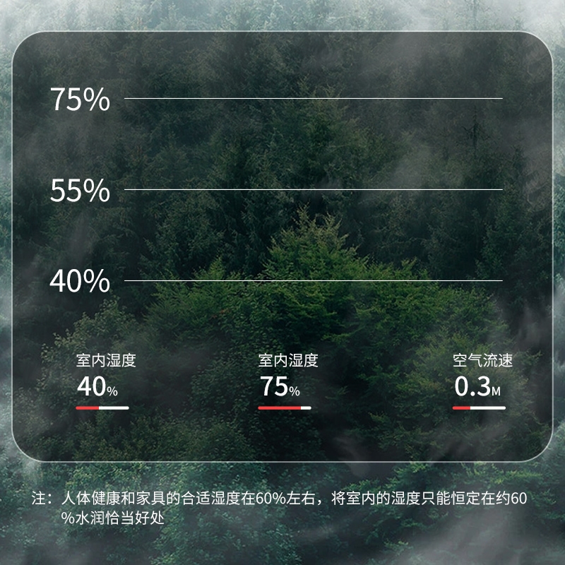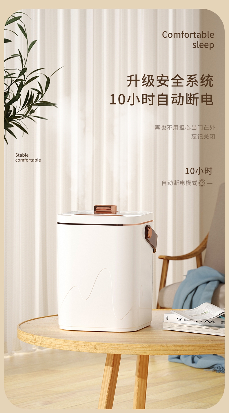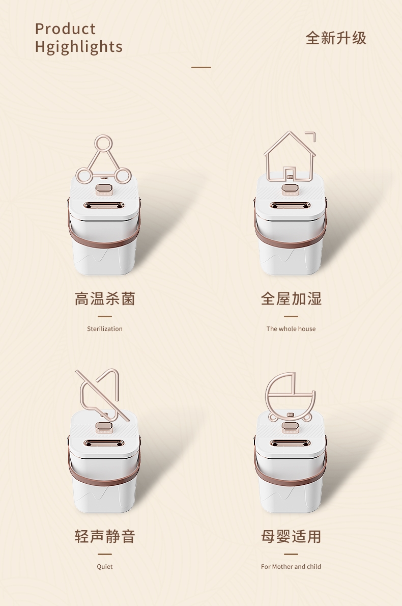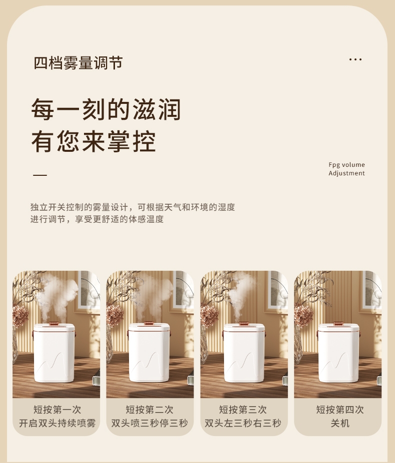 1.8L双喷头加湿器;十小时自动断电保护;四挡雾量调节加灯光氛围小夜灯
