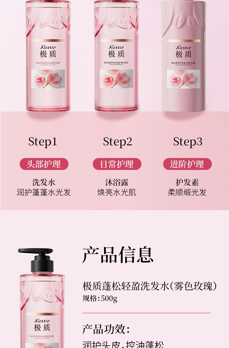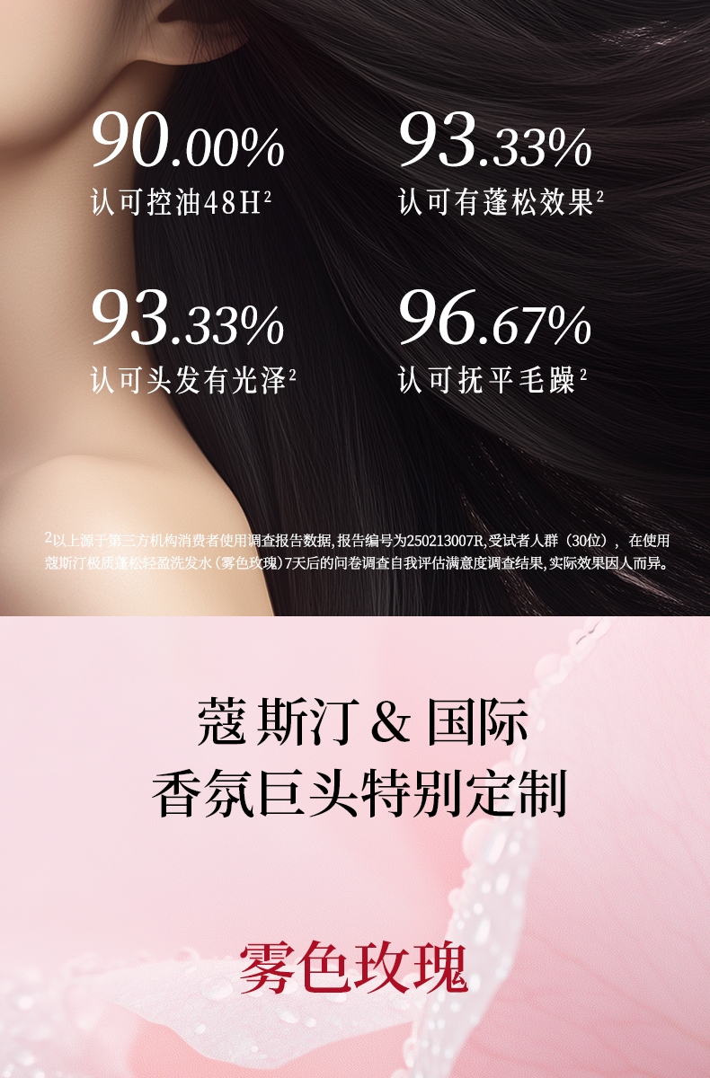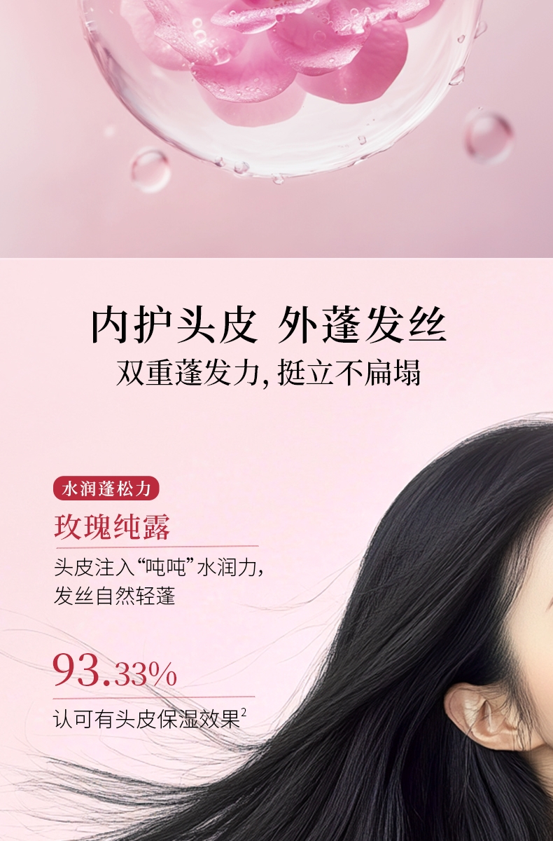 50%玫瑰花水足量添加养护头皮;辛酰甘氨酸能主动调控头皮出油速度,抑制及延缓油脂生;48小时留香