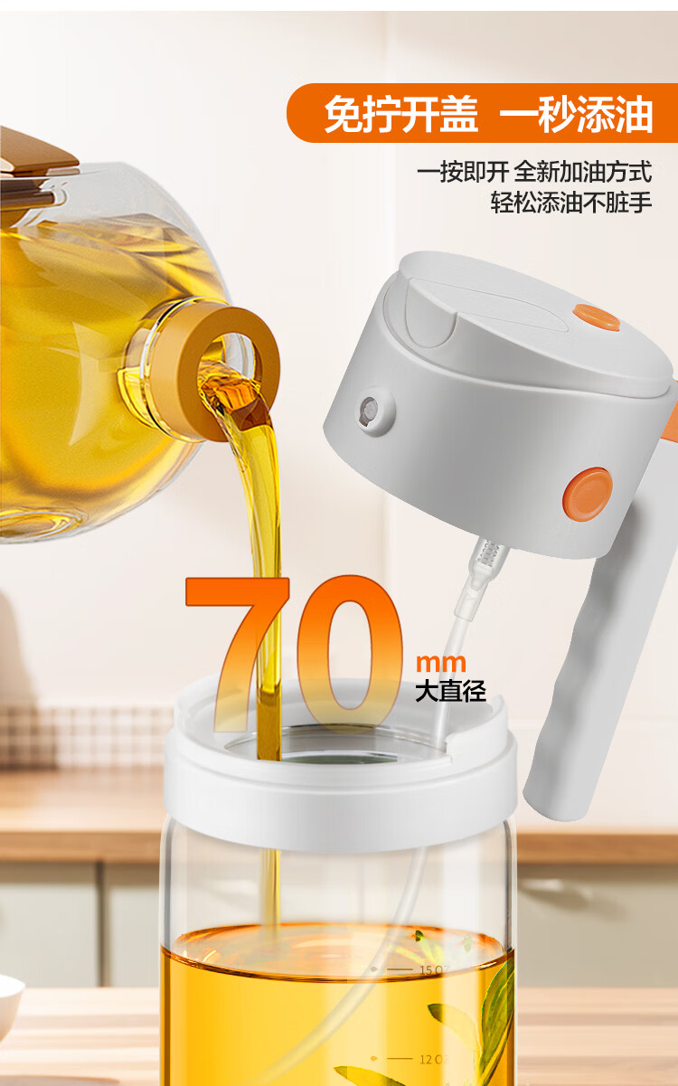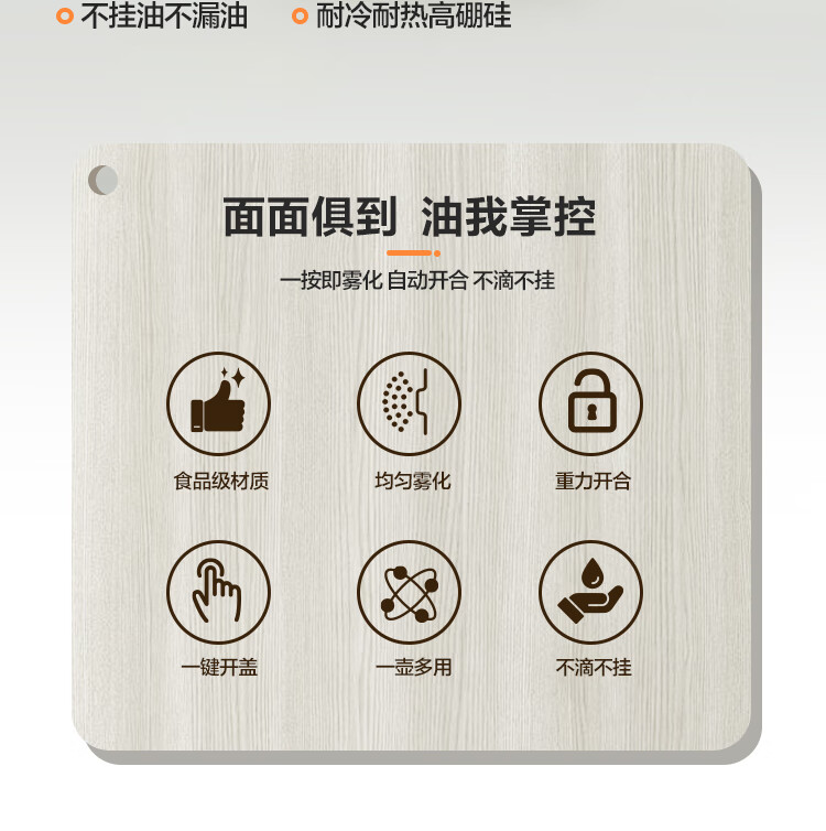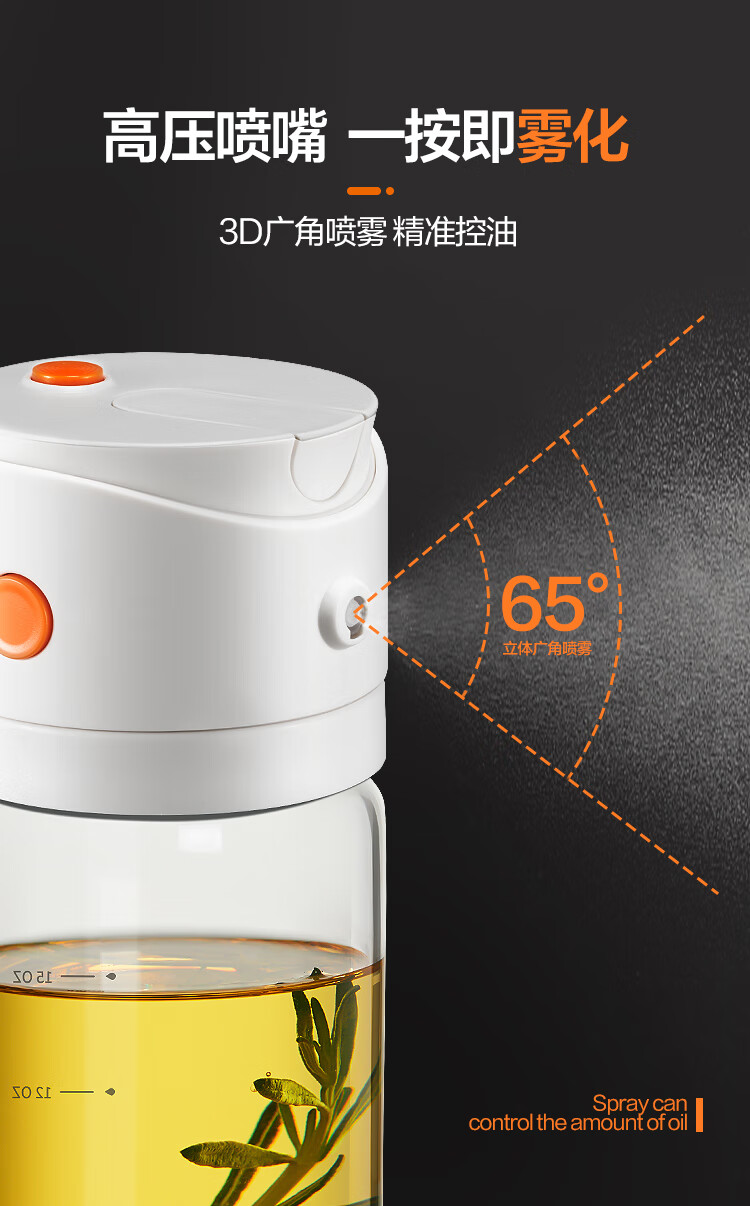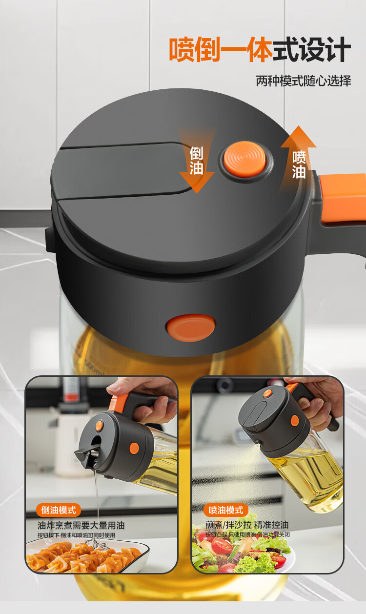 第三代升级 喷倒一体雾化 强力雾化,拧开盖;面面俱到 油我掌控 一按即雾化 自动开合 不滴不挂;重力开合 精准控油 流畅倒油 瓶身不油腻