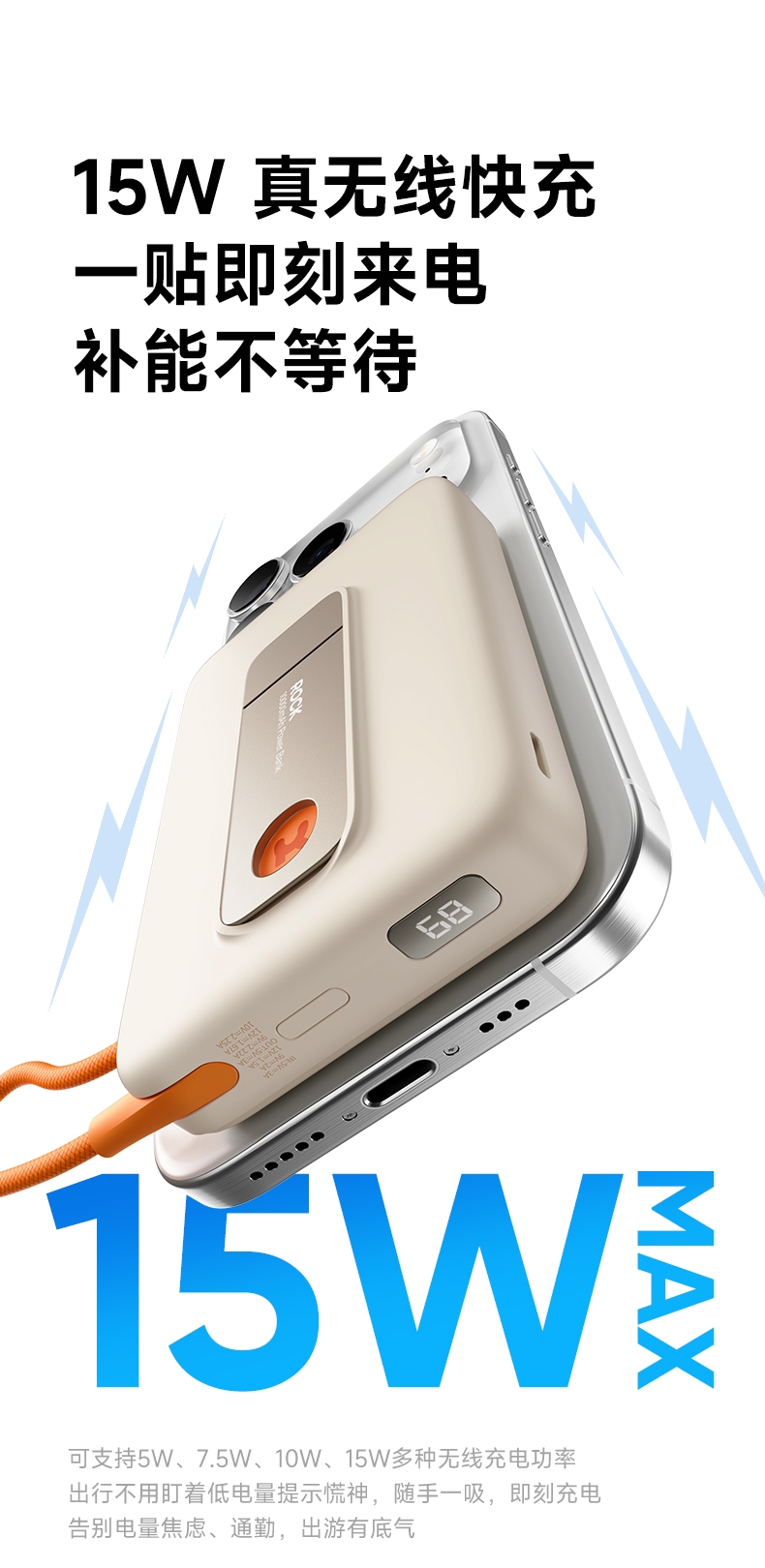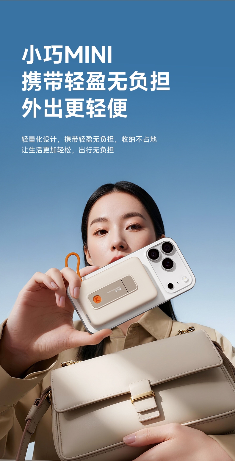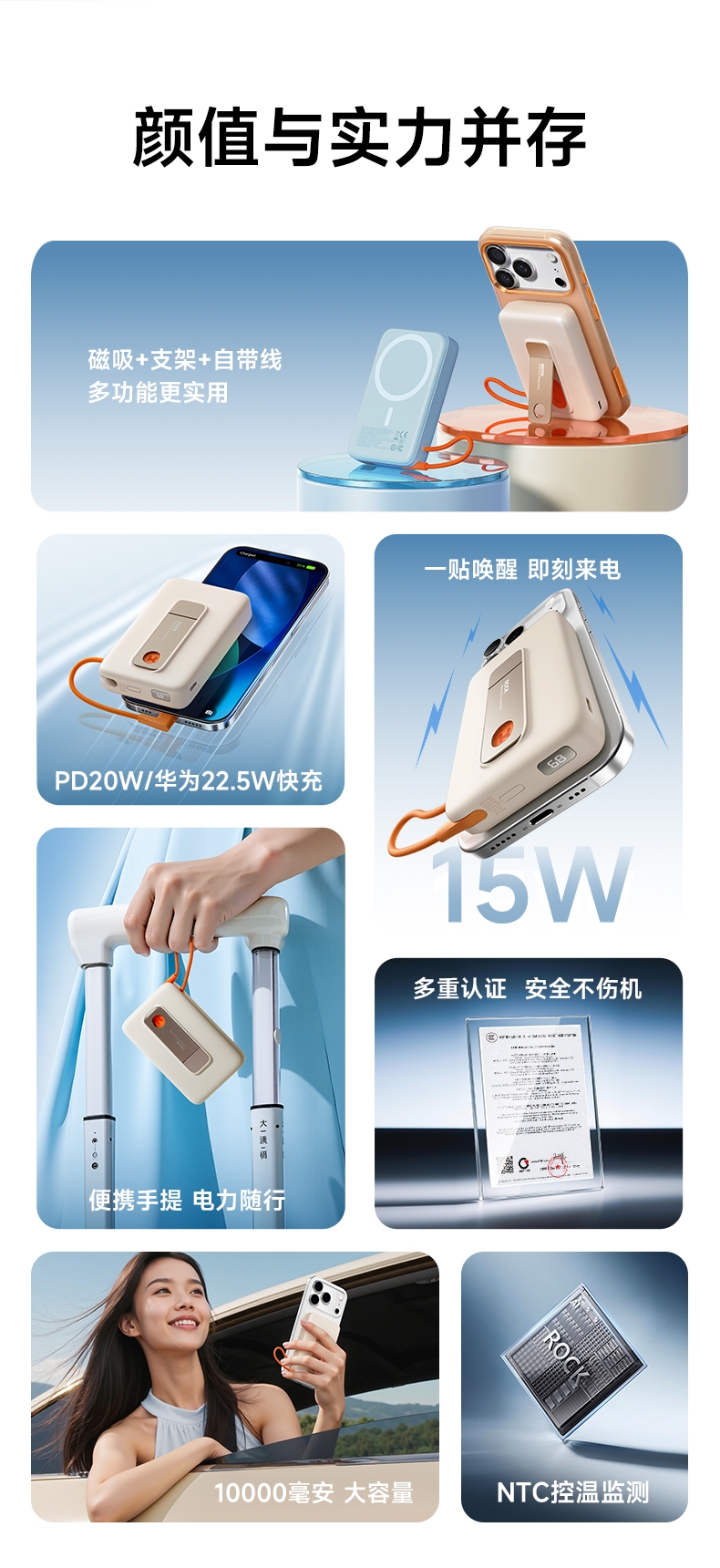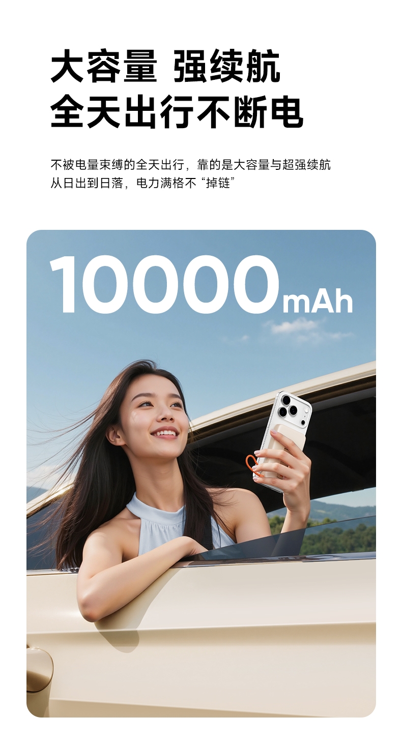 磁吸无线充+支架+自带线多功能更实用;;自带线可双向充电、可以手提,出门无需带线更便捷;;自带金属支架,可调节角度横竖屏办公、观影更舒适;;内置NTC智芯监测,实时控温+涓流保护;新国标电芯+国标质检CCC/CE/FCC等多重认证