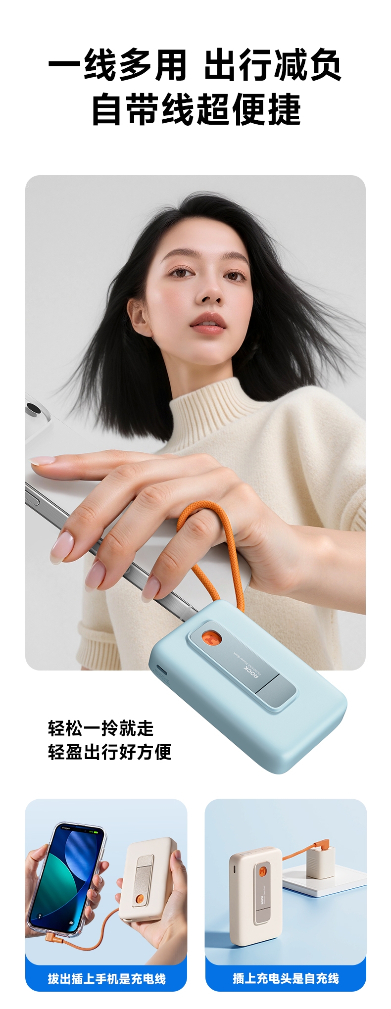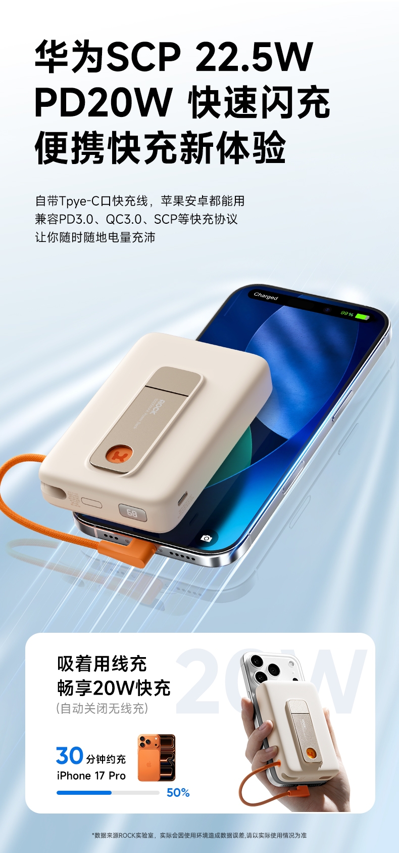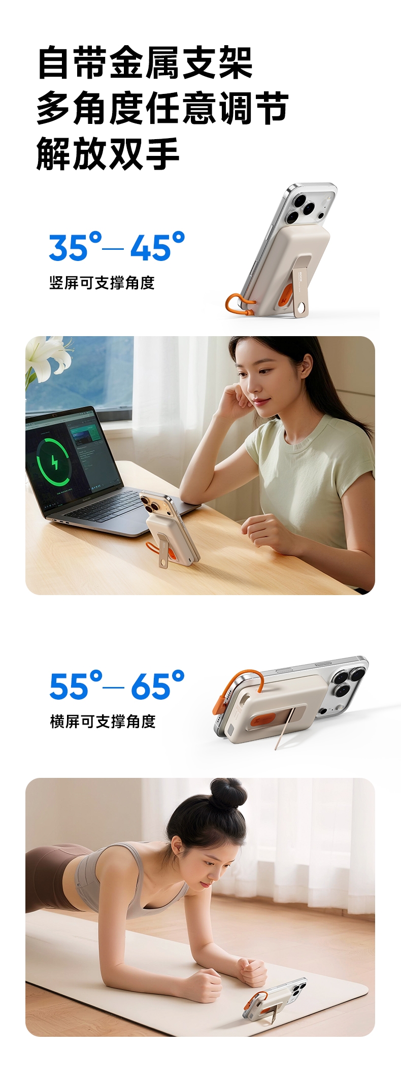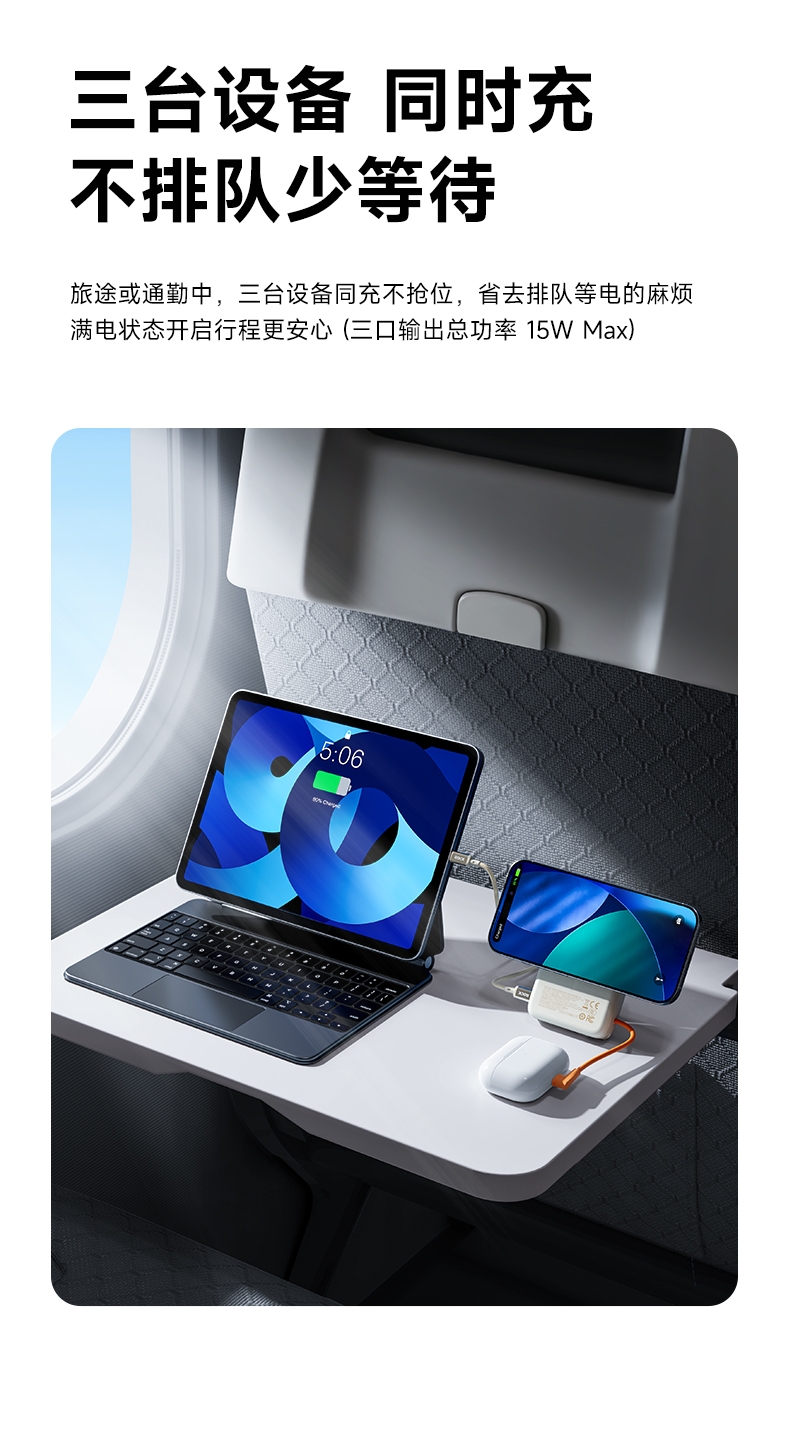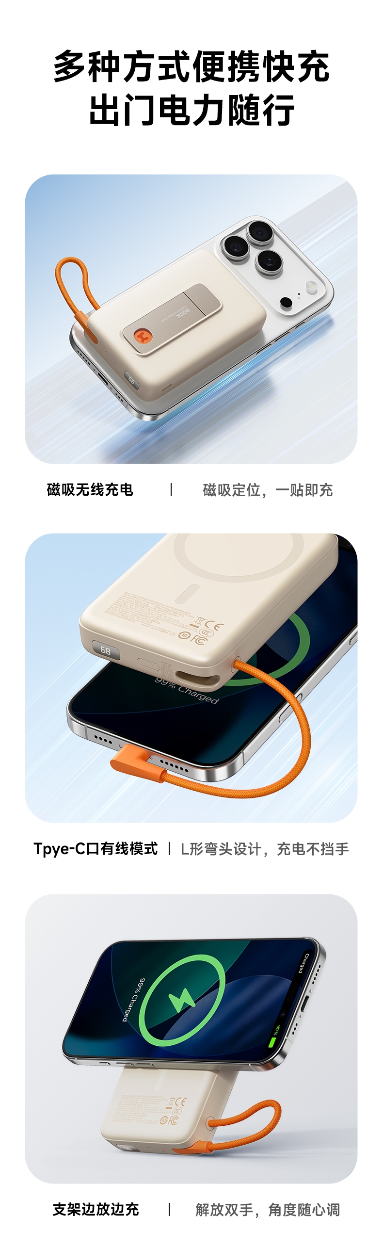 磁吸无线充+支架+自带线多功能更实用;;自带线可双向充电、可以手提,出门无需带线更便捷;;自带金属支架,可调节角度横竖屏办公、观影更舒适;;内置NTC智芯监测,实时控温+涓流保护;新国标电芯+国标质检CCC/CE/FCC等多重认证