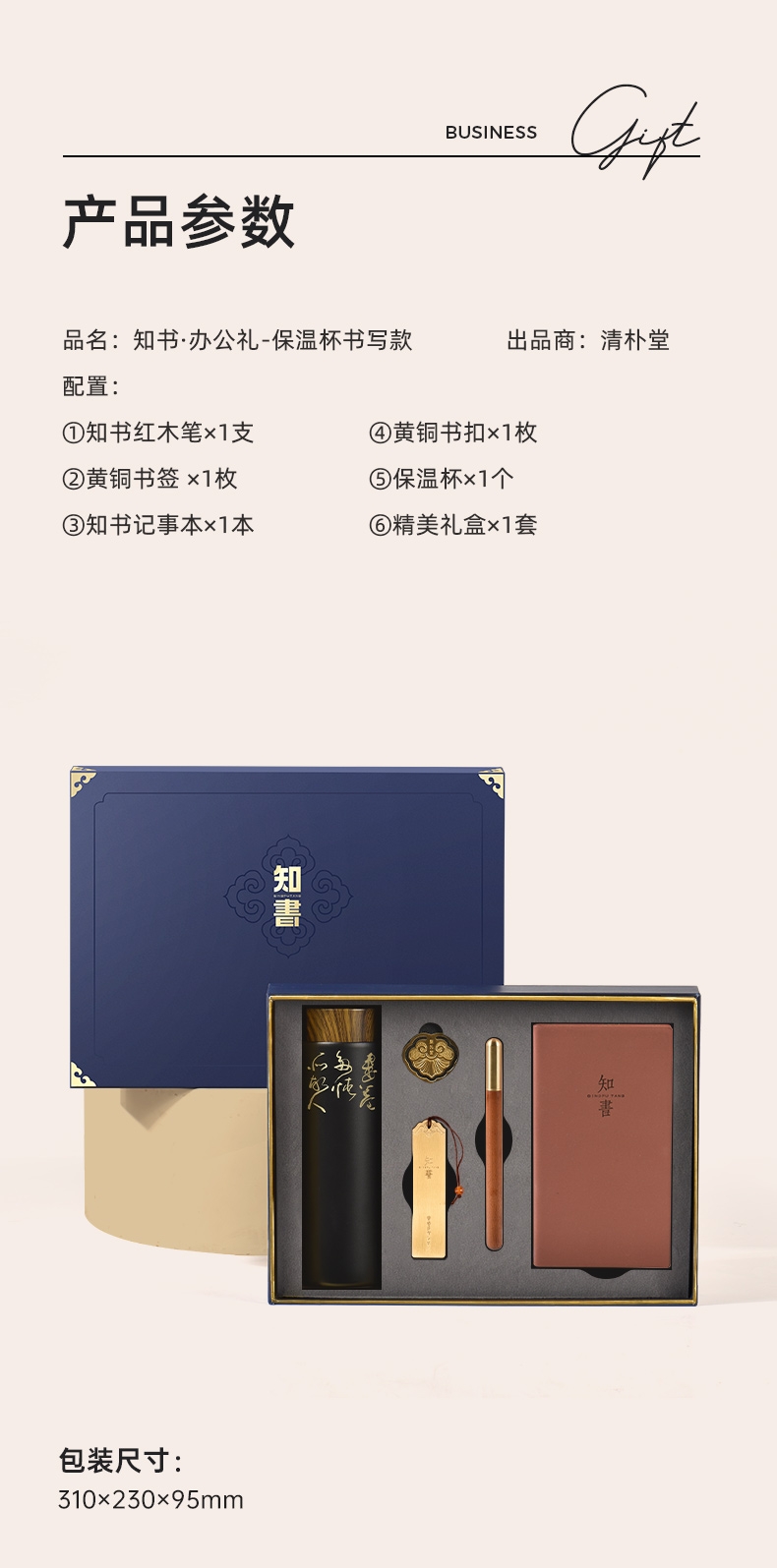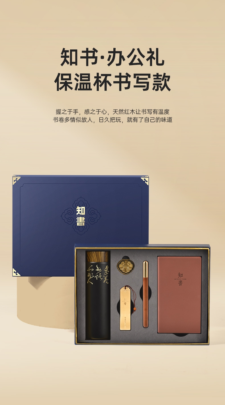 配置:①知书红木笔×1支 ②黄铜书签 ×1枚 ③知书记事本×1本 ④黄铜书扣×1枚 ⑤保温杯×1个 ⑥精美礼盒×1套