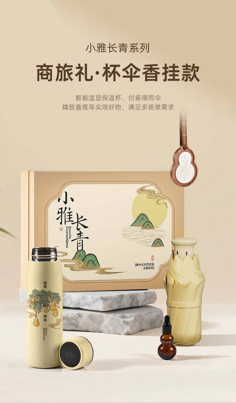配置:① 福禄绵延·温显杯(450ml) ×1个 ② 小雅·晴雨伞×1个 ③ 葫芦·精油(10ml)×1个 ④ 葫芦·石膏香挂×1个 ⑤ 小雅·新中式礼盒手袋×1套