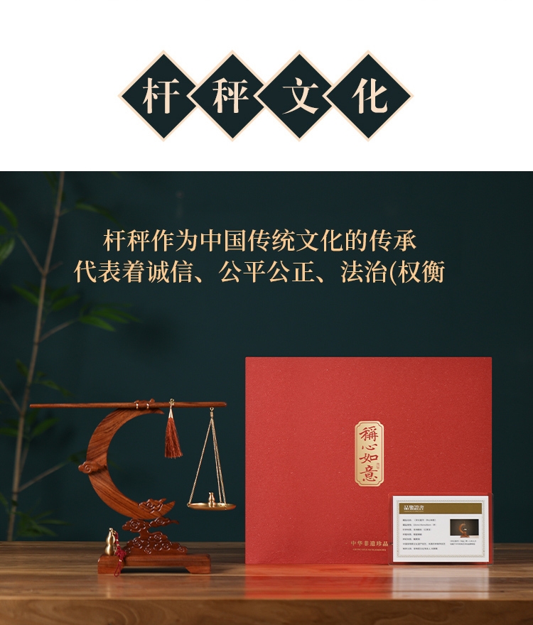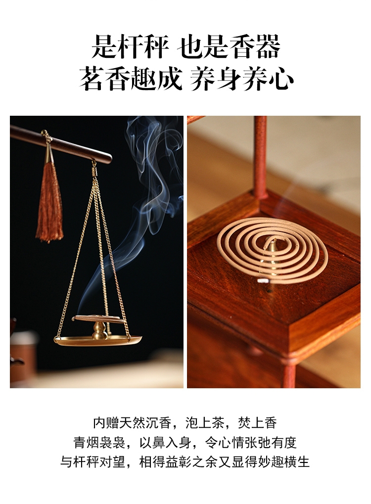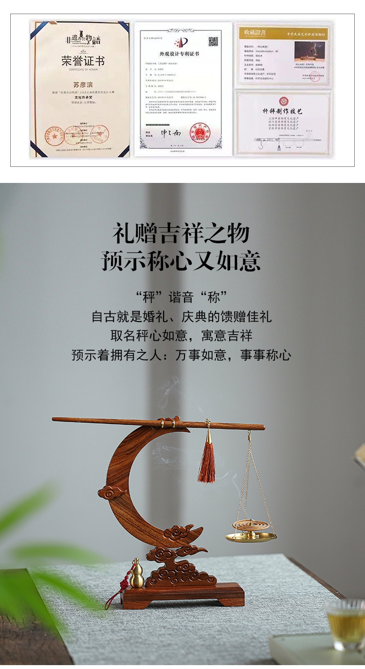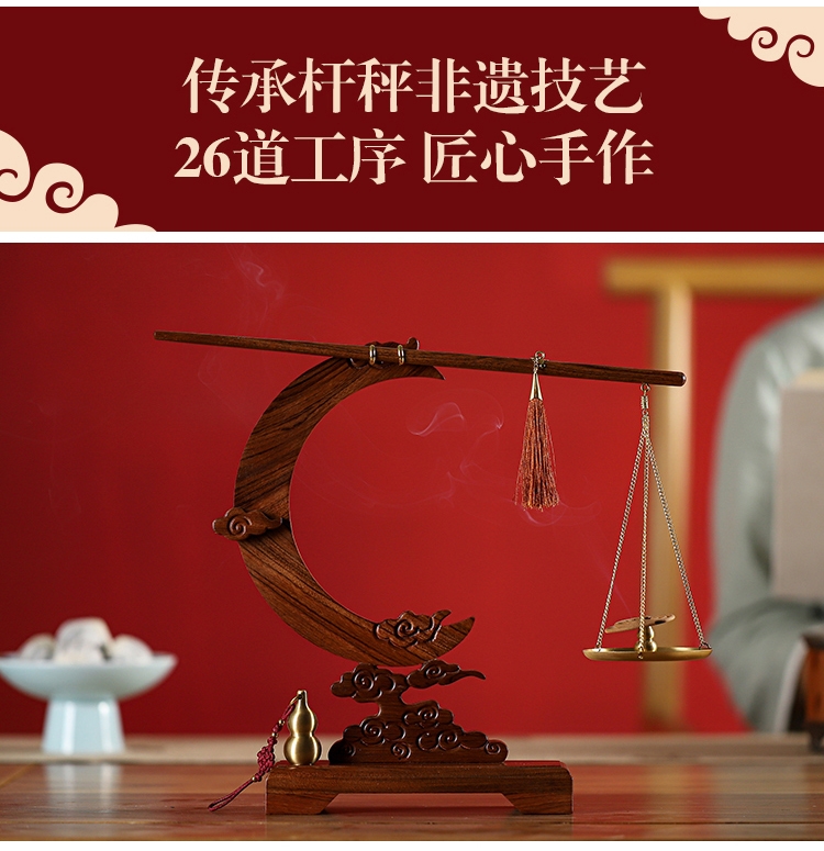 配置:① 非遗手工红木杆秤×1套(黄铜秤盘丨收藏证书丨文化手册) ② 祥云望月·红木底座×1个 ③ 葫芦香插×1个 ④ 中式盘香×6包 ⑤ 精致礼盒手袋×1套