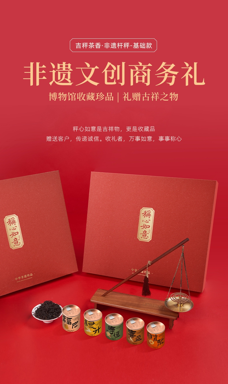 配置:① 非遗手工红木杆秤×1套(黄铜秤盘丨收藏证书丨文化手册) ② 吉祥秤·红木底座红木底座×1个 ③ 葫芦香插×1个 ④ 中式盘香×2包 ⑤ 五福地标茶×5罐 (福·甜芽小种、禄·九龙大白、寿·陈皮白茶、喜·陈皮普洱、财·状元大红袍) ⑥ 精致礼盒手袋×1套