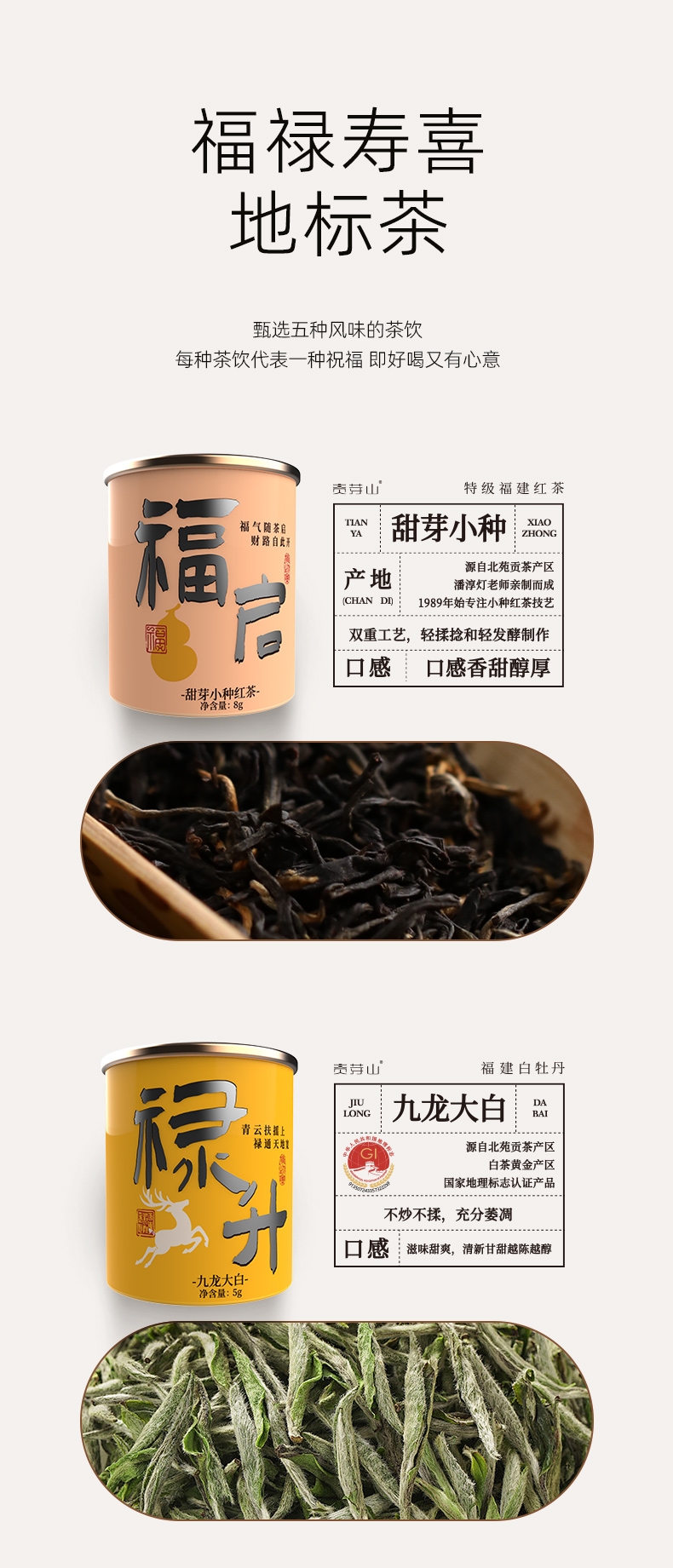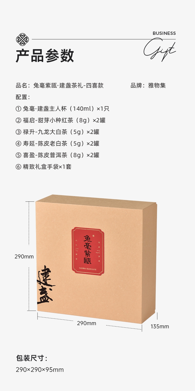 配置:① 兔毫·建盏主人杯(140ml)×1只 ② 福启-甜芽小种红茶(8g)×2罐 ③ 禄升-九龙大白茶(5g)×2罐 ④ 寿延-陈皮老白茶(5g)×2罐 ⑤ 喜盈-陈皮普洱茶(8g)×2罐 ⑥ 精致礼盒手袋×1套