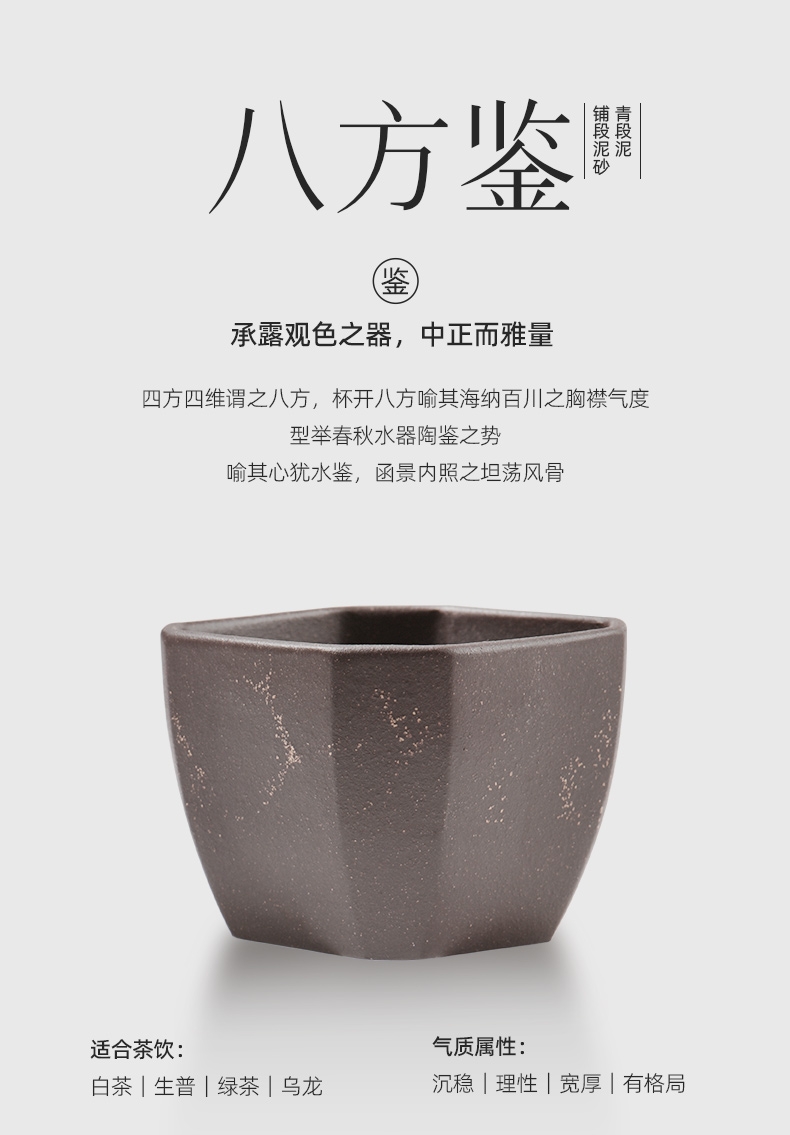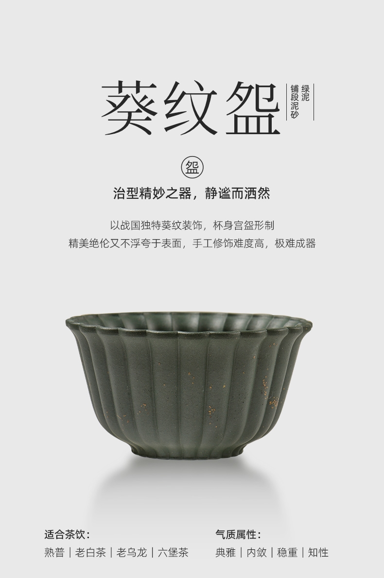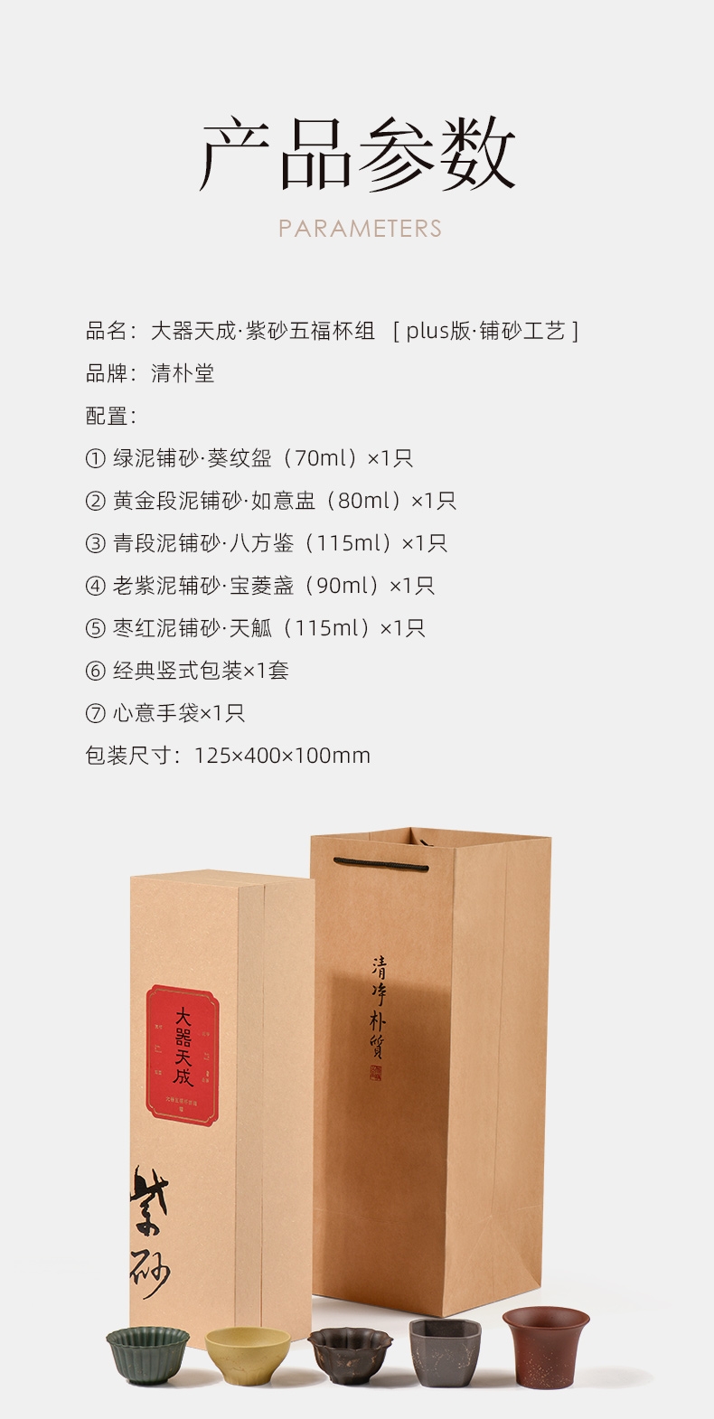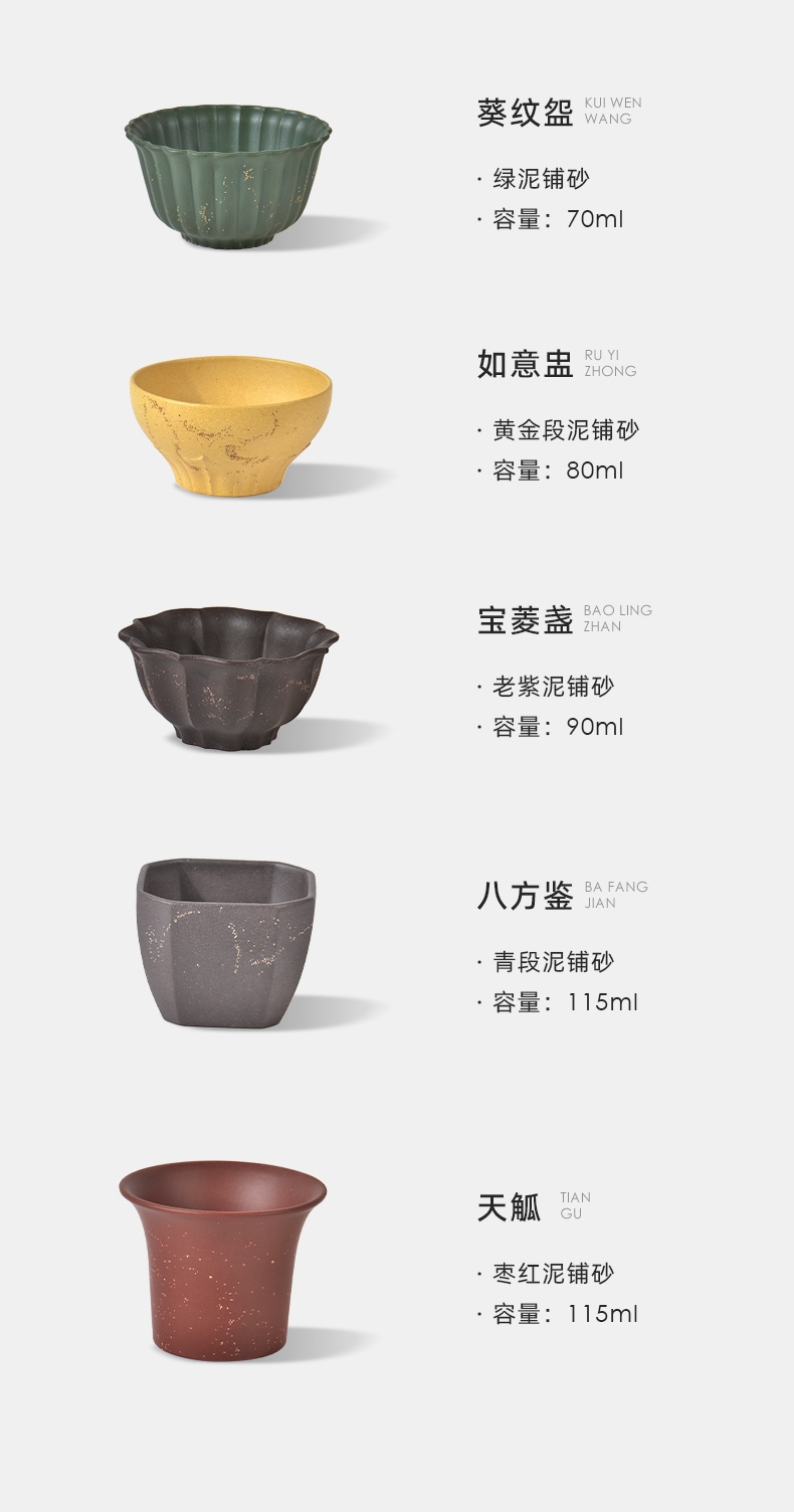 配置:① 葵纹盌-绿泥铺砂 (70ml)×1只 ② 如意盏-黄金段铺砂(80ml)×1只 ③ 八方鉴-青段泥铺砂(90ml)×1只 ④ 宝菱盏-老紫泥铺砂(90ml)×1只 ⑤ 天觚-枣红泥铺砂(115ml)×1只 ⑥ 经典礼盒手袋×1套