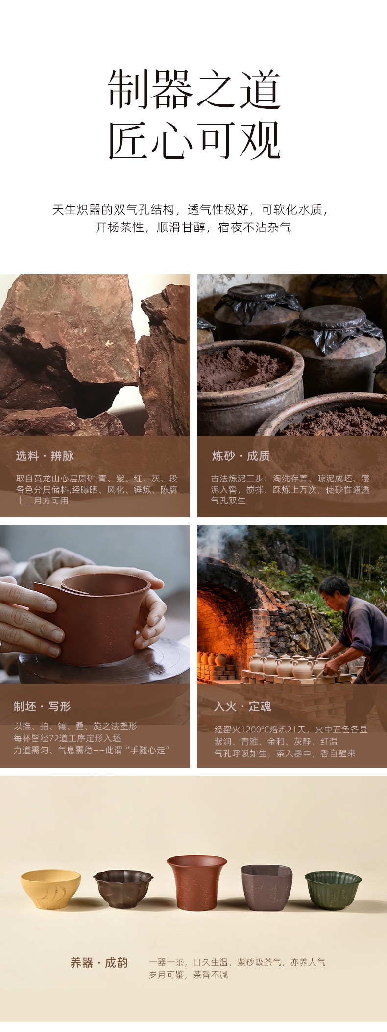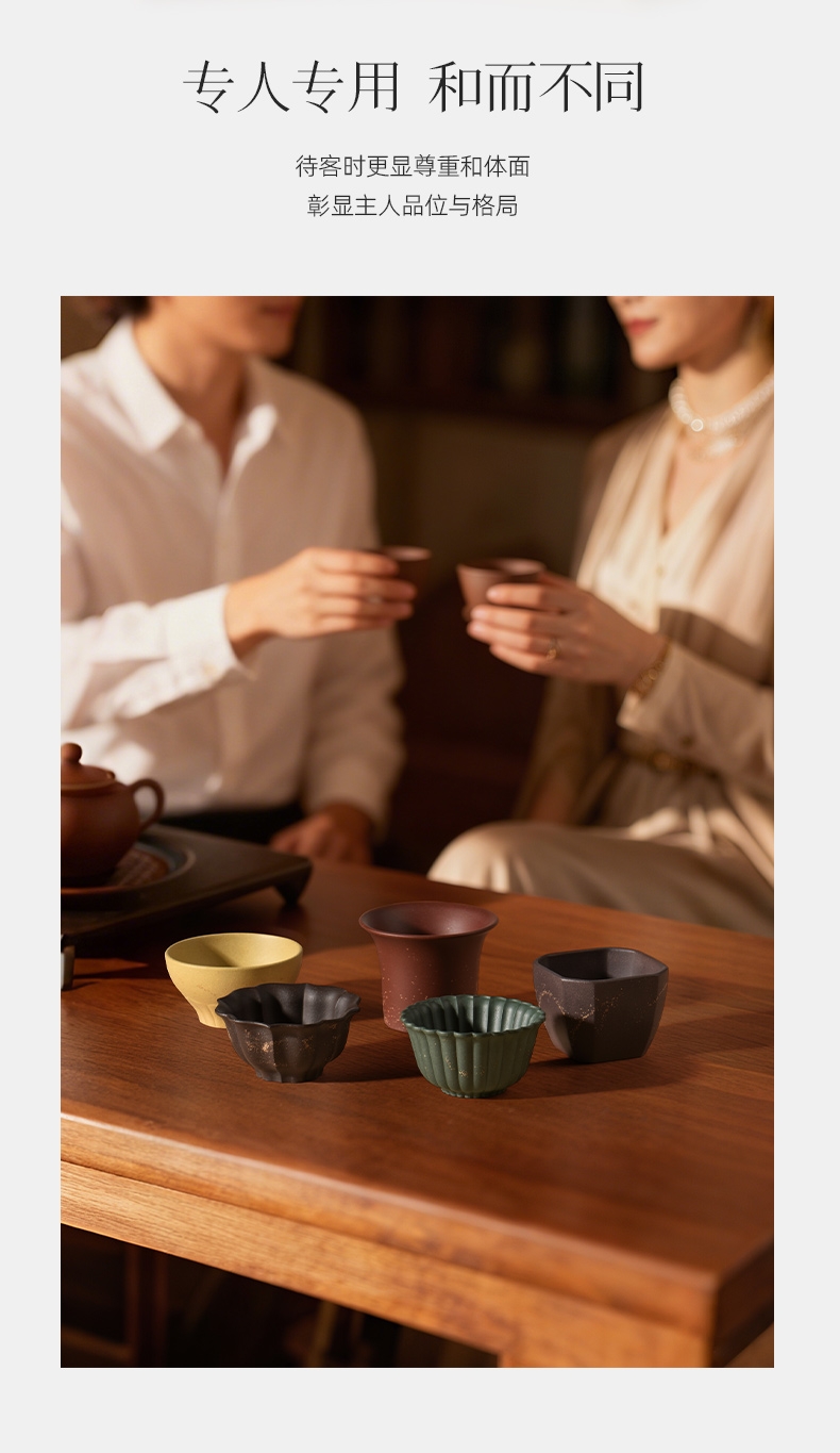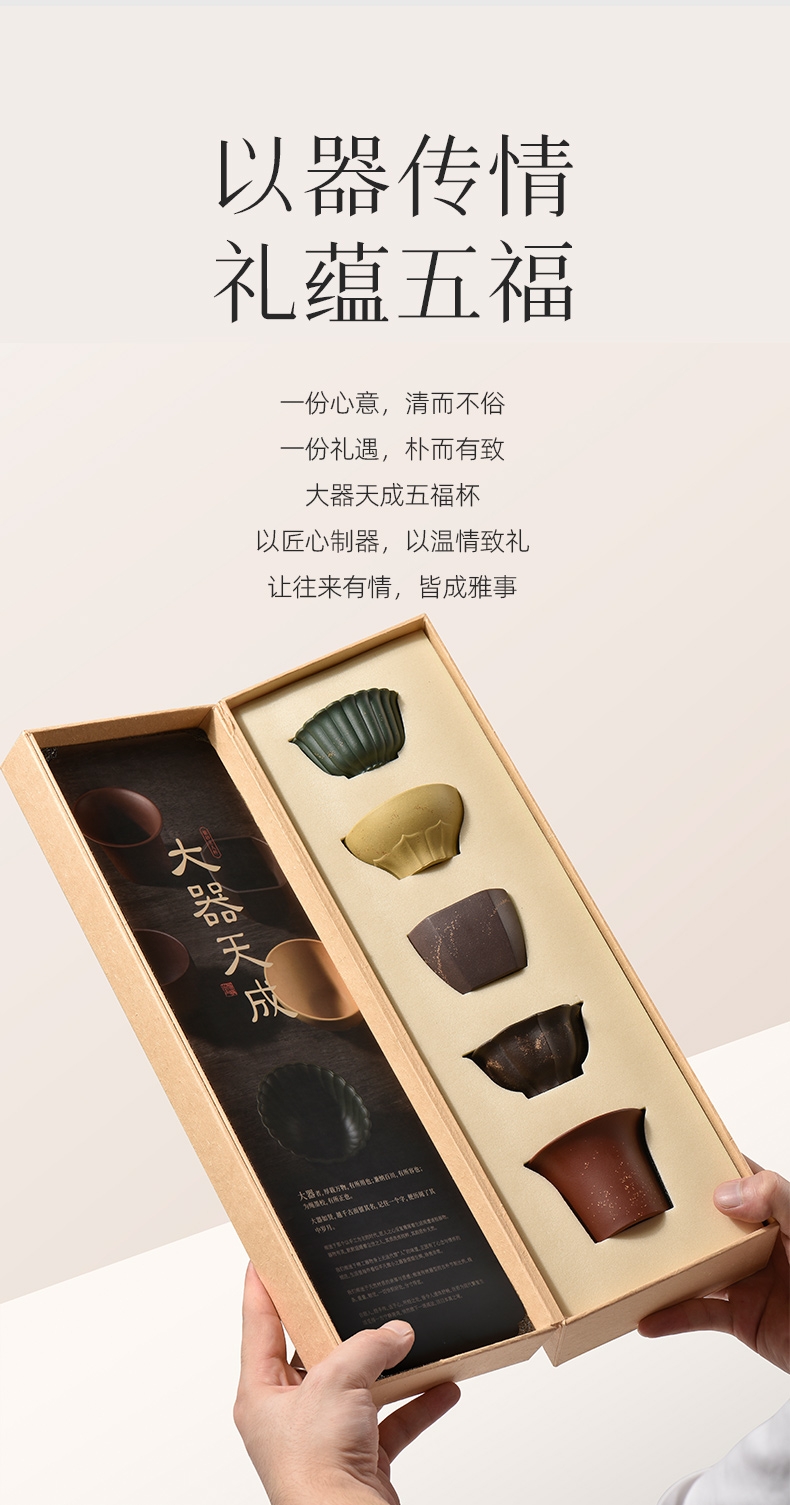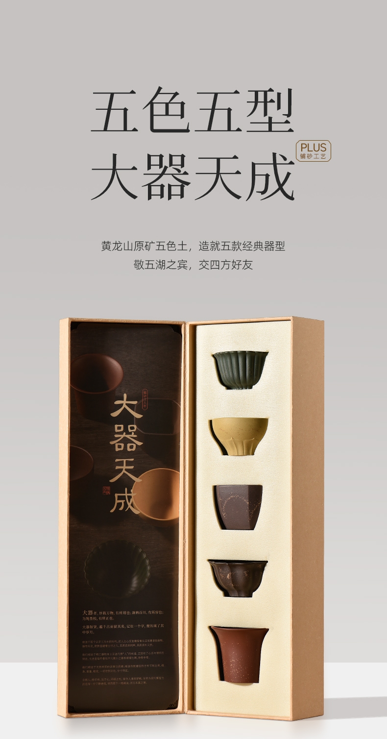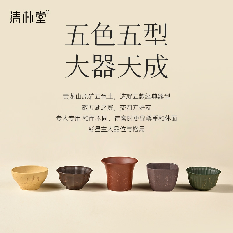 黄龙山五色紫砂泥,制成五形经典器;喻意知交五湖,君子大气和合,专杯待客更显尊贵;创新紫砂五福杯组 五色泥配五色杯