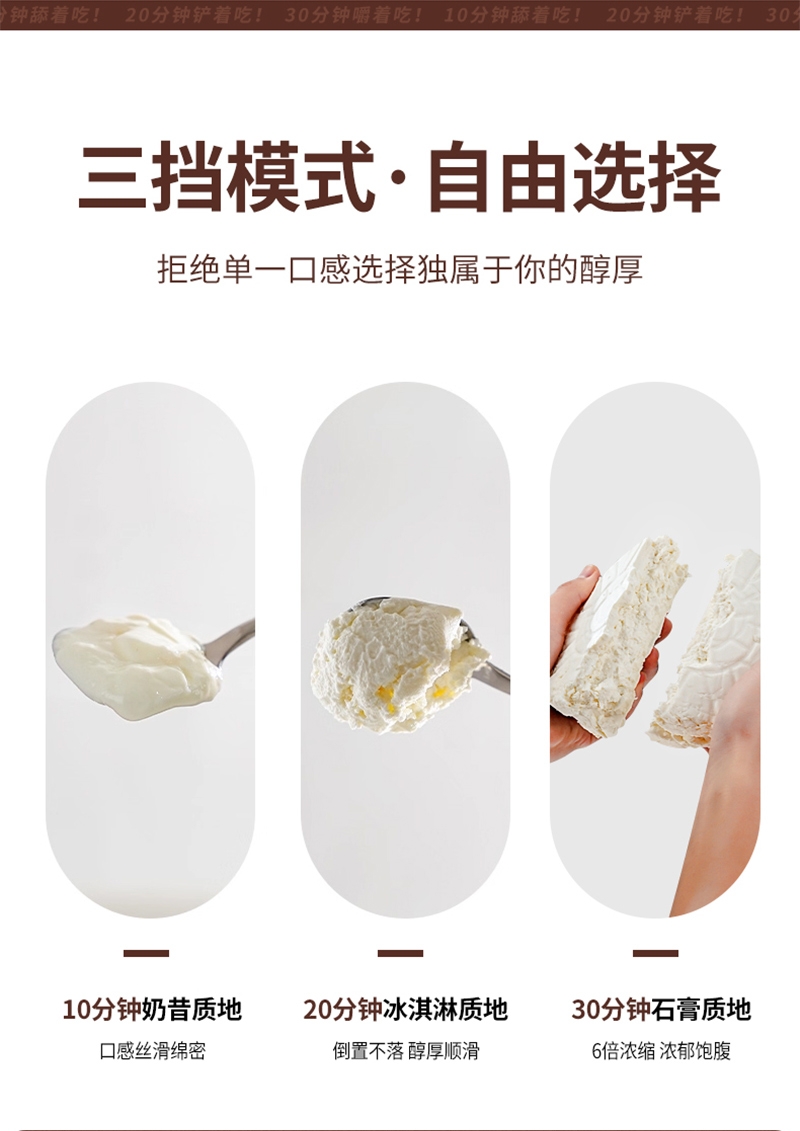 电动智能按压10倍效率萃取,酸奶入口冰凉醇厚;三档模式自由选择10分钟冷萃酸奶20分钟干噎酸奶;30分钟石膏酸奶,可放洗碗机高温清洗。