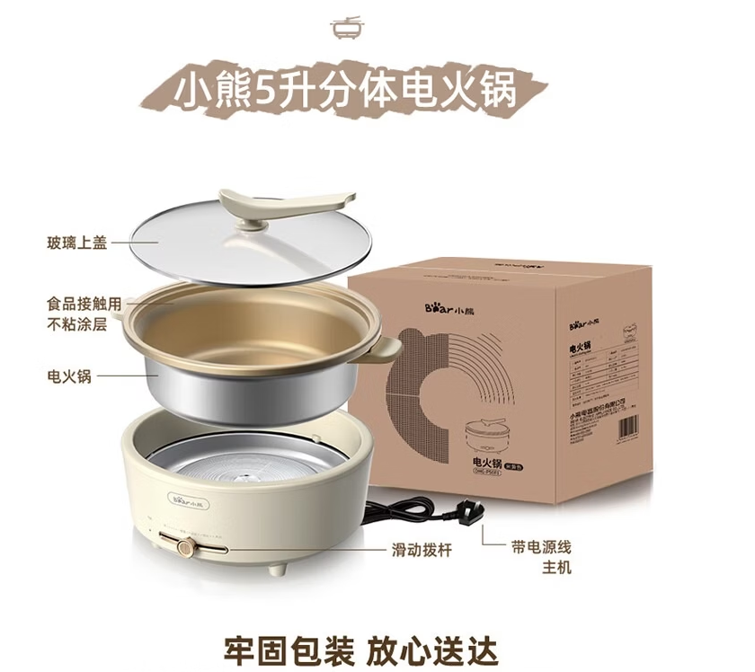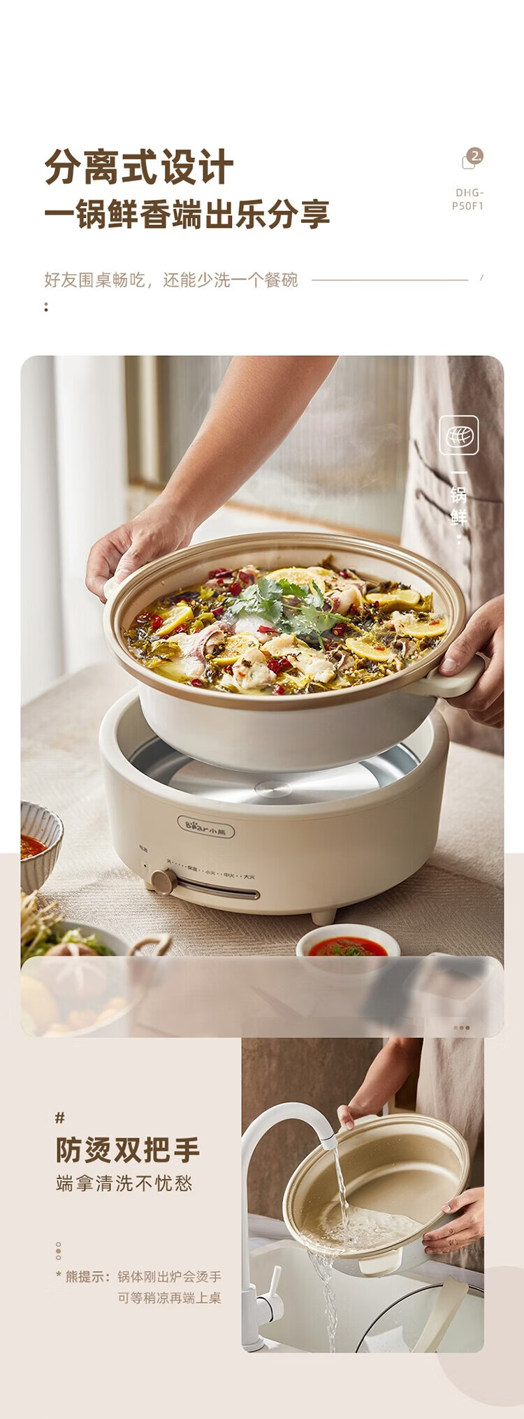 1500W大火力,包裹聚能快沸腾;分体可端洗,餐后清洗不费心;5L大容量,多人聚餐不局促;防烫双把手,端拿轻松免烫伤