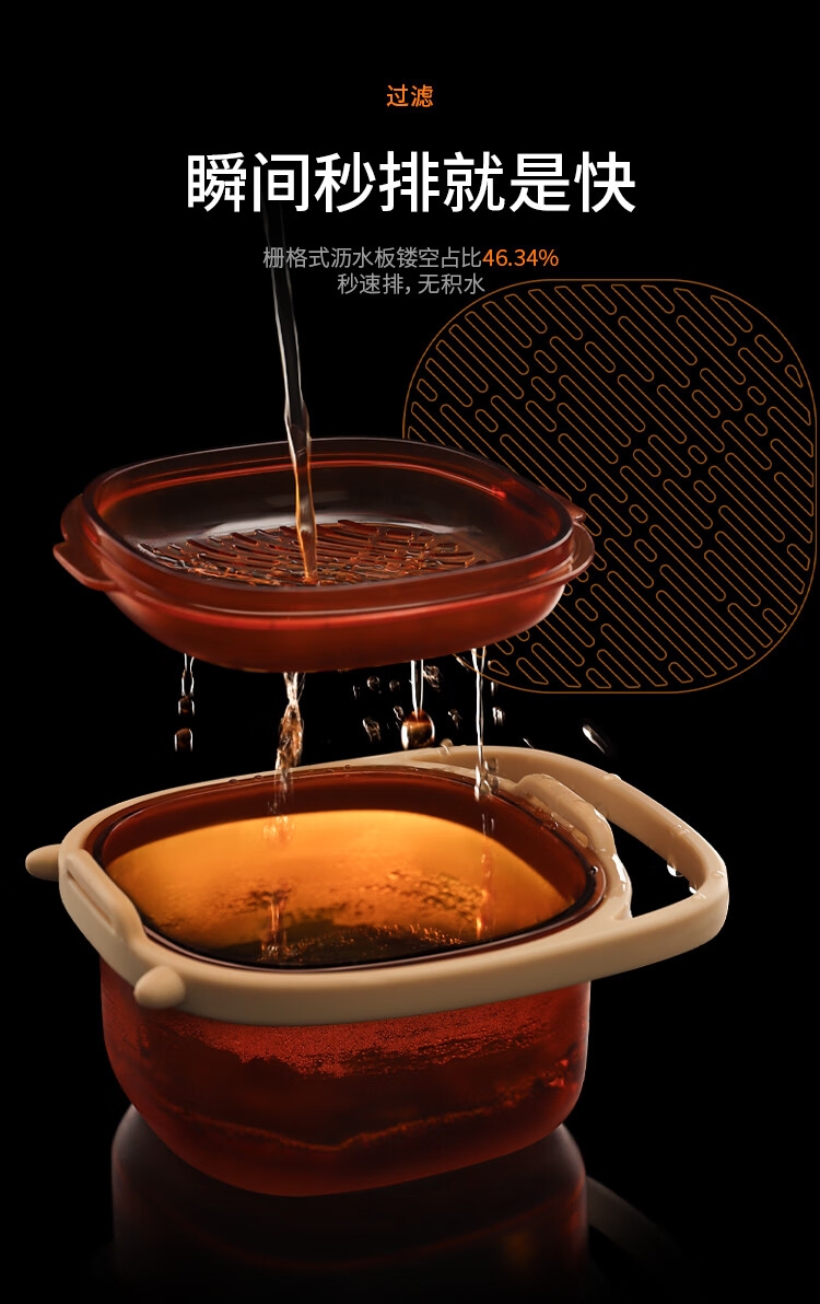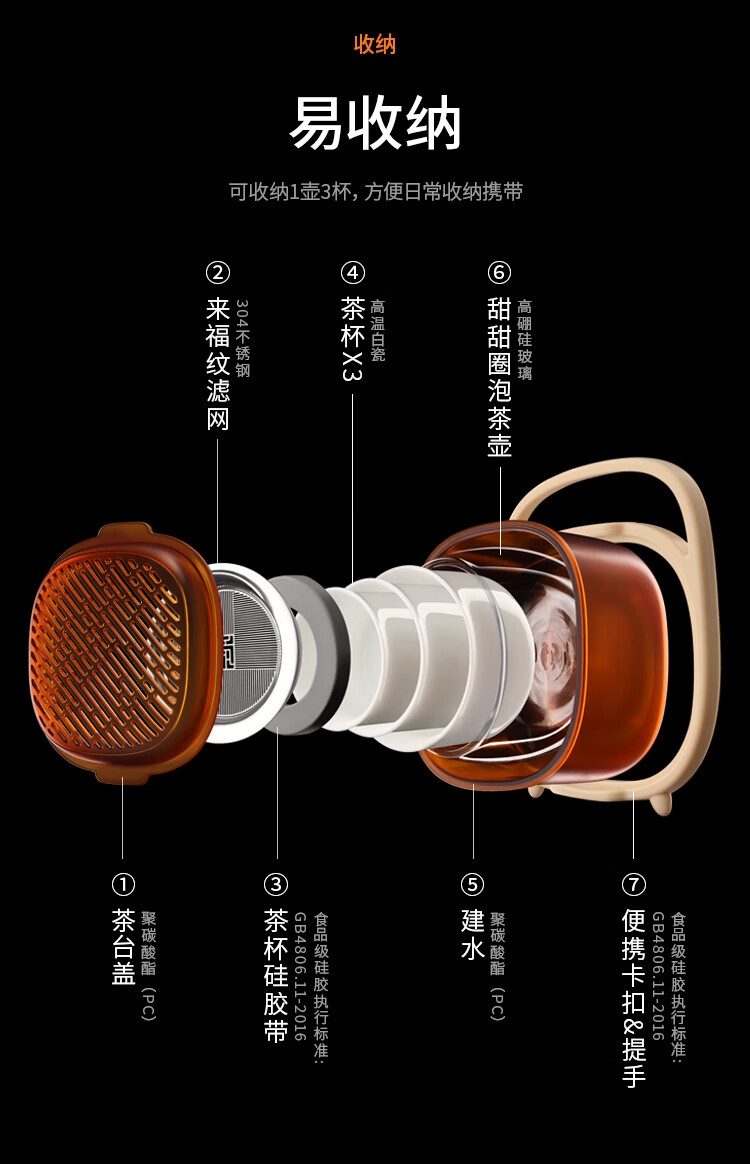 可收纳1壶3杯,方便日常收纳携带;栅格式沥水板镂空占比46.34%,秒速排,无积水;不仅热水冲泡无味道,久泡不开裂;而且坚固耐用