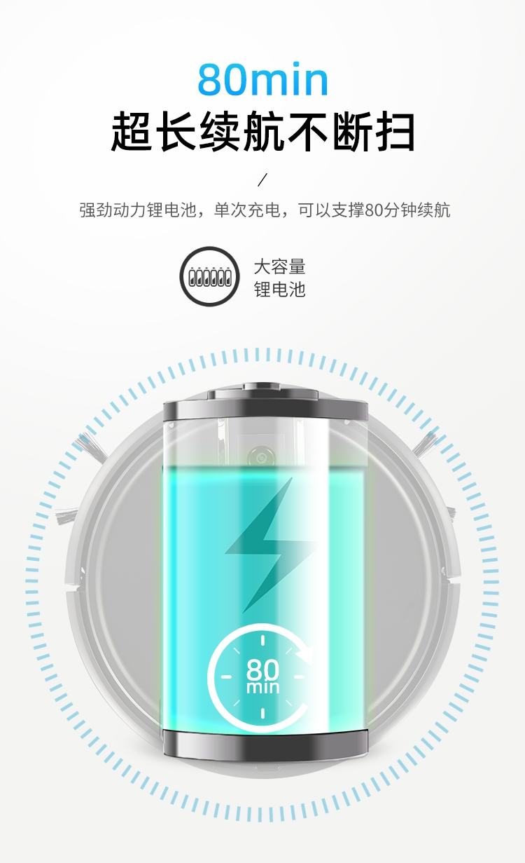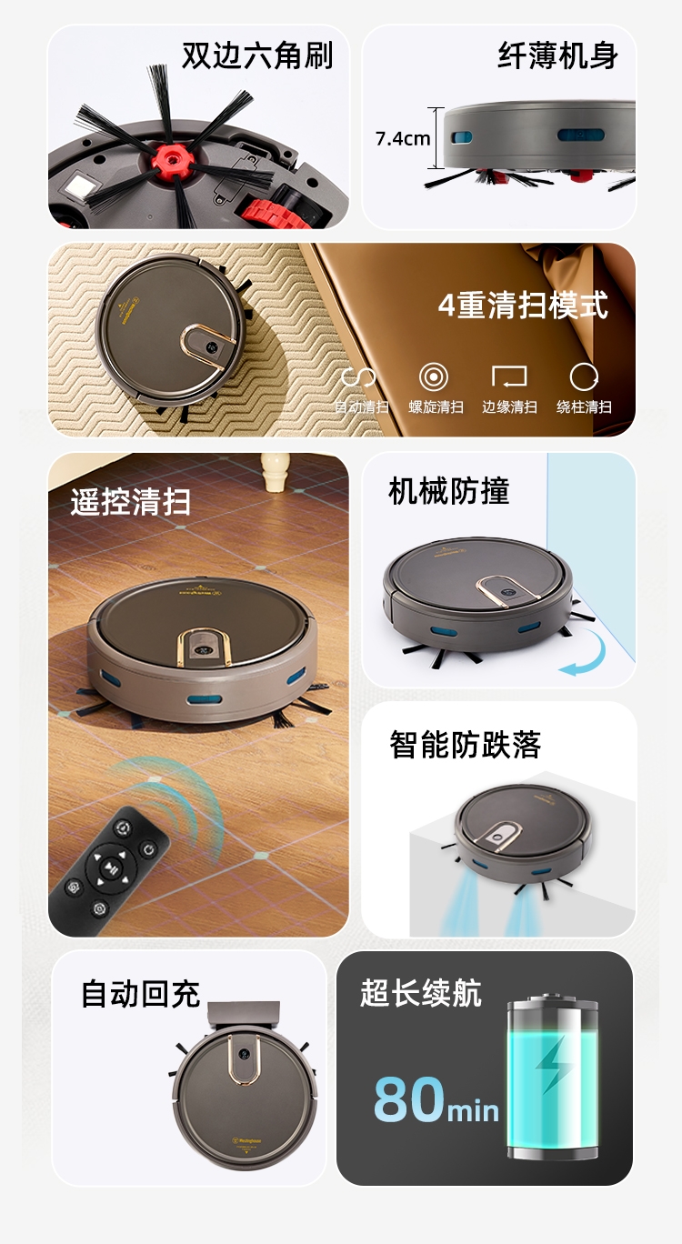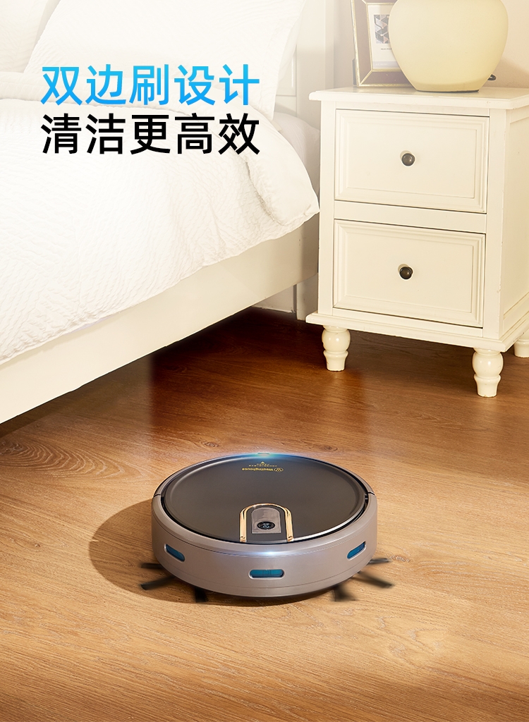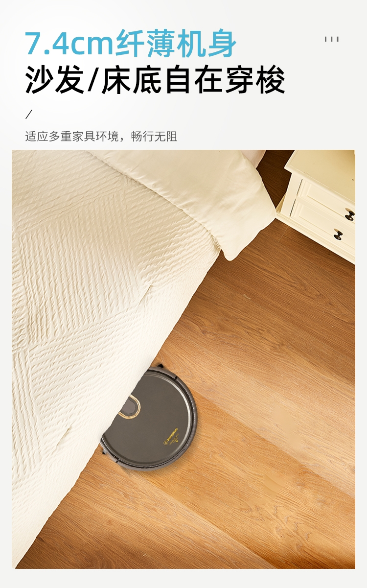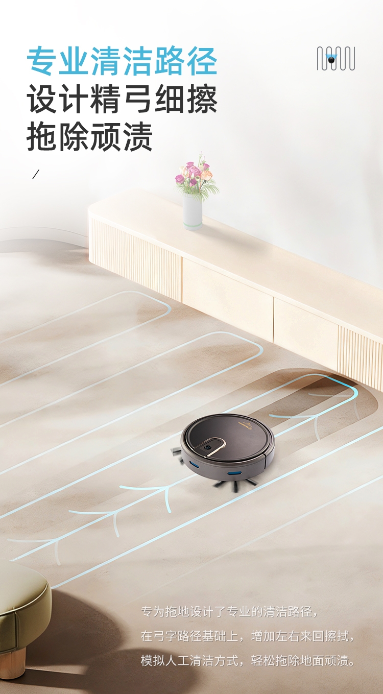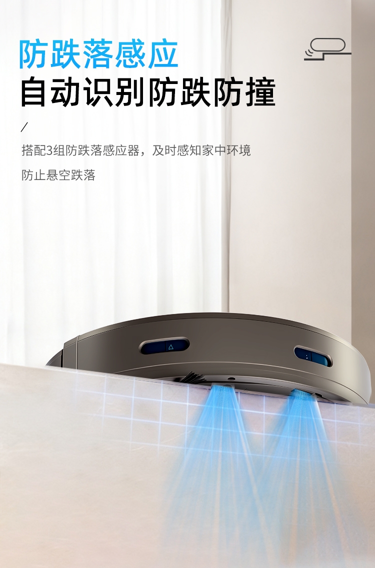 多重清扫模式,弓形路线规划,清洁更高效;;防跌落感应设计,适用复式楼层清洁;;彩盒+邮购盒双箱设计。