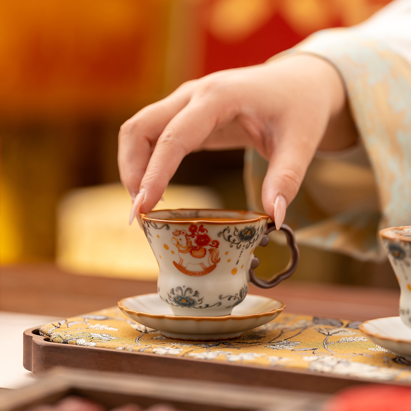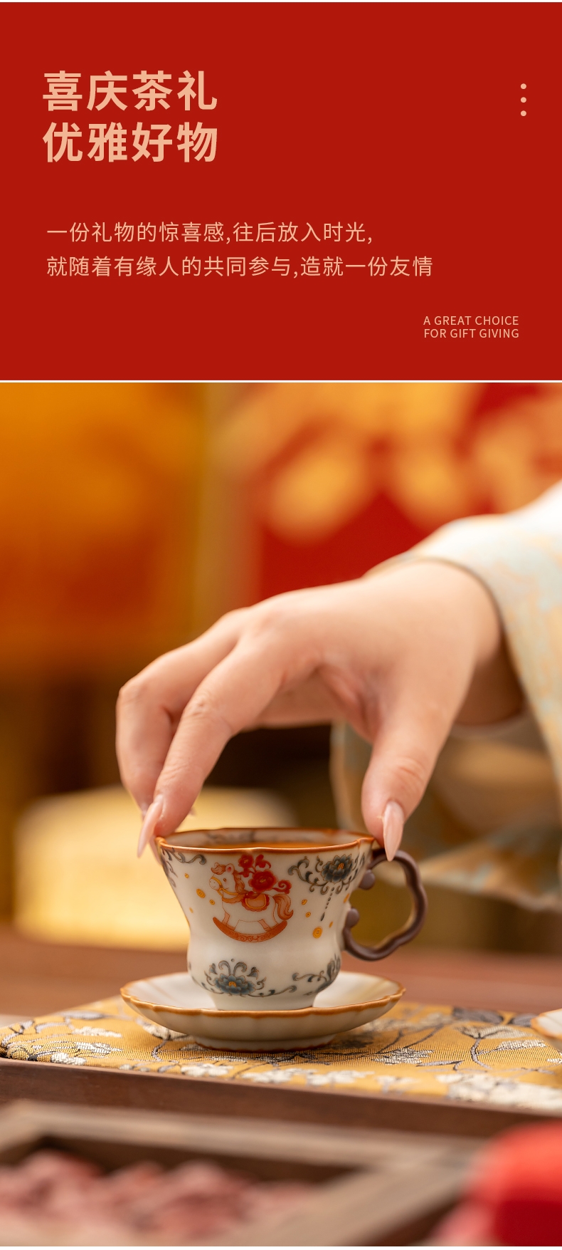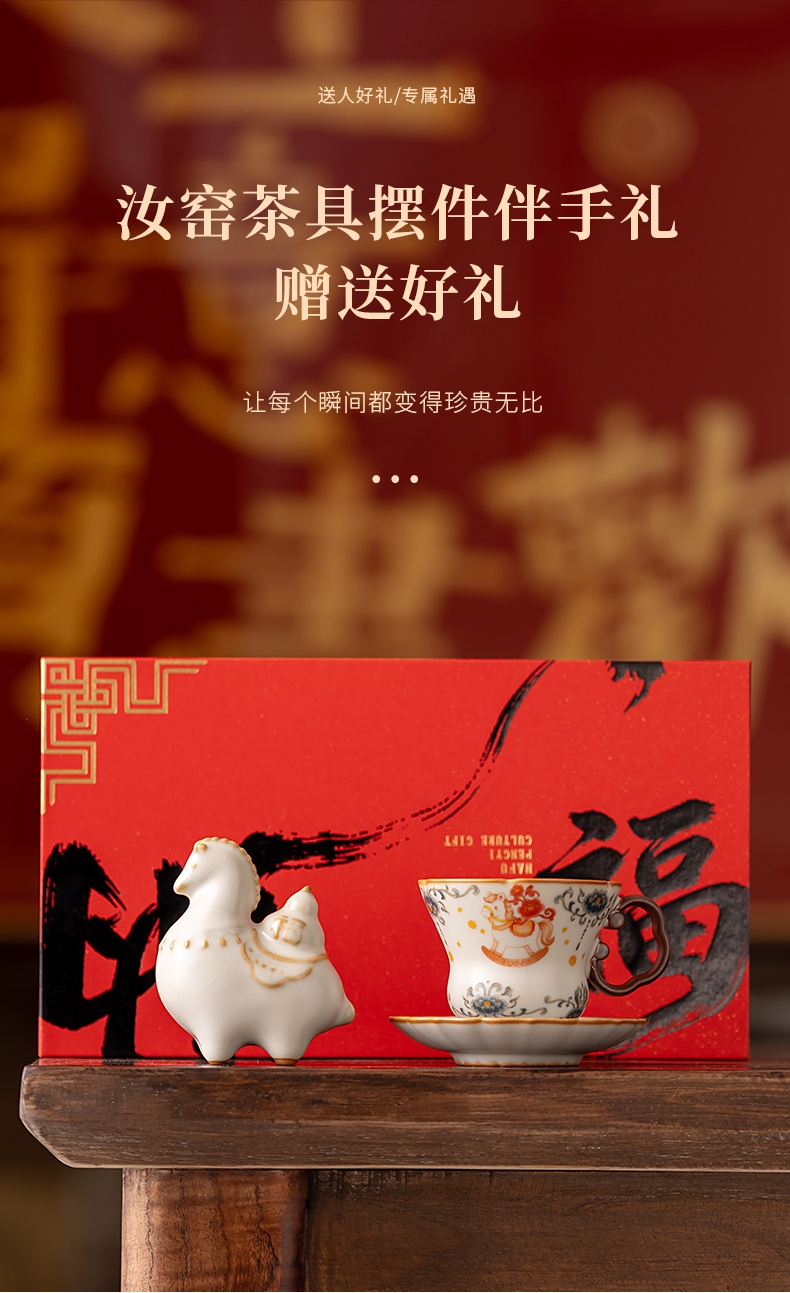 马年开门红礼品,马上有钱,马到成功杯子摆件套装;马背上葫芦造型,寓意福禄。亚黄汝瓷,玛瑙入釉,;家有千财万贯,不如汝窑一片。独家专利技术新品。