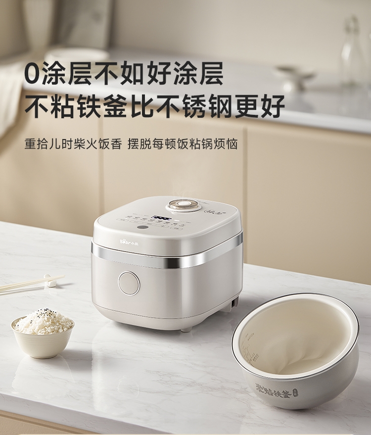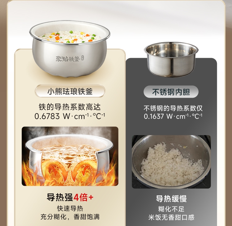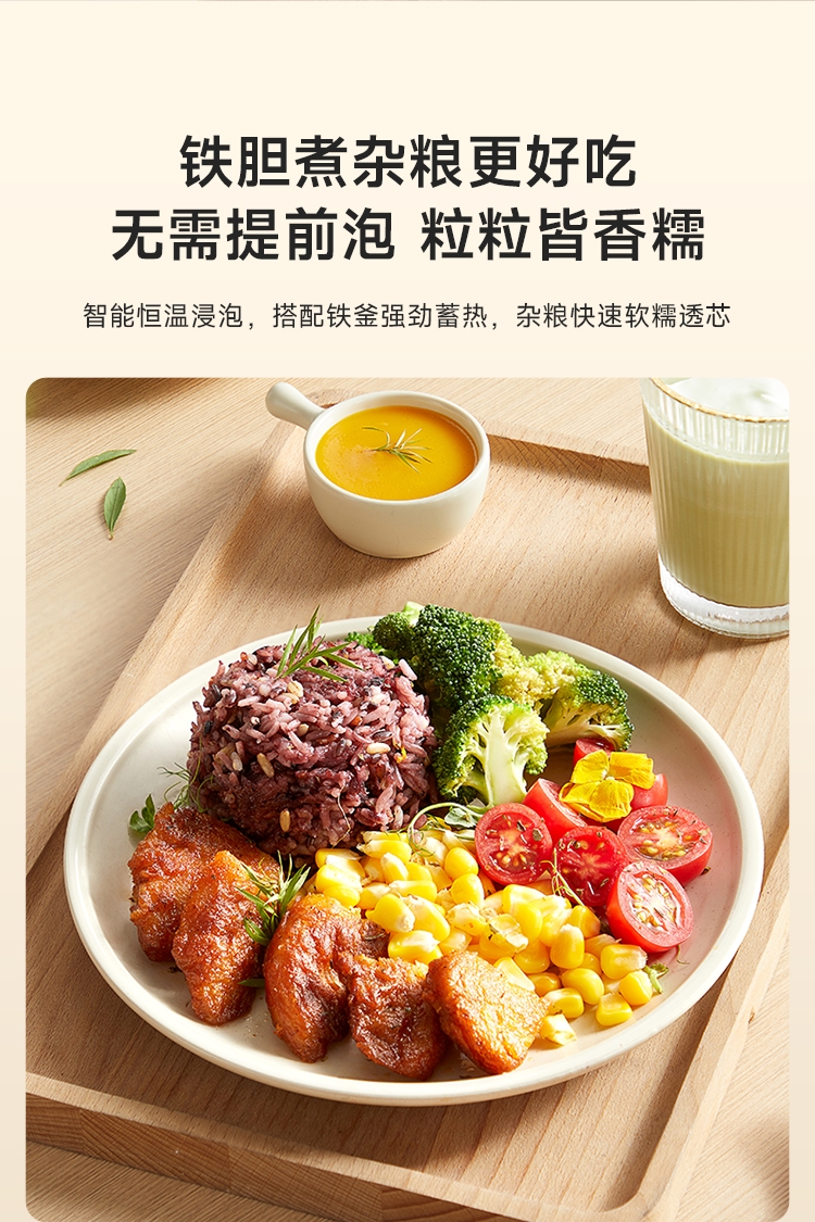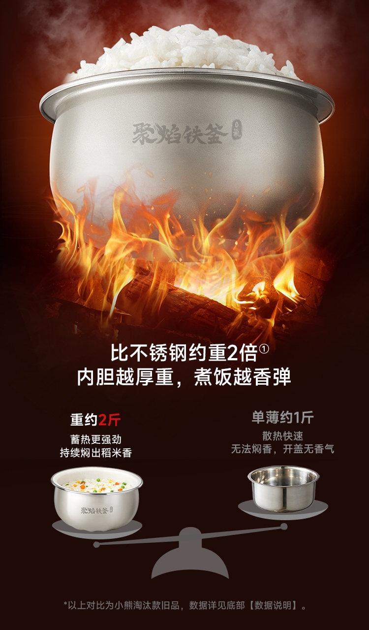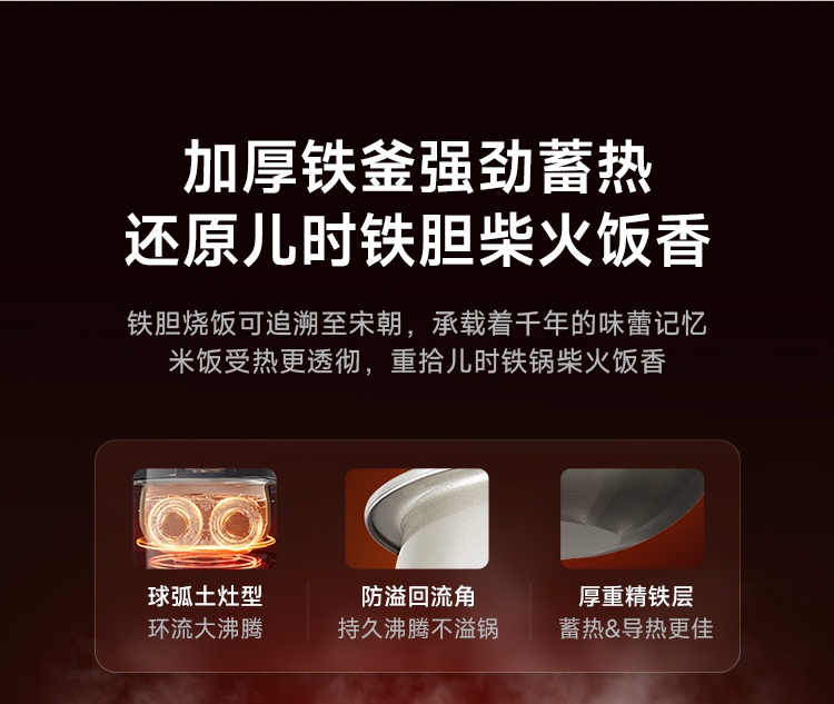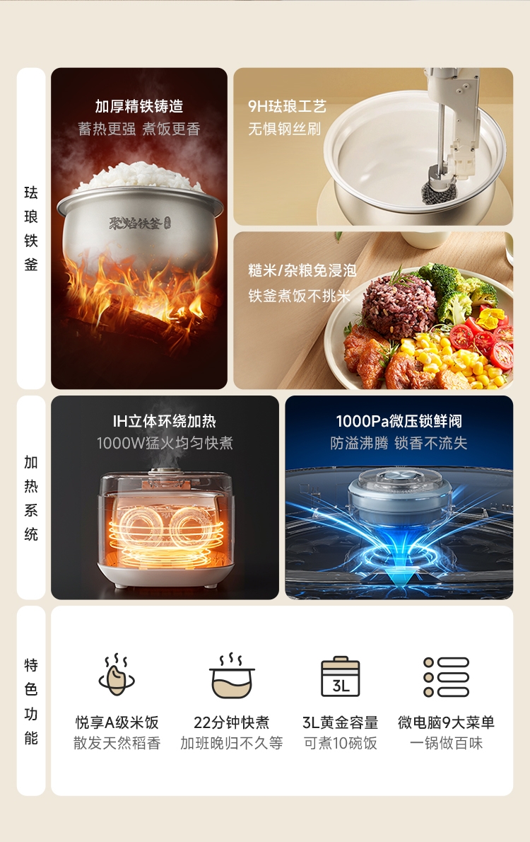 加厚精铁铸造,蓄热更强煮饭更香;9H珐琅工艺,无惧钢丝刷;糙米/杂粮免浸泡,铁釜煮饭不挑米