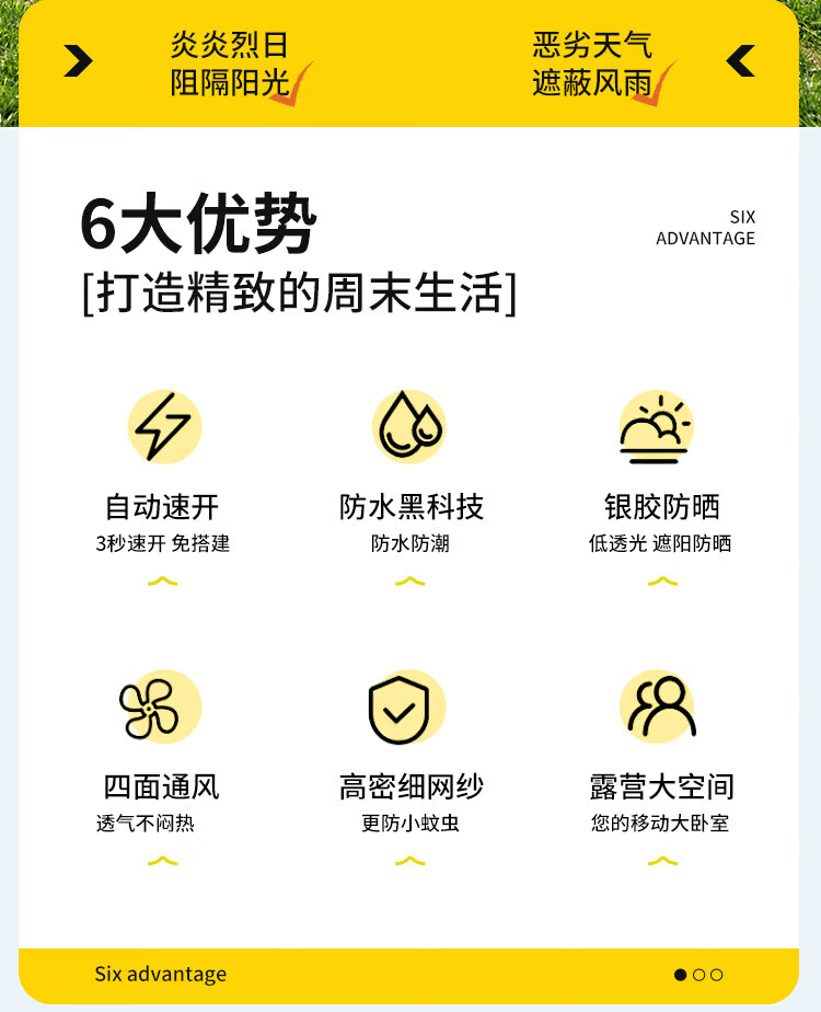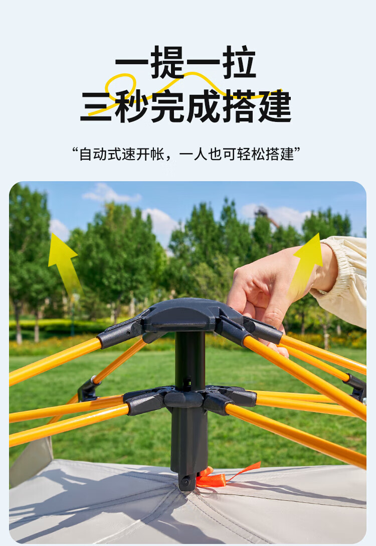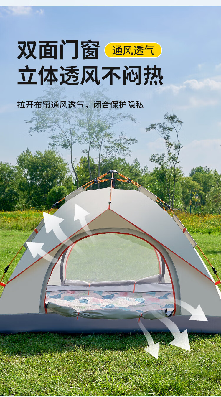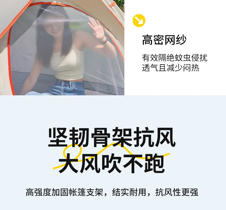 自动速开;透气不闷热、防水防潮;高密细网纱、遮阳防晒