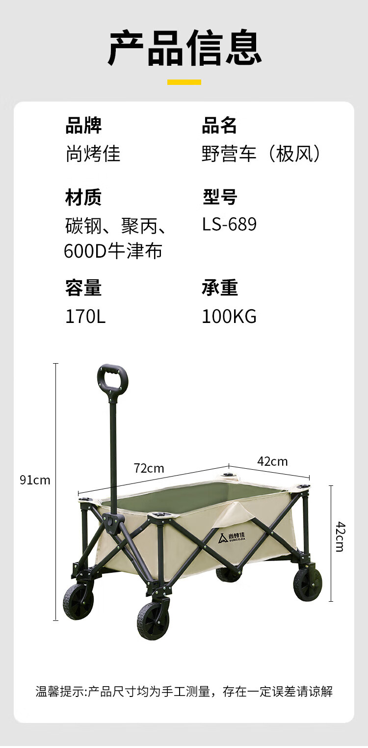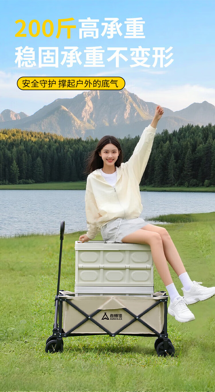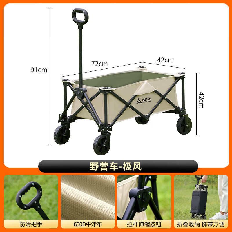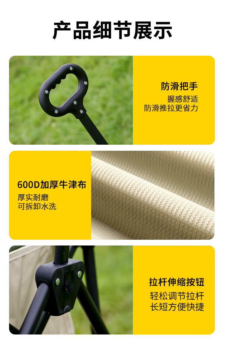 轻巧便携、碳钢支架;双层面料、万向车轮、四面聚拢;快速折叠、一车多用