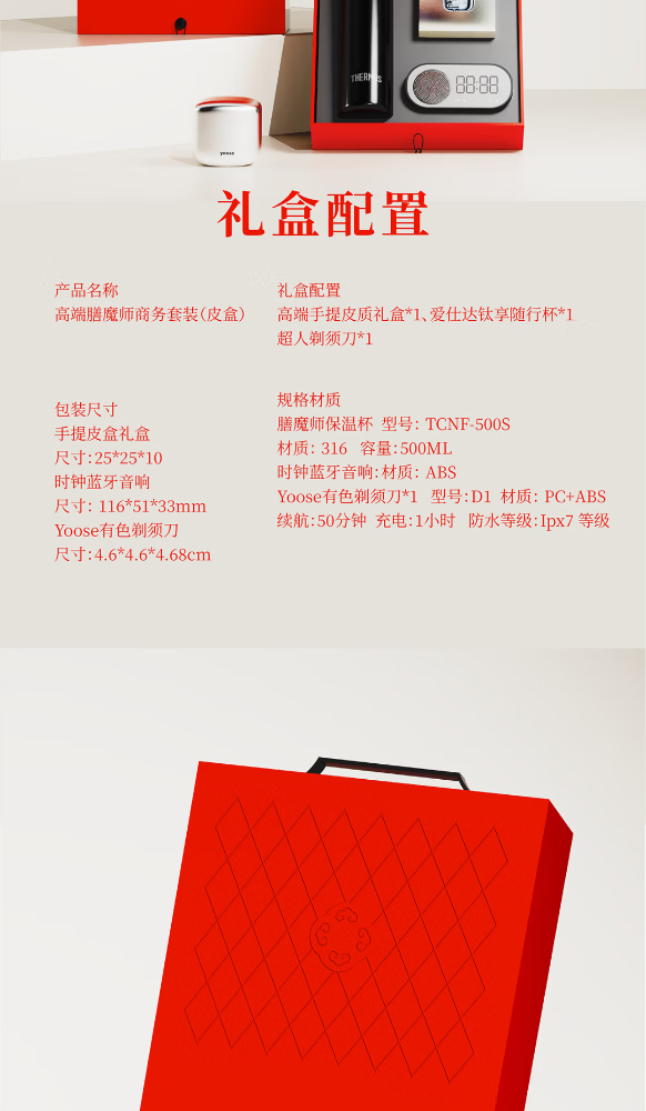 配置清单:高端手提皮质礼盒*1、膳魔师保温杯*1 时钟蓝牙音响*1 有色剃须刀*1