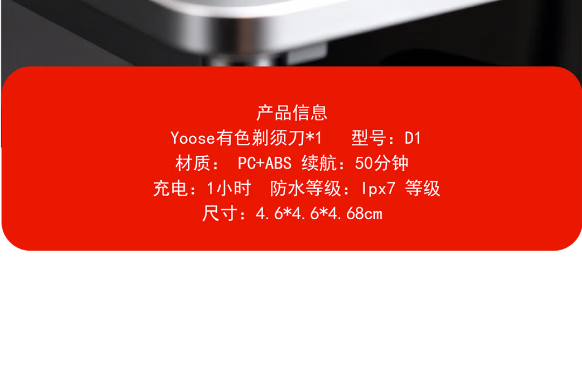 有色剃须刀:型号:D1 材质: PC+ABS 续航:50分钟 充电:1小时 防水等级:Ipx7 等级 尺寸:4.6*4.6*4.68cm