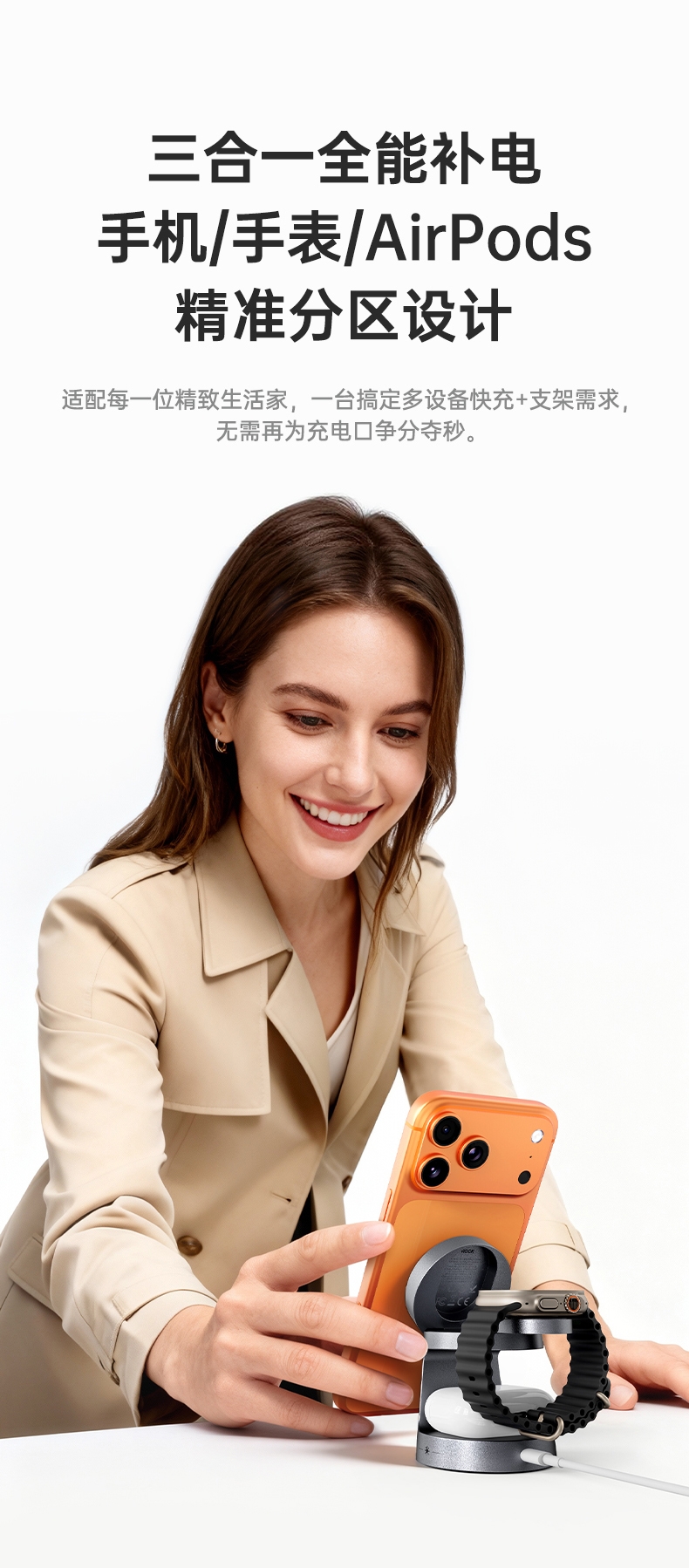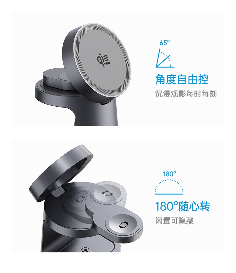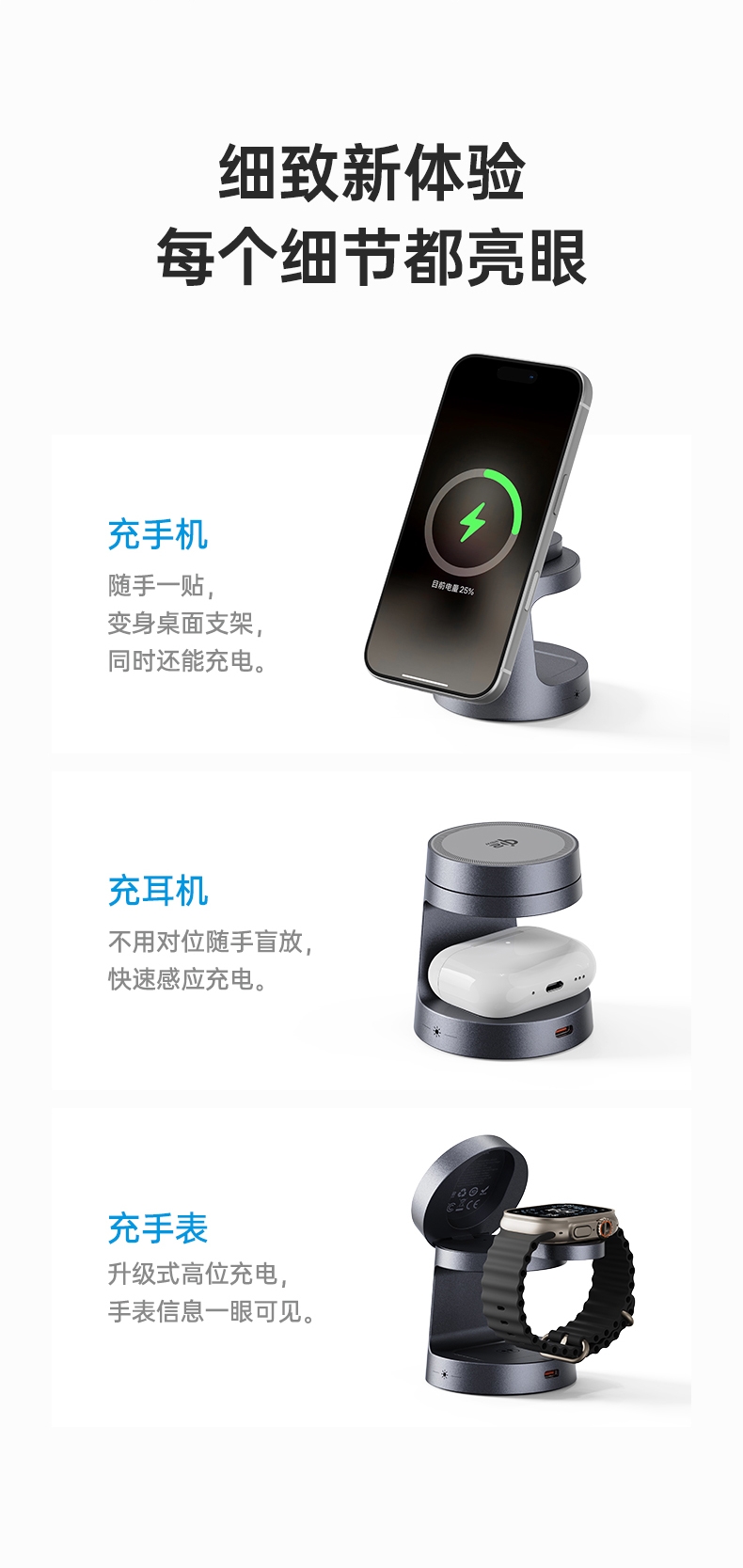 苹果全家桶、三合一+小夜灯Qi2.2 25W无线充;25W磁吸超充快充,低温控制,转换效率高,稳定性好;迷你台灯造型,带可调亮度小夜灯;通过严格可靠性测试温升/EMI插拔/结构拉力/跌落;金属烤漆工艺,外观精美,质感强烈;