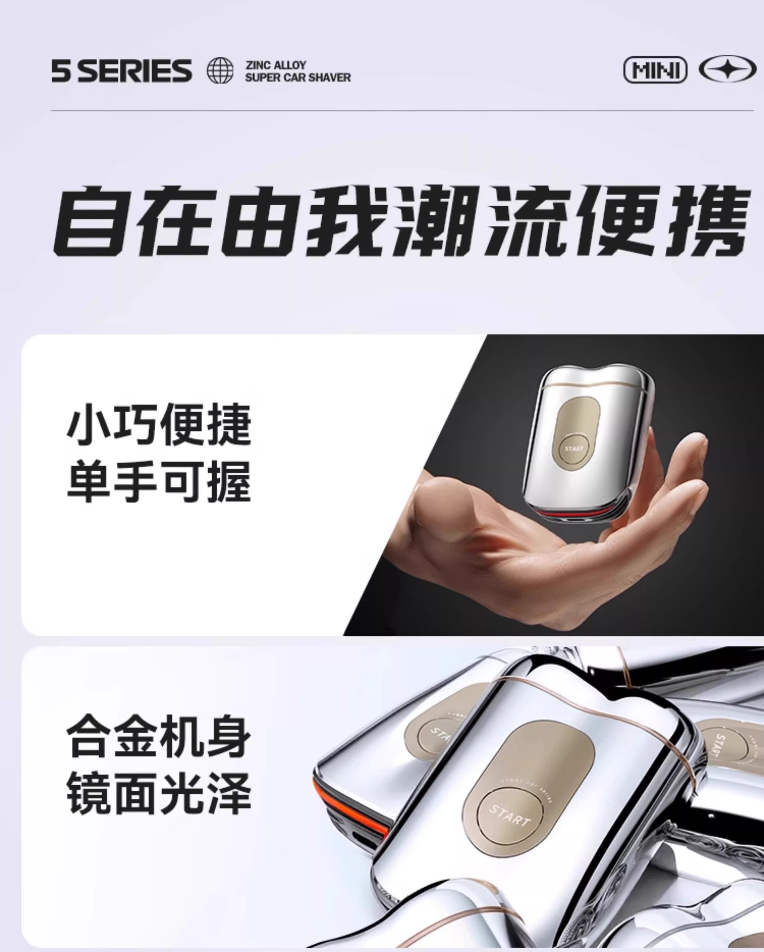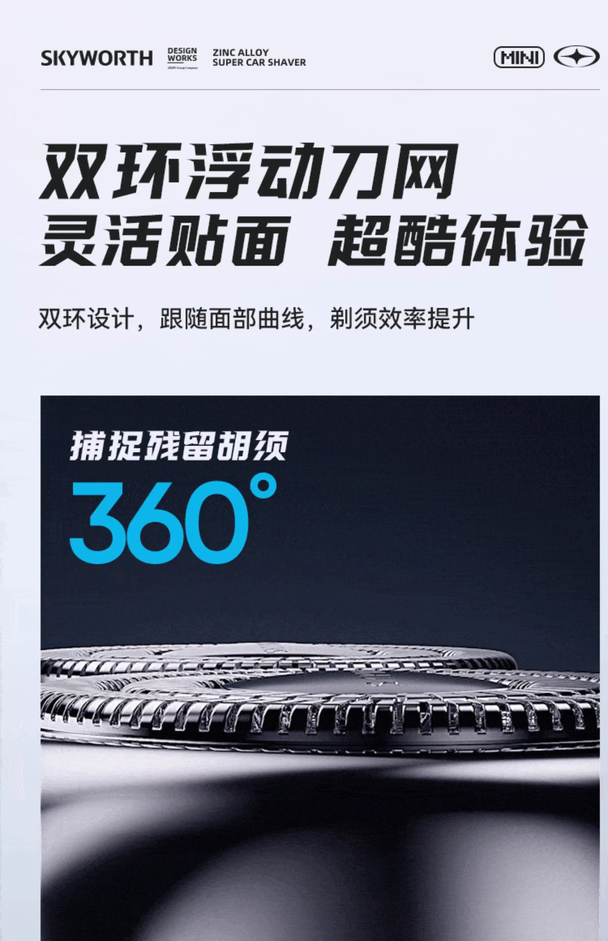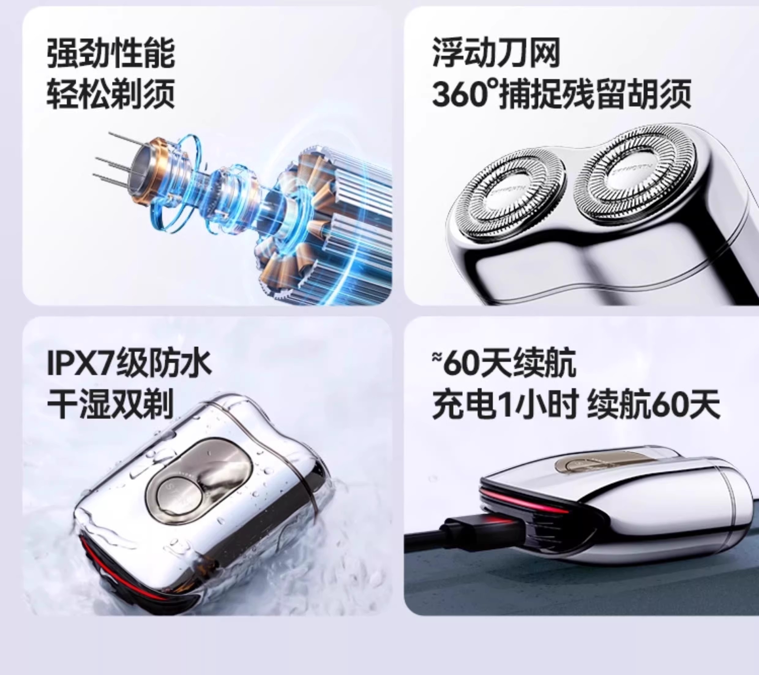 合金机身,镜面光泽 浮动刀网,360°捕捉残留胡须;PX7级防水,干湿双剃 充电一小时,续航60天;自研磨技术,刀片越用越锋利